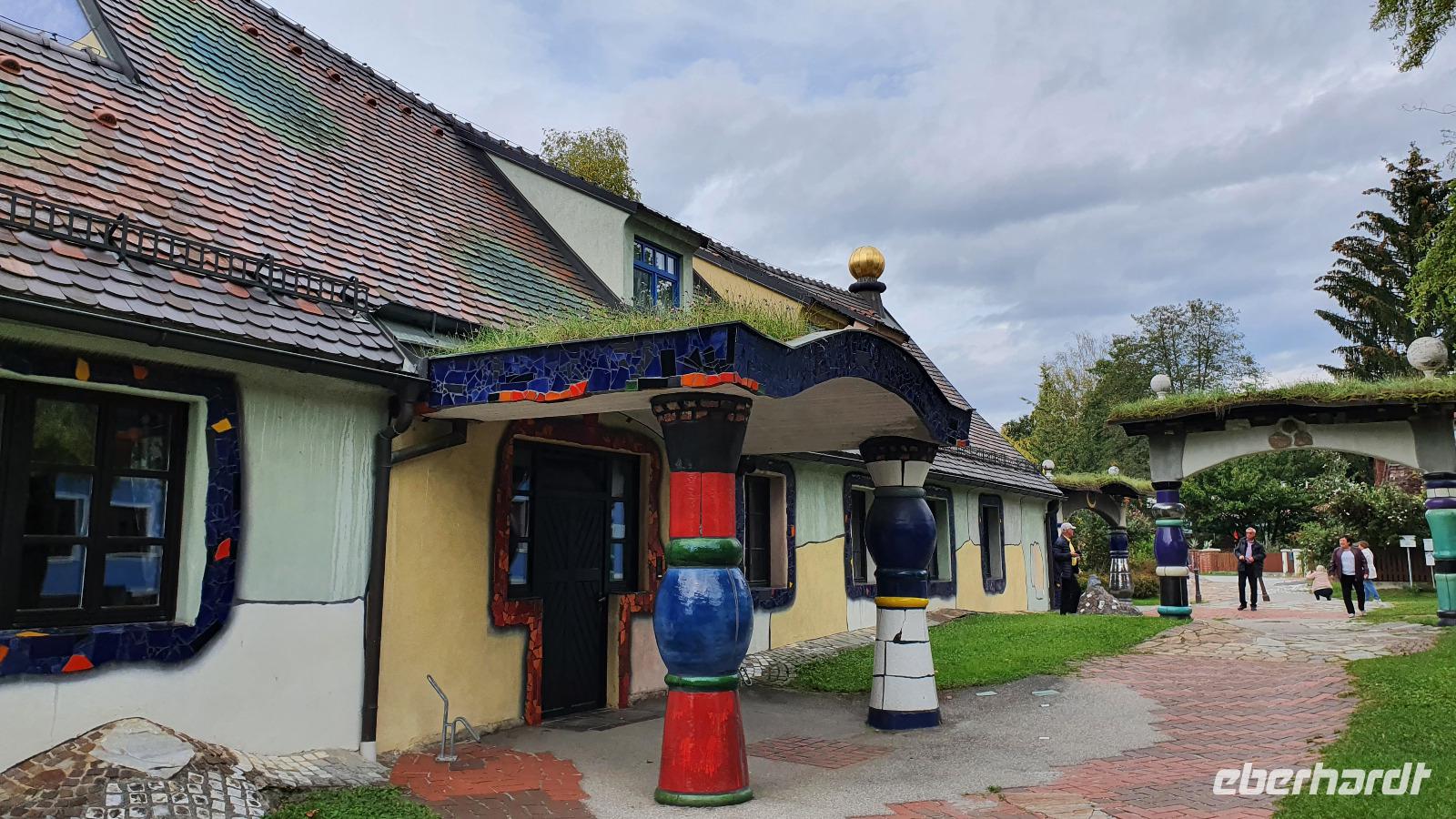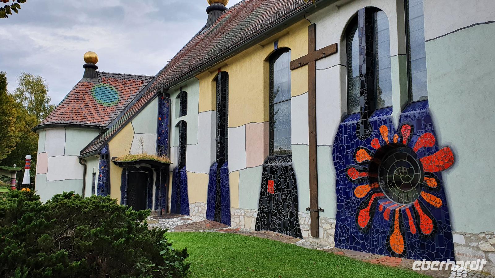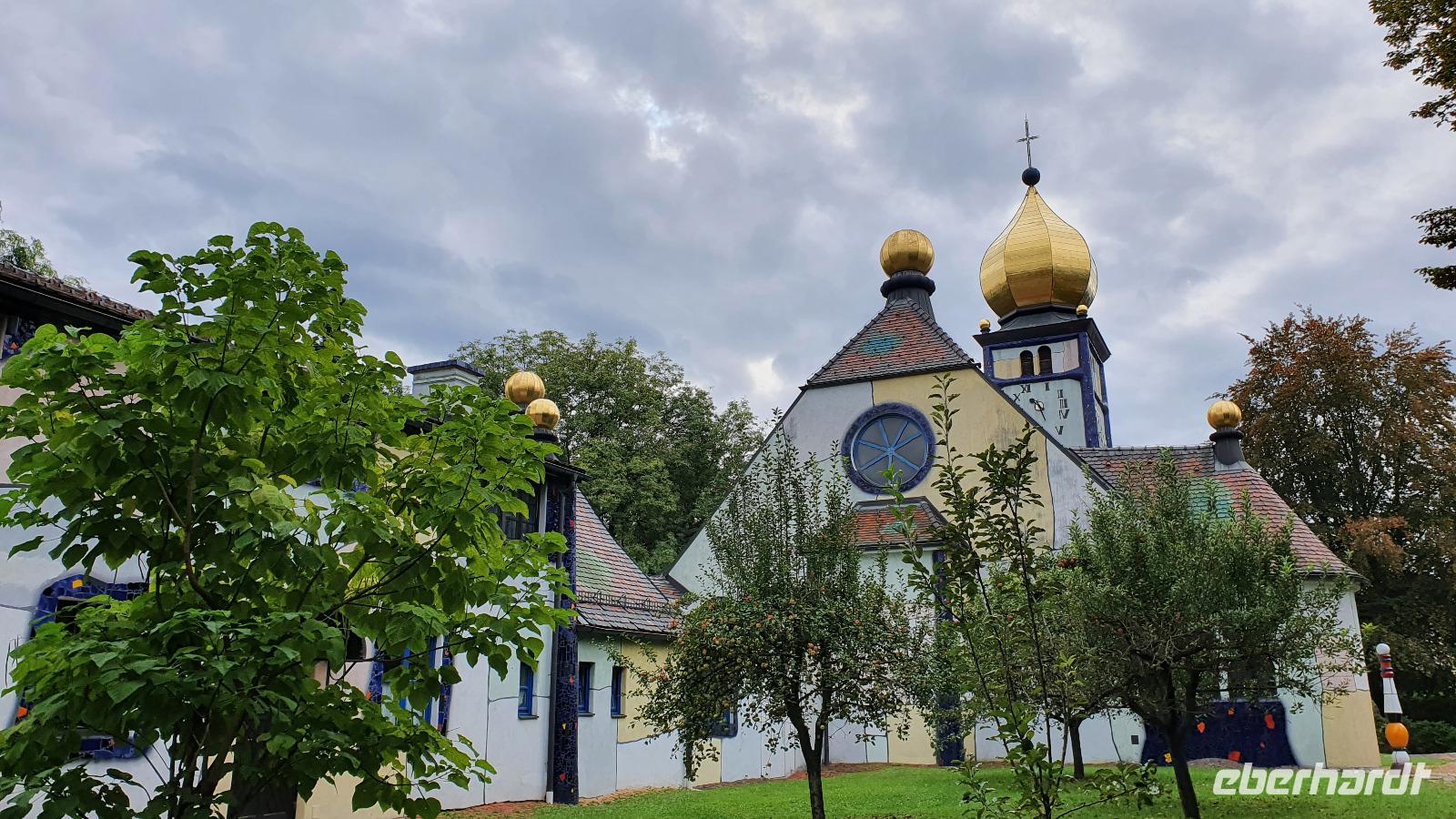 Friedensreich Hundertwasser hat hier 1987/88 die Kirche umgestaltet, starre Formen und Kanten aufgebrochen, abgerundet und mit viel Farbe ein leuchtendes, buntes, fröhliches Gotteshaus geschaffen. Um die Kirche herum stehen 12 Tore- sie symbolisieren die großen Religionen der Welt und auch die Atheisten haben ihr Tor. Uneben und hügelig sind die Wege- sie stehen für das Auf und Ab im Leben. Wir können einen Blick hinein werfen, auch das Altarbild stammt von Hundertwasser. Im Fenster am Taufbecken dann sein Markenzeichen: die Spirale. Mit jeder Menge Fotos im Gepäck machen wir uns auf den Weg nach Piber. Das