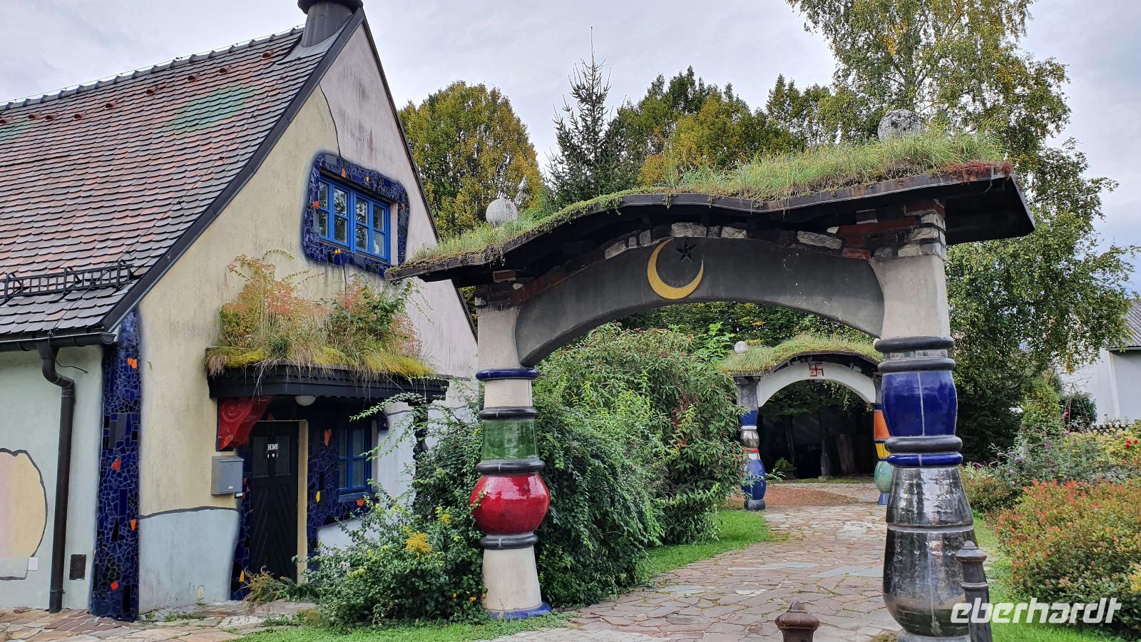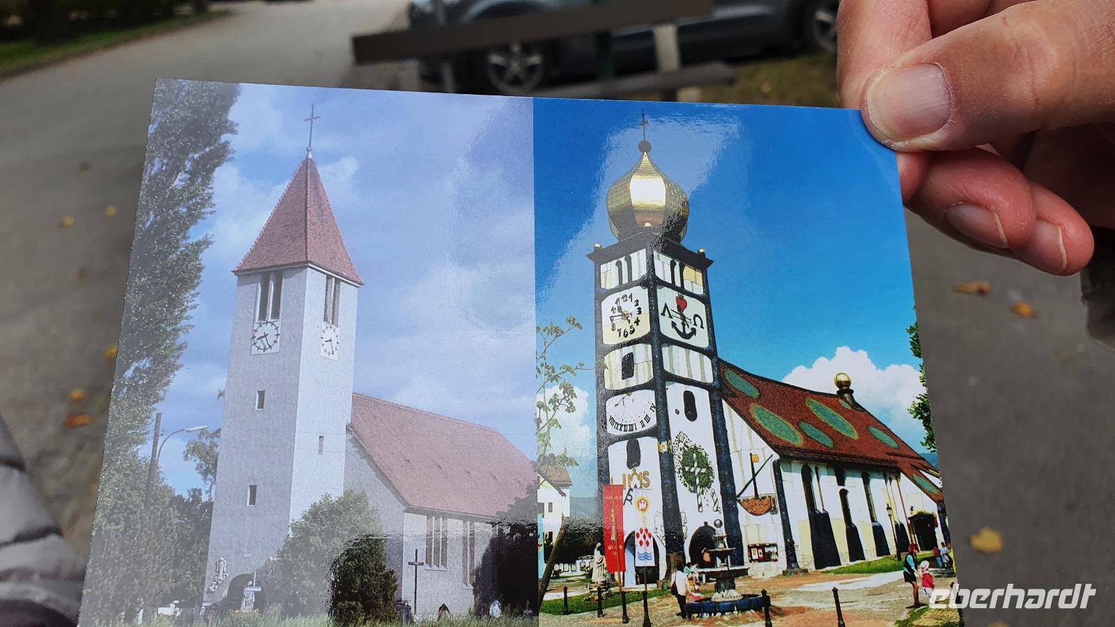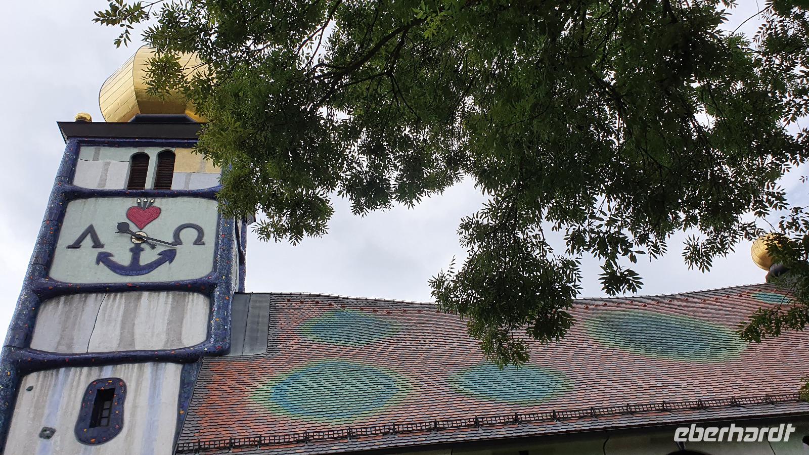 Friedensreich Hundertwasser hat hier 1987/88 die Kirche umgestaltet, starre Formen und Kanten aufgebrochen, abgerundet und mit viel Farbe ein leuchtendes, buntes, fröhliches Gotteshaus geschaffen. Um die Kirche herum stehen 12 Tore- sie symbolisieren die großen Religionen der Welt und auch die Atheisten haben ihr Tor. Uneben und hügelig sind die Wege- sie stehen für das Auf und Ab im Leben. Wir können einen Blick hinein werfen, auch das Altarbild stammt von Hundertwasser. Im Fenster am Taufbecken dann sein Markenzeichen: die Spirale. Mit jeder Menge Fotos im Gepäck machen wir uns auf den Weg nach Piber. Das