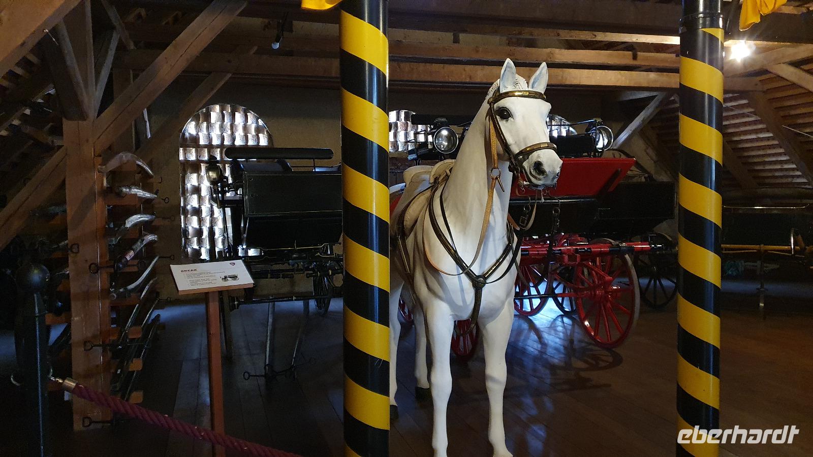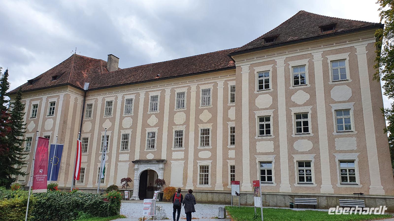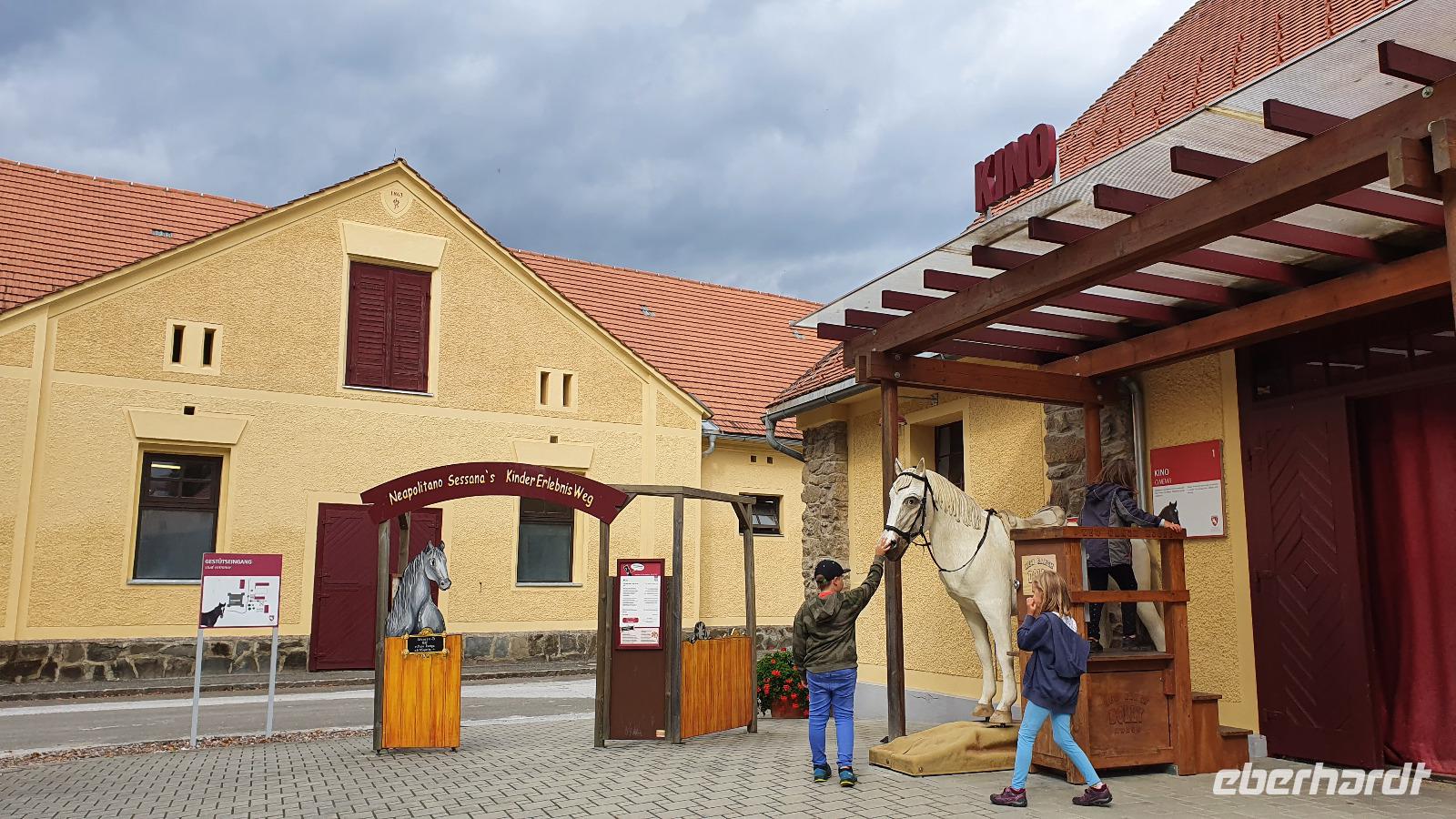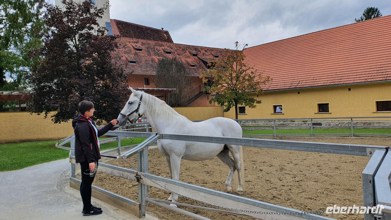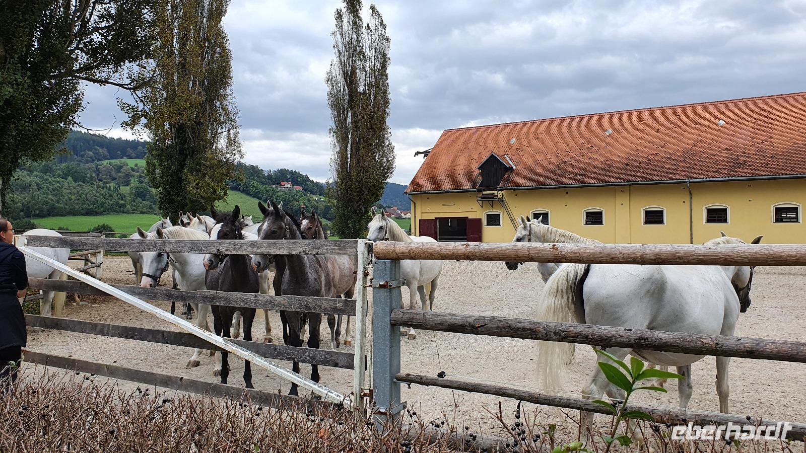 wartet auf uns, wir sind für eine Führung angemeldet. Hier werden Lipizzaner für die Spanische Hofreitschule in Wien gezüchtet und ausgebildet. Verena, unsere Gästeführerin, zeigt uns zuerst Mutterstuten mit ihrem Fohlen. Vieles erklärt sie uns und auch unsere Fragen beantwortet sie geduldig und ausführlich. Dann geht es weiter zu den "Schulkindern". Sie haben es gut, nur 1 Jahr Schule und schon haben sie ihren Abschluss. Dann entscheidet sich, welche Laufbahn sie einschlagen. Manche ziehen es vor, als Kutschpferde ausgebildet zu werden, dann können sie auch an Meisterschaften und internationalen Wettbewerben teilnehmen. Wir können auch den "Glücksbringer" sehen: ein schwarzer Lipizzaner. Im nächsten Stall dann wunderschöne schneeweiße Lipizzaner, sie haben "Arbeitsurlaub" von der Wiener Hofreitschule und sind als Deckhengste eingesetzt worden. Nun ist Zeit, individuell das Gestüt zu erkunden. Viele werfen einen Blick in das Kutschenmuseum und laufen zu den Koppeln im Gestüt. Gerade werden etliche Pferde in den Stall zurückgebracht. Wunderschöne Tiere laufen ganz nah an uns vorbei. Aber auch die interessanteste Zeit geht vorbei und am Bus treffen wir uns wieder. Wir haben ja noch etwas vor heute. Viele Gäste hatten sich zum Abschluß noch ein Glas Wein zusammen gewünscht und nach langem Suchen hatte ich tatsächlich noch einen Buschenschank für unsere doch größere Gruppe und unsere gewünschte Uhrzeit gefunden. Also fahren wir zum