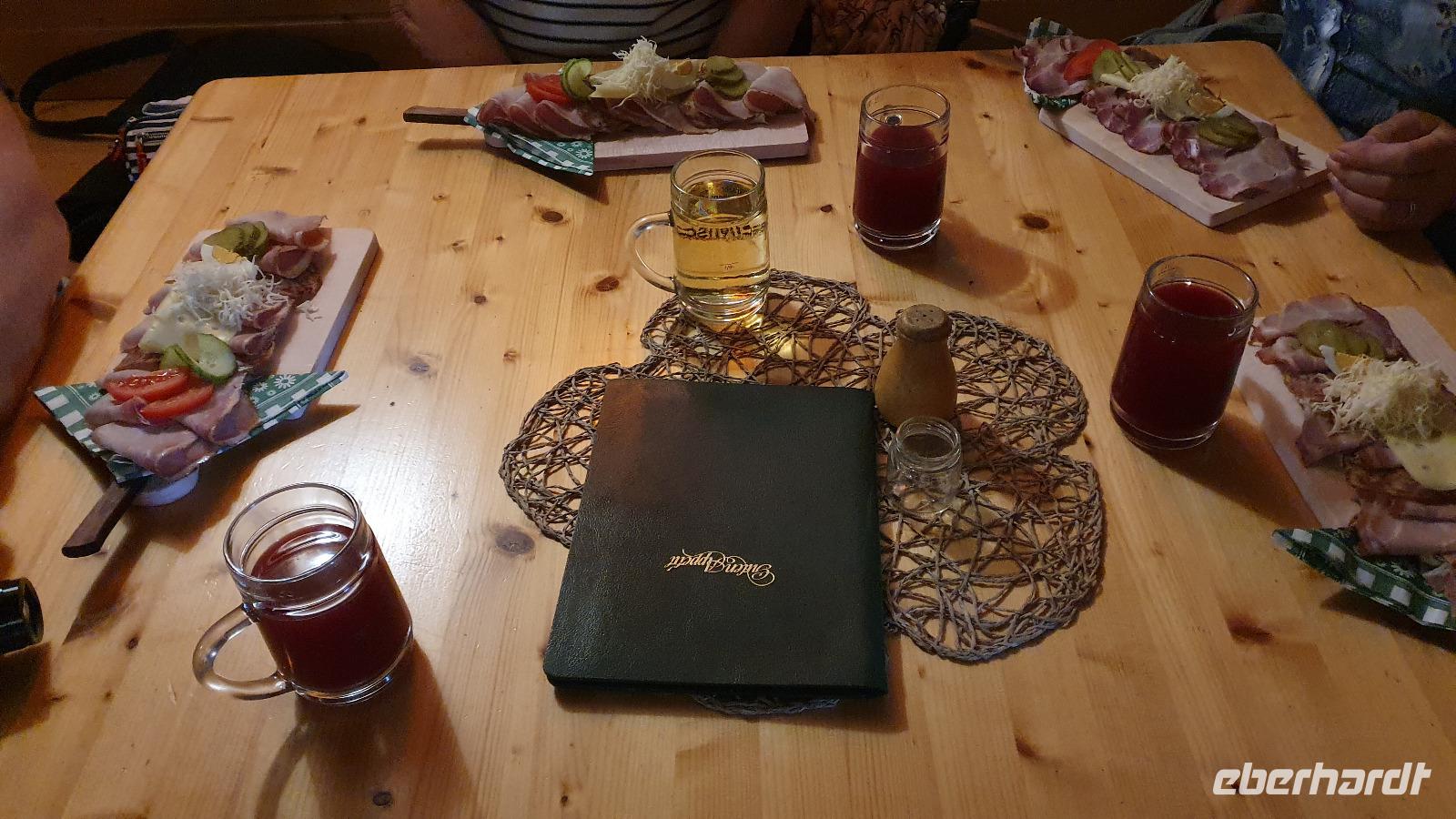 Den finden wir erst im zweiten Anlauf, macht aber nix. Noch im Bus gab´s die Schlüssel für die Zimmer und jeder hat noch ein wenig Zeit. Für erste Spaziergänge oder einfach ausruhen. Zum Abendessen treffen wir uns wieder, jeder hatte schon unterwegs sein Menü gewählt und so konnten wir in aller Ruhe erst einmal auf die nächsten Tage anstoßen. Dann ließen wir uns Kürbissuppe, Wiener Schnitzel oder Nudeln, Salate und zum Anschluss ein Tiramisu schmecken. Dann werden wir noch ganz offiziell vom Senior-Chef begrüßt und es gibt einen ganz speziellen Geist zum probieren. Viele sitzen noch beisammen, lernen sich kennen und genießen ein Gläschen Wein oder Saft. So klingt ein langer Tag aus.