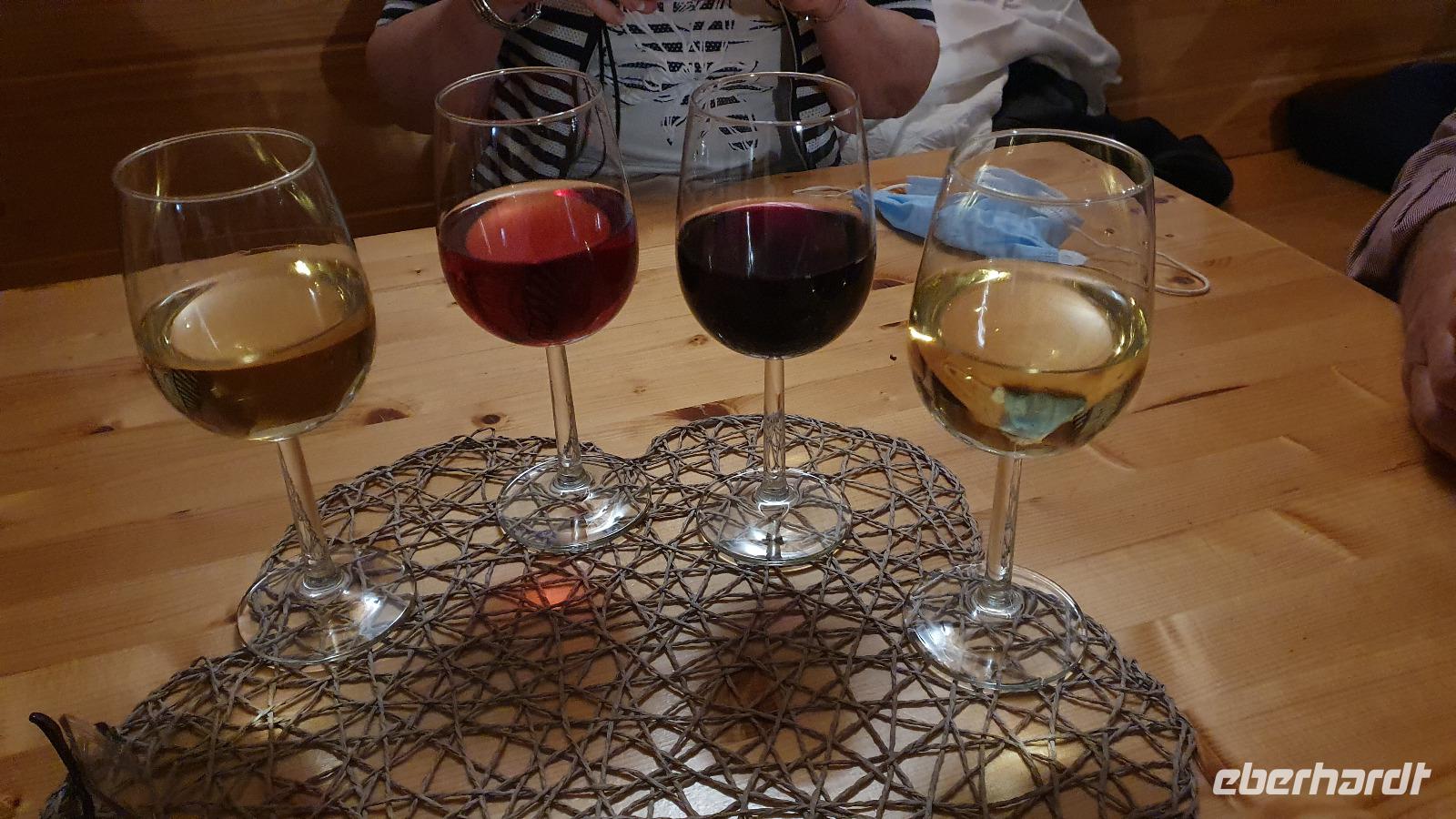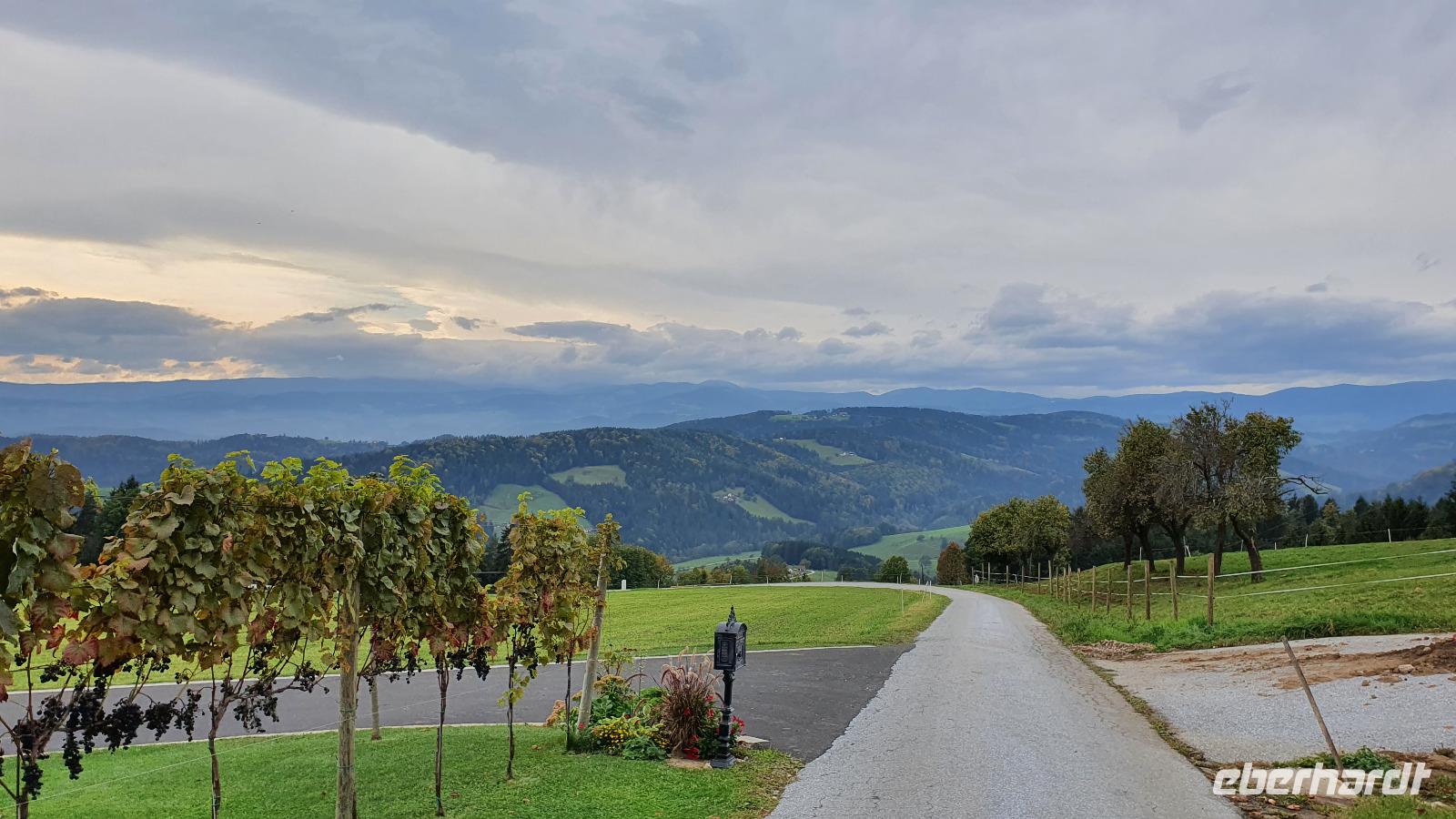 entlang. Schilcher ist ein Wein, der nur von hier kommt. Die Blaue Wildbacher Rebe sorgt für ein funkelndes Rot oder Rose im Glas, daher der Name Schilcher, manchmal auch Schiller. Junger Schilcher wird als Sturm bezeichnet und jetzt gerade war die Zeit des jungen Schilchers in den Buschenschänken und Wirtsstuben. Angebaut wird die Rebe an den Hängen der Koralpen, im weststeirischen Hügelland. Mit seinem hohen Säureanteil ist er nicht jedermanns Geschmack, aber wir hatten ja gelernt: wenn ein Wein uns nicht schmeckt- dann ist er interessant. Papst Pius VI. war da deutlicher, er meinte 1782: "Sie haben Uns einen rosaroten Essig vorgesetzt, den sie Schilcher nannten." Wie auch immer- wir jedenfalls genossen die Landschaft, den Anblick der Weinhänge, Berge und Täler. Relativ spät waren wir heute im Hotel zurück so daß wir uns kurz darauf zum Abendessen trafen. Wieder ließen wir uns ein leckeres 3-Gänge-Menü schmecken und den Tag bei einem Glas Wein ausklingen.