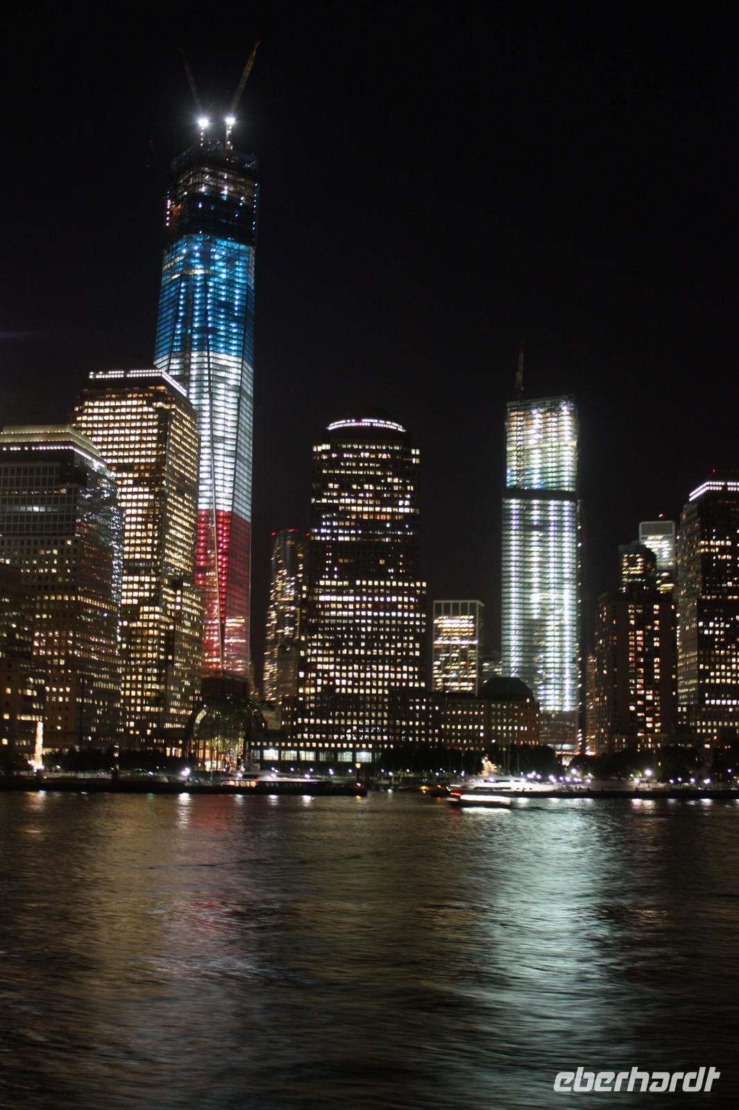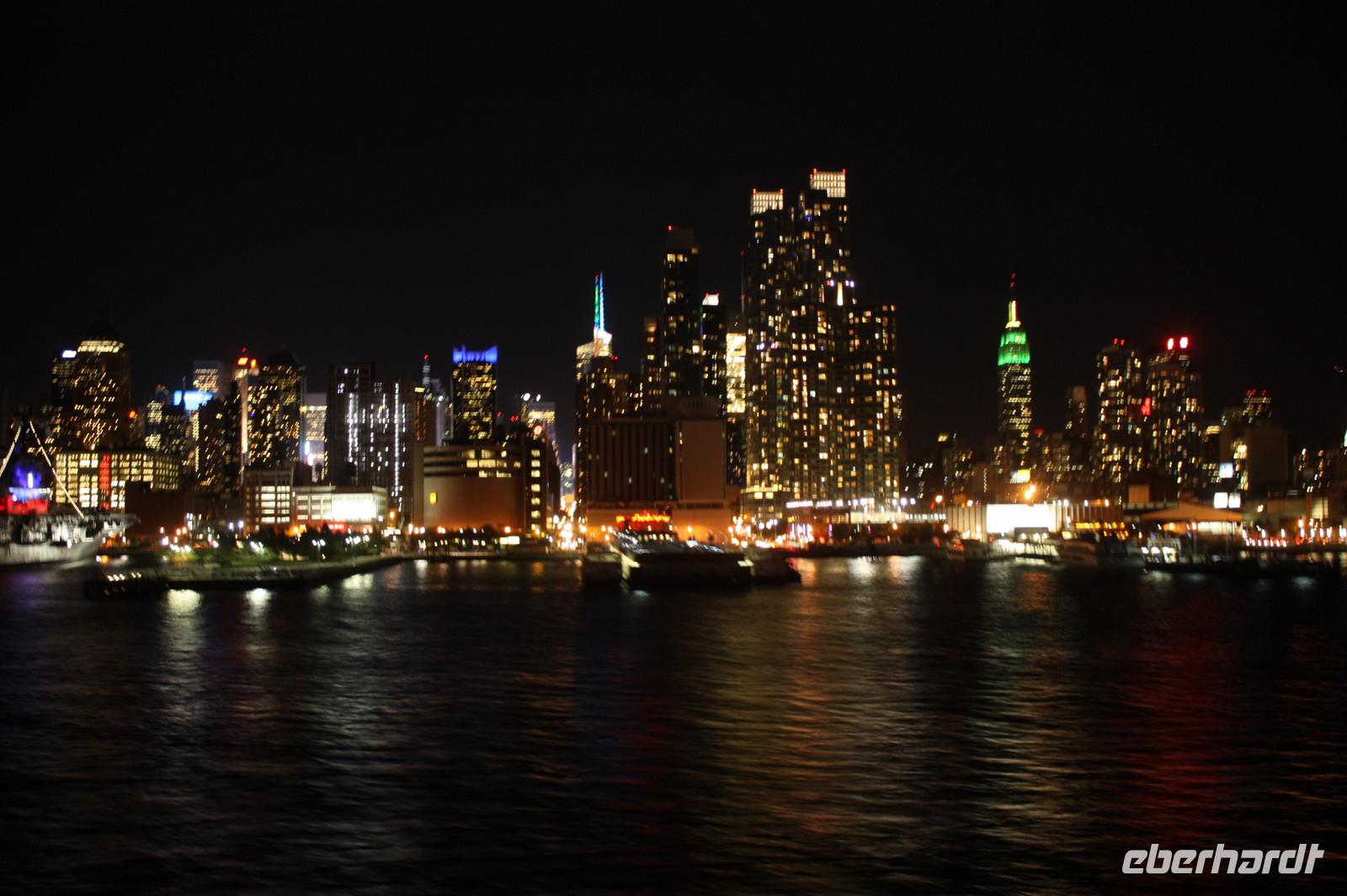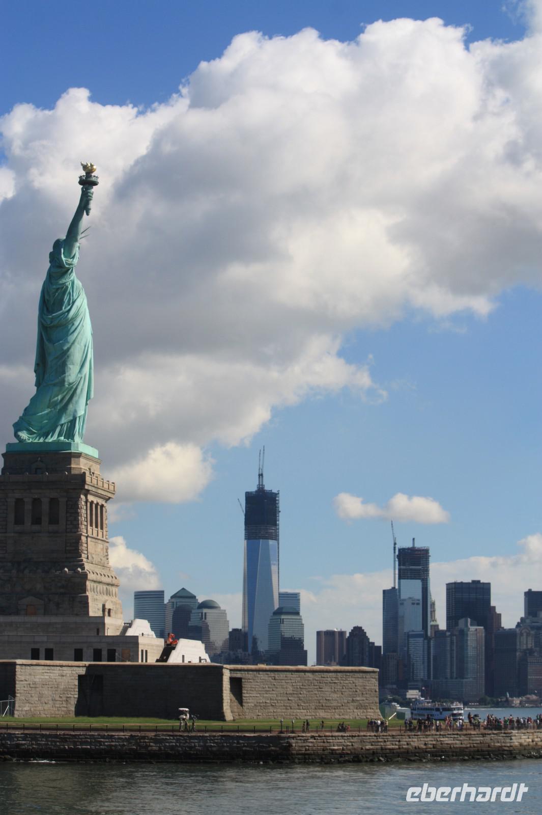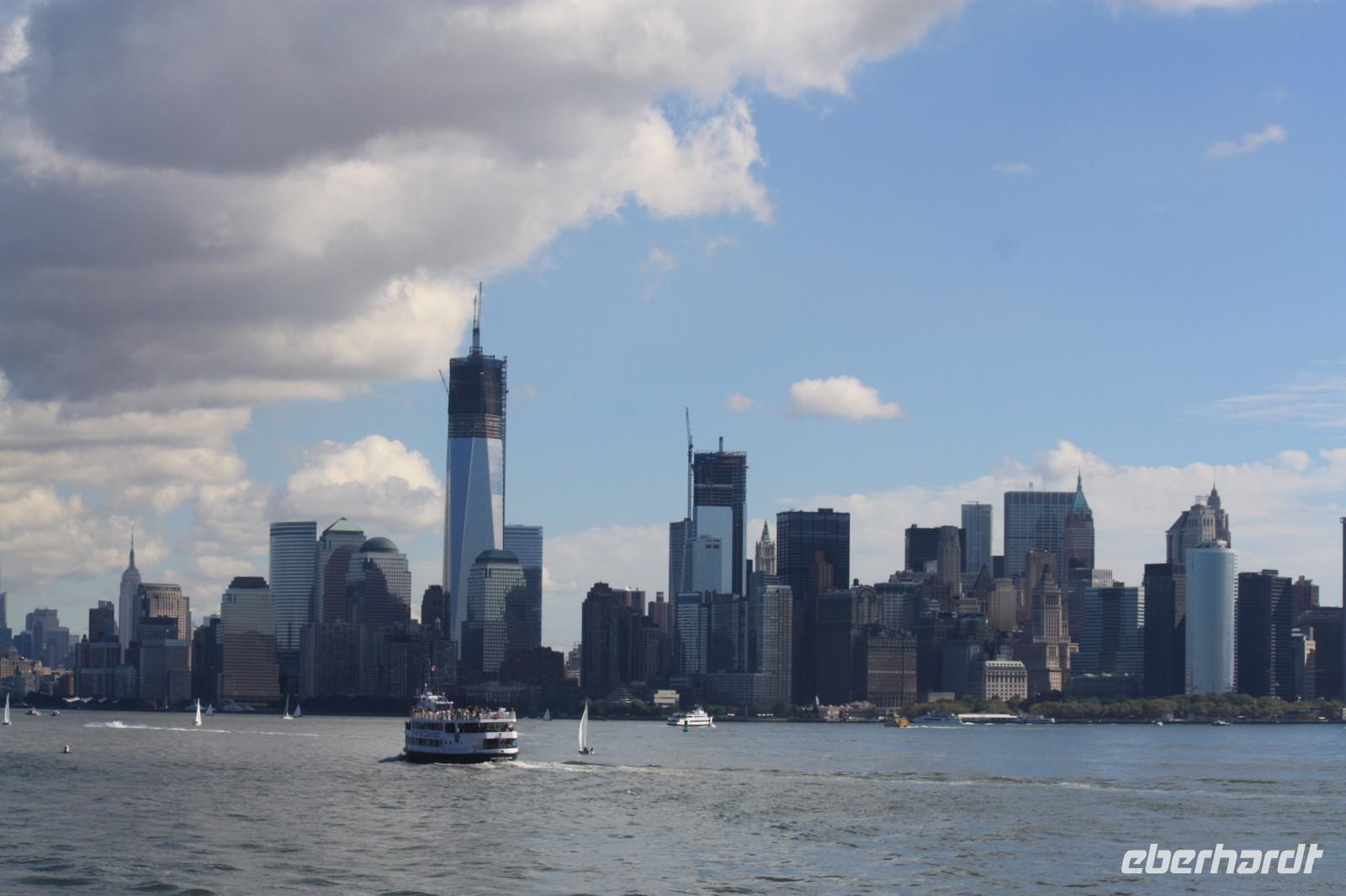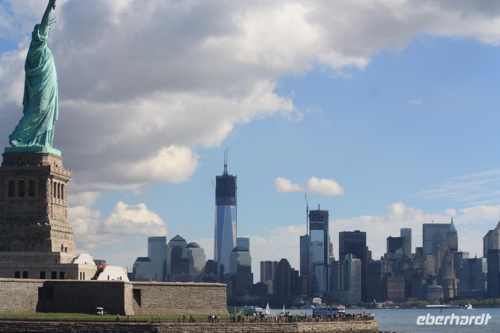 Die erste Nacht auf Schiff liegt hinter uns. Ein sonniger Montag in New York erwartet uns. 9 Eberhardt Gäste begleite ich, Reisebegleitung Nicole Hickmann, auf dem heutigen AIDAAusflug "Big Apple: New York, New York". Ein Ganztagesausflug liegt vor uns mit teils schon Bekanntem, teils Neuem. Toni, unser heutiger örtlicher Reiseleiter erfüllt wahrlich das Klischee "Klein aber oho ..." Mit Wortwitz und Charme bringt uns der gebürtige Frankfurter, einstiger Vertriebener und jetziger Wahl-New Yorker seine Stadt bei. Per Bus fahren wir auf ähnlicher Route vom Vortag, den Broadway entlang, zum West Central Park, Harlem und die 5th Avenue entlang zum Rockefeller Centre. Von oben schauen wir nun bei Tag auf die Millionenmetropole. Im Anschluss gönnen wir uns eine Verschnaufpause am South Street Seaport unterhalb der Brooklyn Bridge und folgen der Versuchung von Hot Dog, Hamburger & Co. Das letzte Drittel unseres Tagesausfluges führt uns noch zur Kirche St. Paul unweit Ground Zeros, dem Standort der Zwillingstürme bis 2001. One World Tower erhebt sich an deren Stelle 1776 Fuß über der Gedenkstätte. Mit dem Rucksack gefüllt voller Erlebnisse kehren wir zurück zur AIDA. Krönender Abschluss des Tages ist die Ausfahrt aus New York. Gemütlich sitzen wir in der Ocean Bar, versteckt auf Deck 7 ist sie wahrlich ein Geheimtipp. Bei Americano, Tequila Sunrise und Hugo laufen wir aus, vorbei an einmaliger Kulisse.