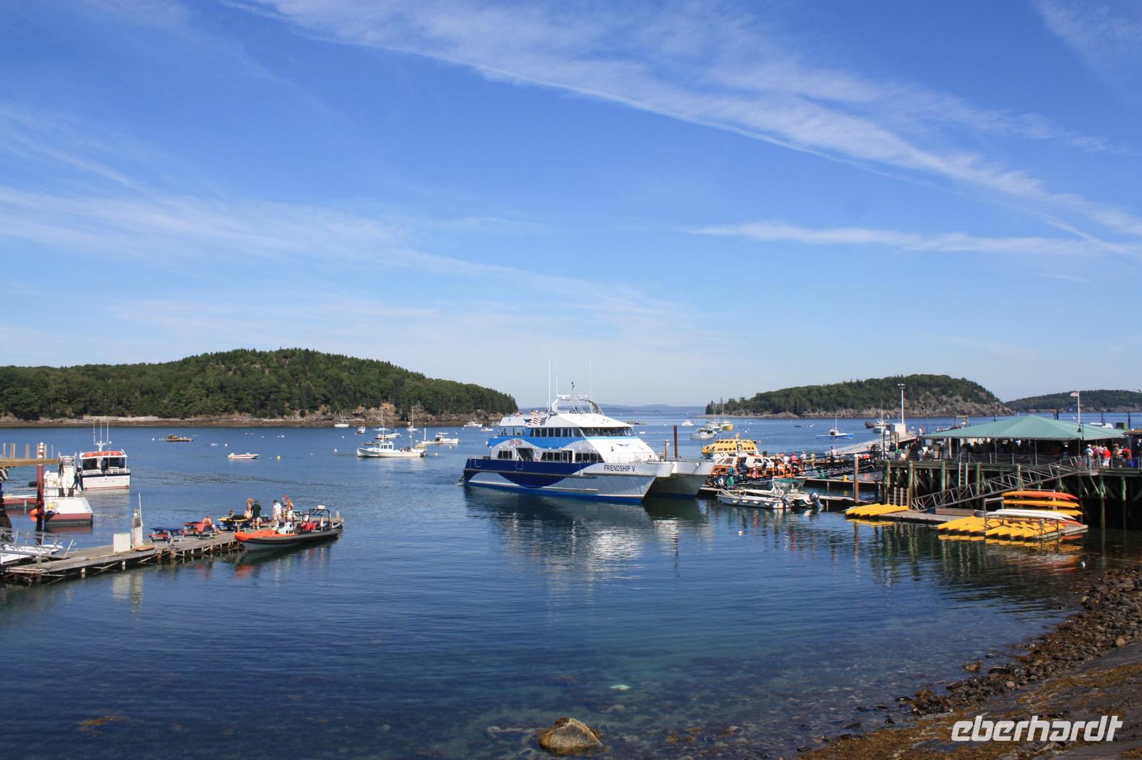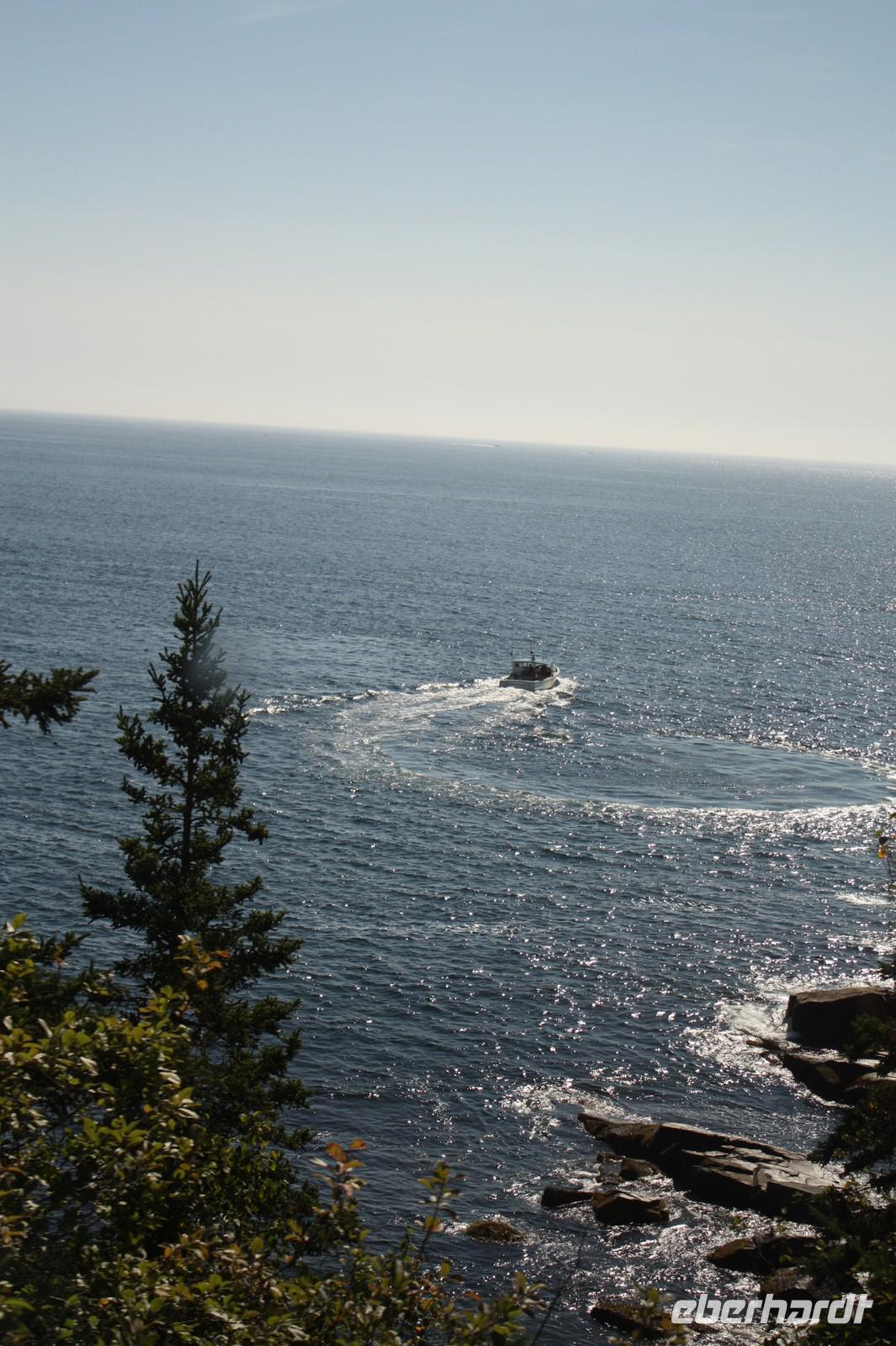Bar Harbor, eine gelungene Abwechslung nach den Metropolen New York und Boston. Die Landschaft ist malerisch. Fern von Hektik und Stress erwarten uns Lobsterfischer im beschaulichen Örtchen. Wir liegen auf Reede und tendern an Land. Mit 6 Gästen unternehme ich heute den Ausflug Arcadia-Nationalpark mit anschließendem Lobsteressen. Allmählich setzt die Laubfärbung an, wenngleich es Mitte September noch zu früh ist für die vielschichtigen Gelb/Orange/Rottöne. Wir genießen die Natur in all Ihren Zügen. Das Lobsteressen im Anschluss ist ein Erlebnis, stilecht mit Lätzchen knacken wir unter fachkundiger Anleitung die harte Schale des Krustentierchens. Der Nachmittag steht ganz im Zeichen eines Verdauungsspaziergangs. Die zahlreichen Souvenirläden sind verlockend. Insbesondere Produkte aus Heidelbeeren oder eben Lobster sind beliebte Mitbringsel. Ein schöner Tag geht wieder einmal zu Ende, wie gewohnt in der Ocean Bar auf Deck 7. Fischerboote lotsen uns aus dem Inselwirrwarr vor Bar Harbor. Romantisch schippert die AIDAaura dem Sonnenuntergang entgegen.