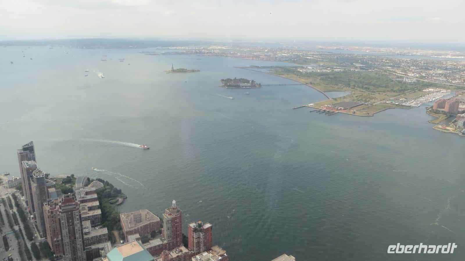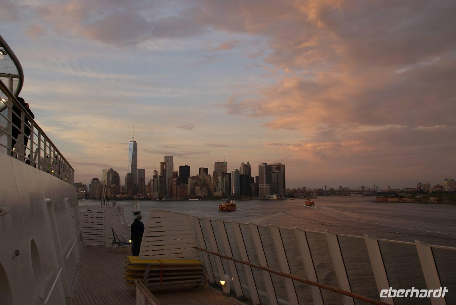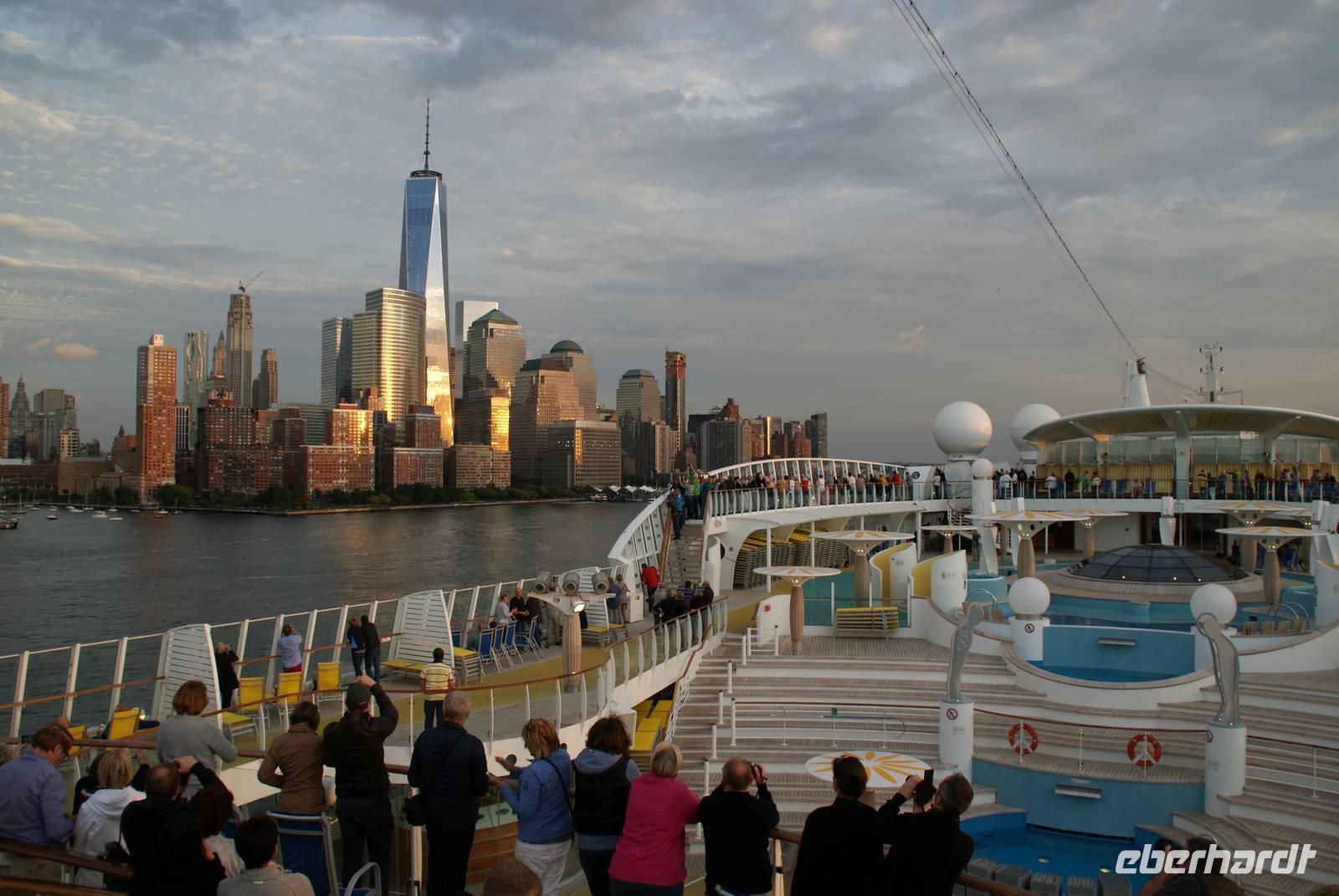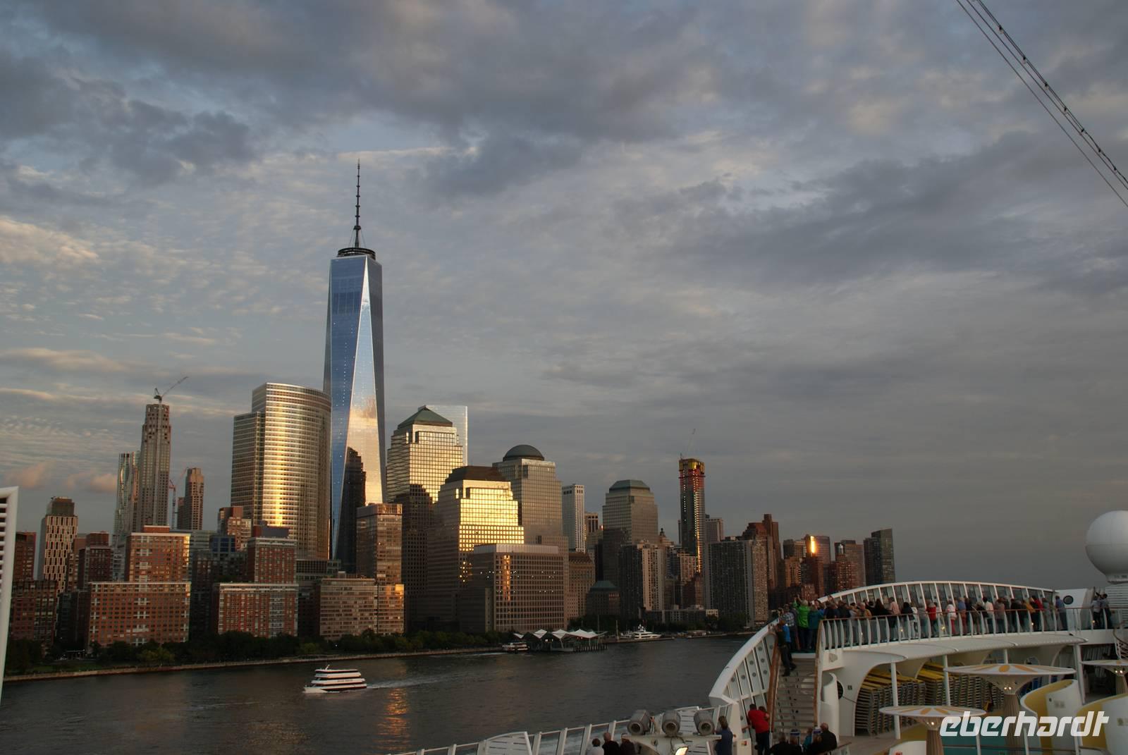 Nachdem wir die letzten Tage das frühe Aufstehen bereits geübt hatten, trafen wir uns am heutigen Tag frisch gestärkt nach dem Frühstück gegen 9 Uhr. Joscha machte sich mit zwei Gästen und jeweils zwei Rädern auf den Weg, die Stadt nochmals aus einem anderen Blickwinkel - dem des Radfahrers - zu betrachten. Einige Gäste hatten sich im Vorfeld bereits überlegt, was sie am heutigen Tag mit Ihrer freien Zeit in New York anfangen wollten und erlebten ebenfalls einen gelungenen Tag. Ein Großteil der Eberhardt-Reisegäste war jedoch mit mir (Maria) unterwegs um die Aussicht vom neu eröffneten One World Observatory zu erleben - und ich muss sagen: es war eine wahre Freude! Ein wirklich wunderbares Erlebnis. Nicht nur unsere Taxifahrten durch New York, sondern vor allem die Auffahrt auf das höchste Gebäude der westlichen Hemisphäre. Die Aussicht ist spektakulär und die Gestaltung der Besichtigung ist einmalig. Ein wahrer erster Höhepunkt der Reise. Nachdem wir nochmals die Gedenkstätte zum 11.September angeschaut hatten, machten wir uns auf zum Chelsea Market, um die besten Brownies der Welt zu essen! :-) Während unseres Spaziergangs passierten wir Greenwich Village und gingen ein Stück durch den High-Line-Park, bevor wir am frühen Nachmittag zurück zum Schiff fuhren. Hier angekommen erwartete uns die obligatorische Seenotrettungsübung. Danach hieß es: Fotoapparate bereit halten - ein weiterer Höhepunkt der Reise stand an: das Auslaufen aus New York. Zusammen mit der für AIDA typischen Auslaufmusik ein Traumerlebnis mit Gänsehauteffekt!