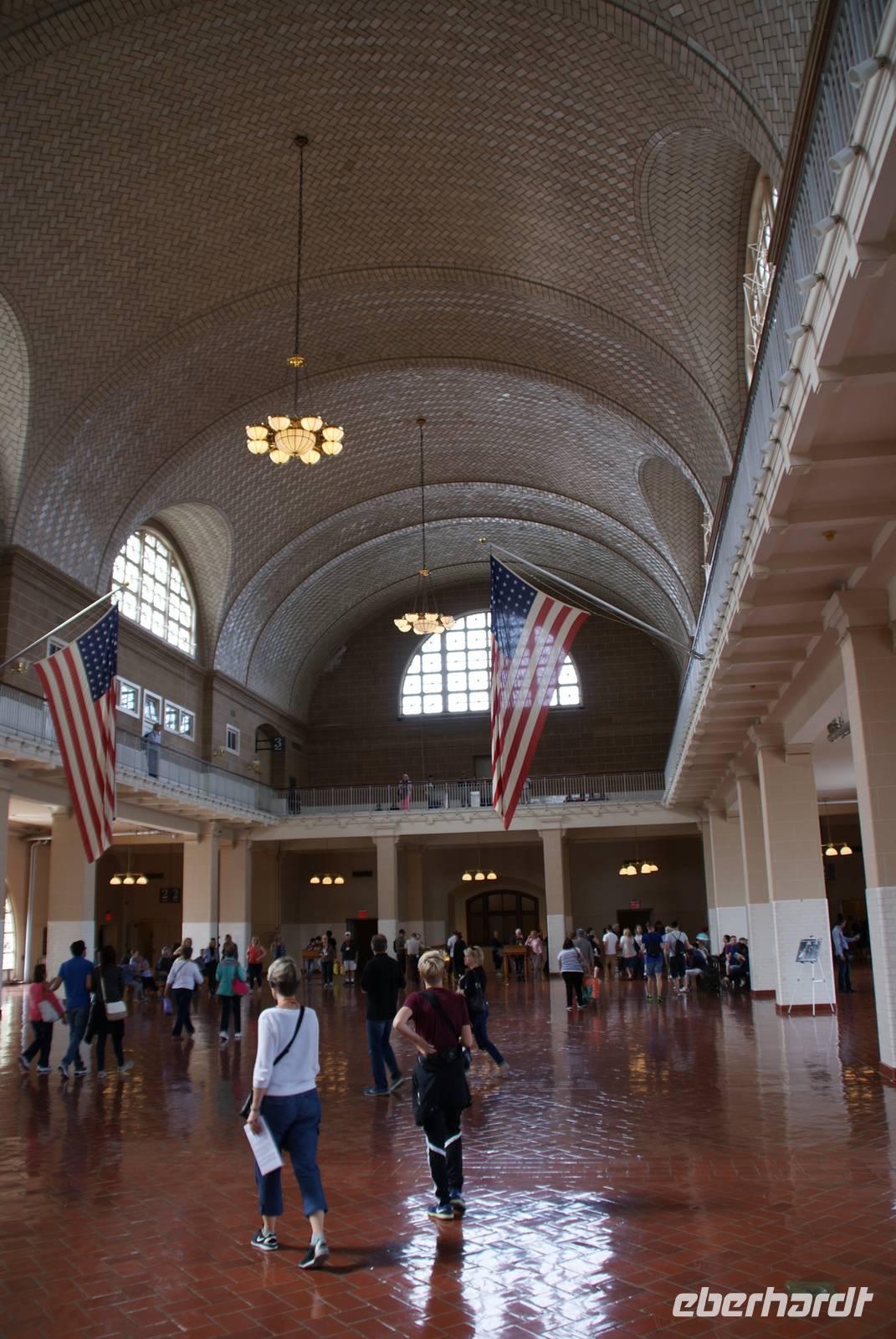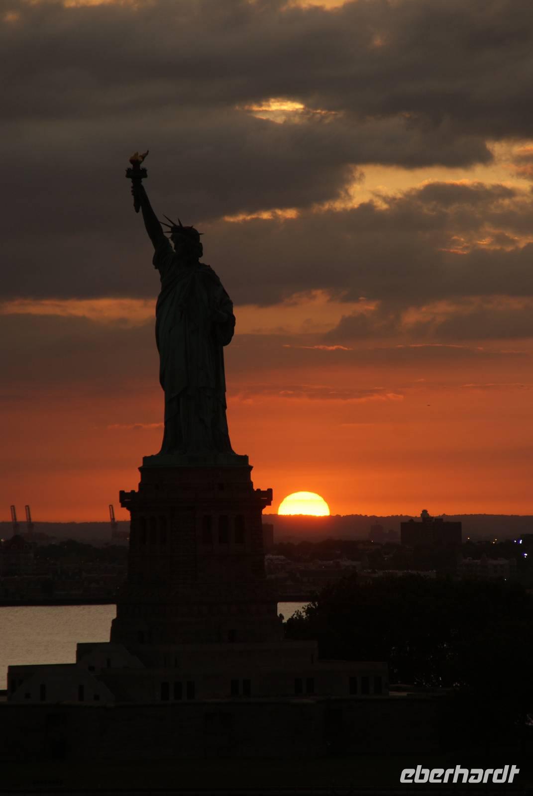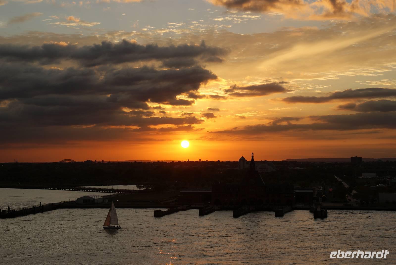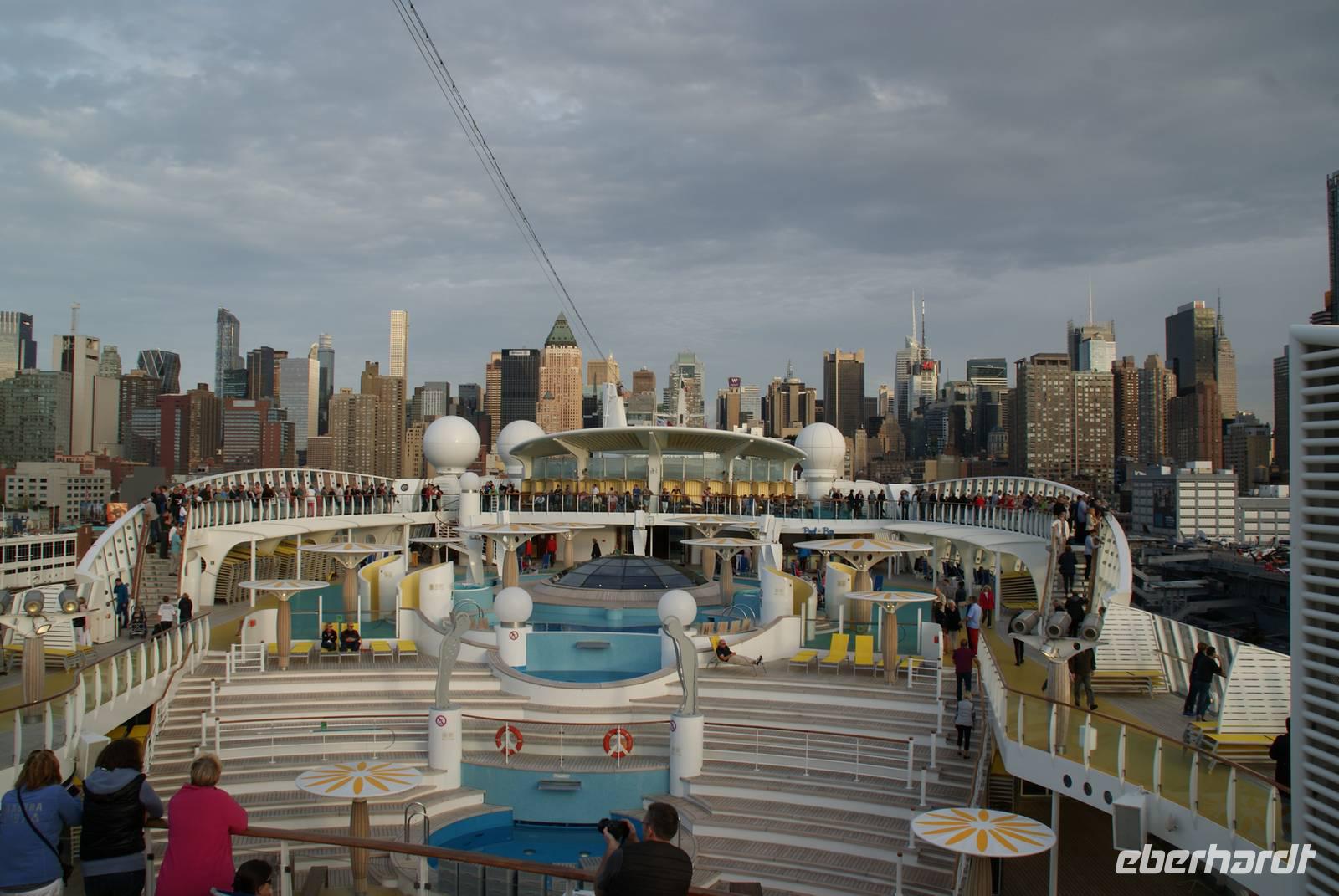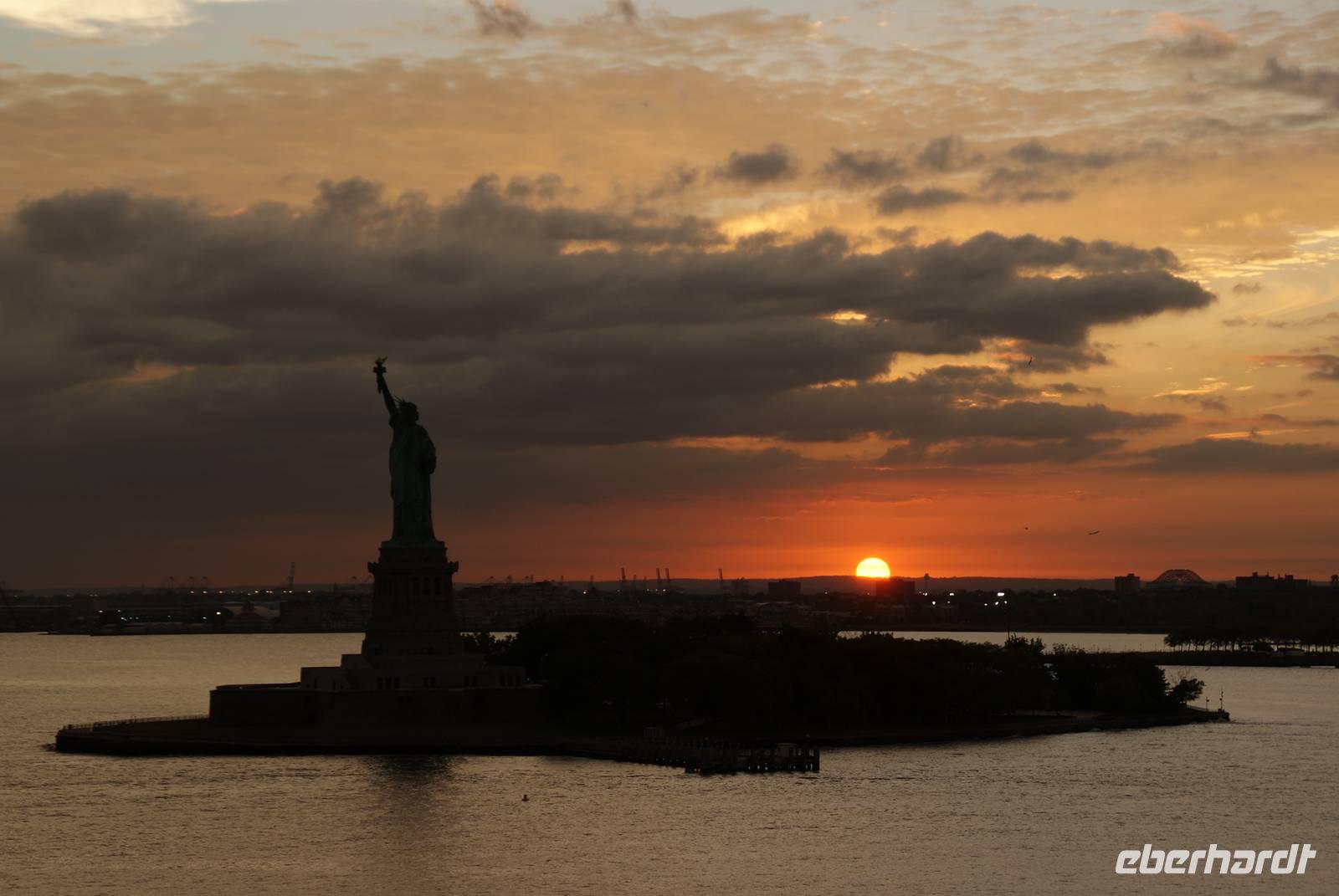 Gut ausgeruht starteten wir mit einem typisch amerikanischen Frühstück im Hotel in den Tag. Durch Zufall trafen wir hier noch auf eine zweite Eberhardt-Reisegruppe. Pünktlich 8 Uhr waren wir dann zur Abfahrt bereit. Unser Reiseleiter Ron war auch bereits da, aber leider keine Spur von unserem Bus. Dieser steckte leider im New Yorker Verkehr fest. Mit knapp einer Stunde Verspätung haben wir uns dann auf den Weg zu unserer Stadtrundfahrt gemacht. Zu sehen bekamen wir sehr viel, auch mit Erklärungen versorgte uns Ron reichlich. In den nun folgenden Stunden sollten wir viel erleben und entdecken. So fuhren wir die verschiedenen Straßen und Avenues entlang. Wir sahen den Central Park, die weltbekannte MET, den Columbus Circle, den Times Square und Broadway bei Tag. Schauten uns kurz am Rockefeller Center um, ebenso wie an der Grand Central Station, bevor es in Richtung Südspitze Manhattans ging. Hier angekommen hieß unser Ziel: Liberty Island und Ellis Island. Zunächst machten wir auf der Insel, wo sich die berühmte Freiheitsstatue befindet einen Halt und auch eine kleine Mittagspause. Danach ging es weiter nach Ellis Island, wo wir kurz das Museum zur Einwanderungsgeschichte des letzten Jahrhunderts durchquerten. Zurück in Manhattan und nach kurzer Wartezeit auf den Bus, führten uns Ron mit einem Extrahalt noch zum Ground Zero, wo wir die zwei Becken zum Gedenken an die Zwillingstürme und die Anschläge vom 11.September betrachteten. Von hier aus fuhren wir zur Manhattan Cruise Pier, wo AIDAdiva an der Pier 88 fest gemacht hatte. Die Einschiffung lief reibungslos und unser schwimmendes Hotel für die kommenden zehn Tage nahm uns in Empfang.