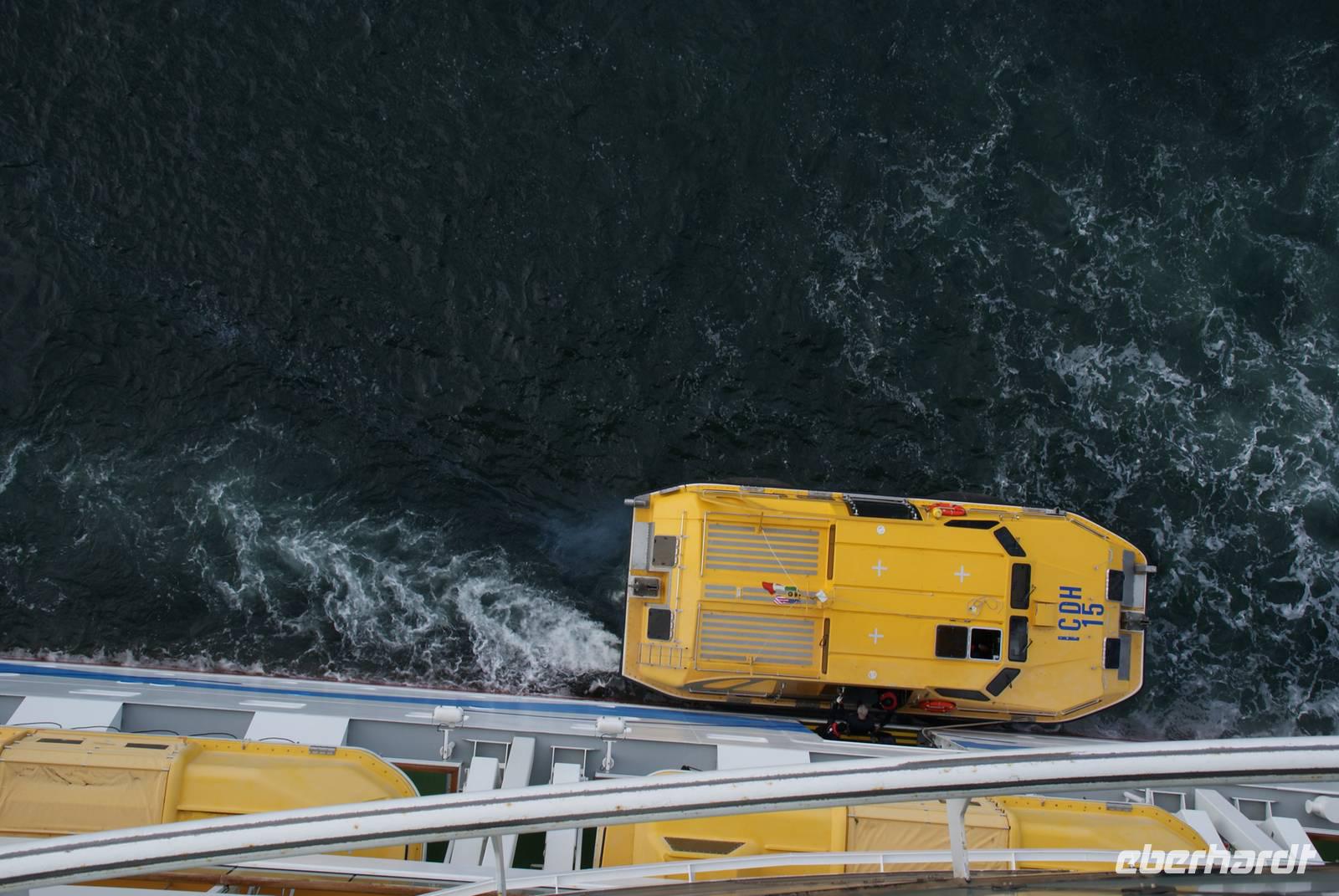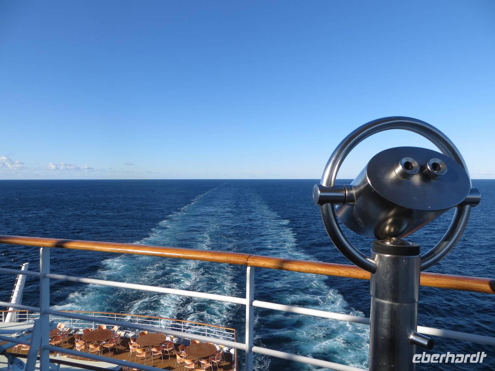 Heute sollten wir erfahren, warum wir eine Schiffsreise machten - es gab Seegang. Keinen allzu starken, aber doch so, dass man die Schaumkronen der Wellen sah und es auf den oberen Decks nicht lange gegen den Wind aushielt. Laut Aussage des Kapitäns hatten wir es mit Windstärken von etwa 7 Beaufort, was etwa fünf bis sechs Meter hohe Wellen waren, zu tun. Die meisten Gäste der Gruppe jedoch ließen sich davon nicht unterkriegen. Am frühen Nachmittag war das Theatrium bei der Nautischen (Frage-)Stunde gut besucht, da hier viele interessante v.a. technische Daten rund um das Schiff erklärt wurden.