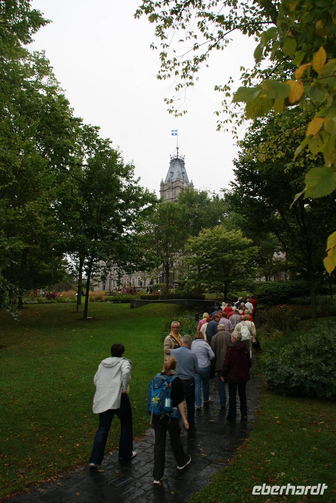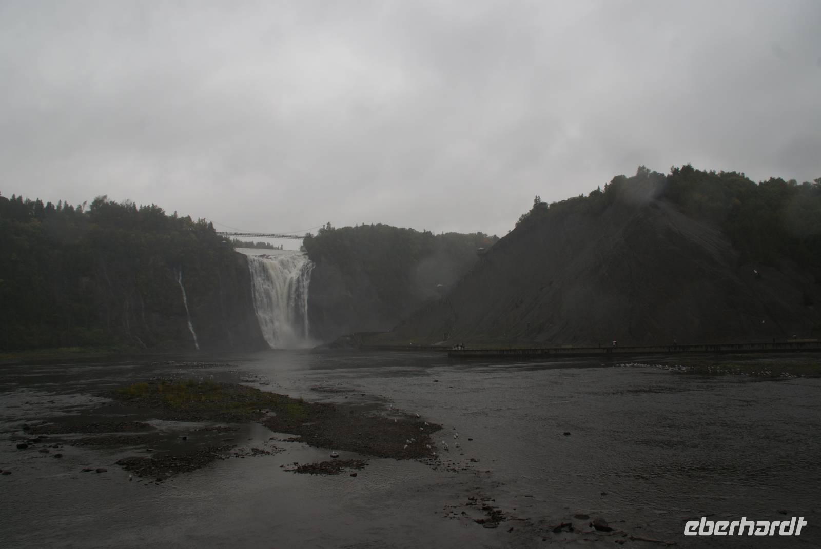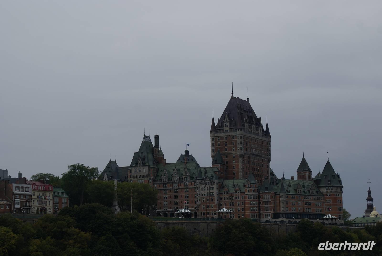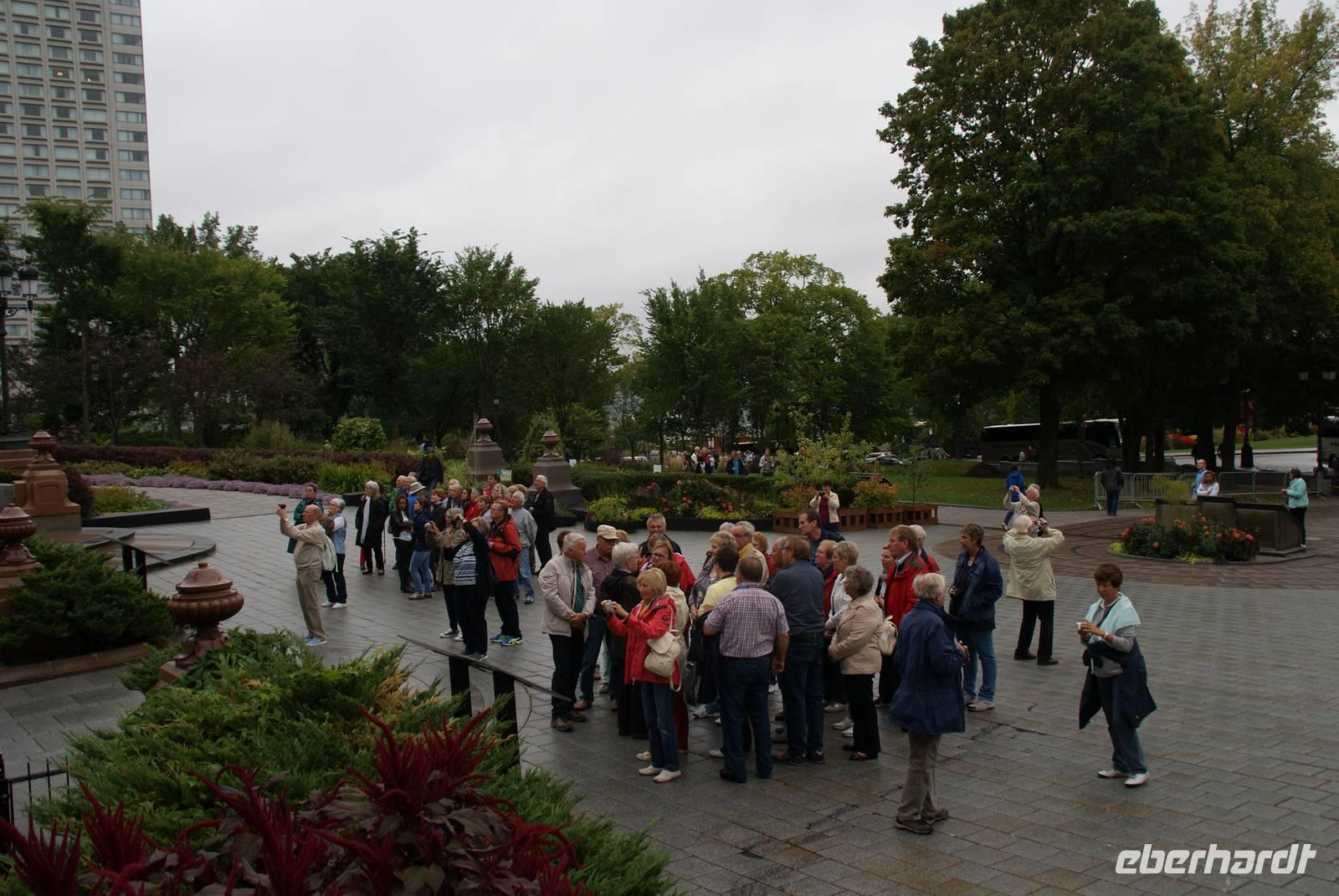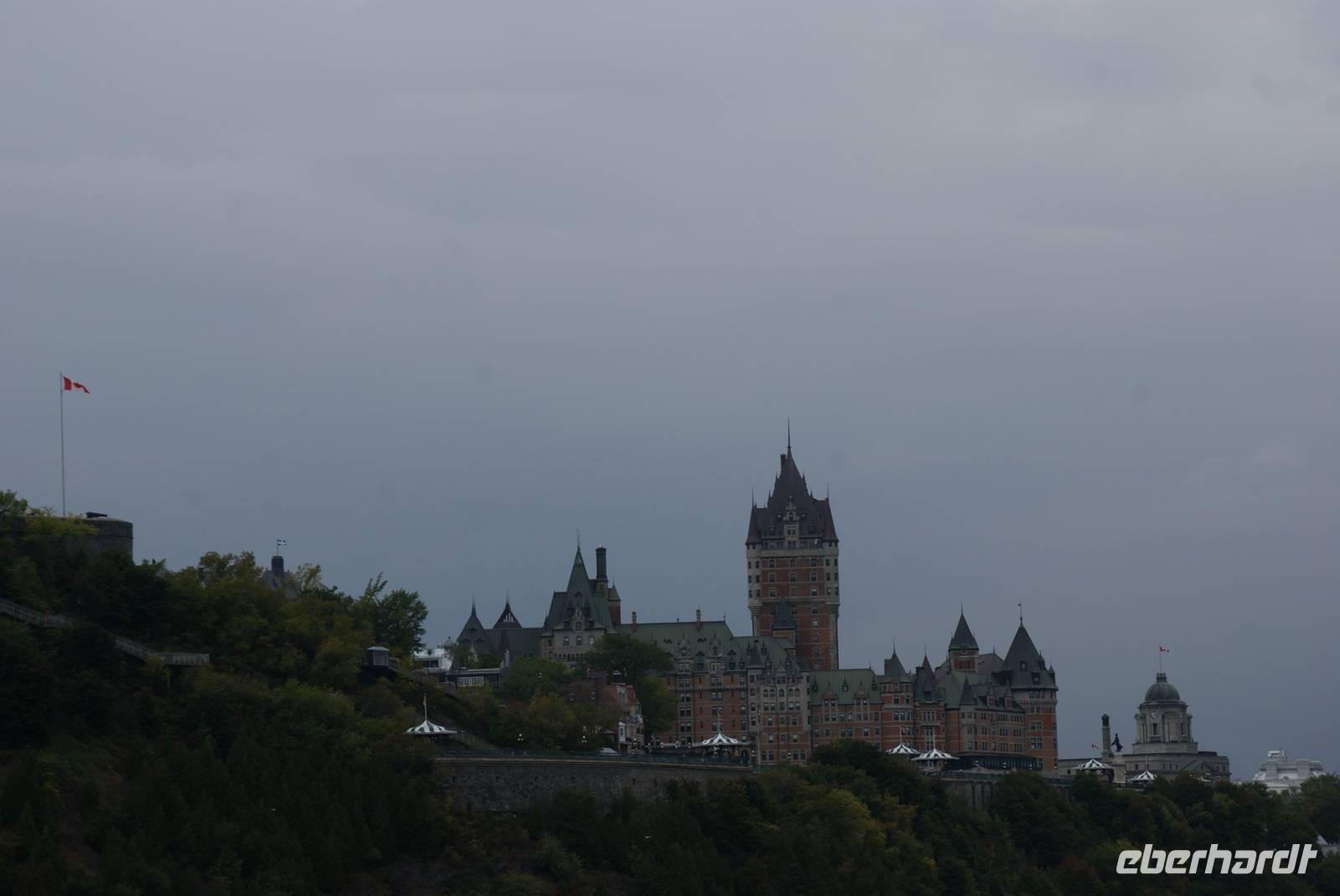 Nachdem wir zwei Tage auf See unterwegs waren, hieß es heute (endlich) wieder Landgang. Es erwartete uns die wohl französischste Stadt außerhalb Frankreichs - Québec, wo etwa eine halbe Million Menschen leben, die zu 95 Prozent französisch als Ihre Muttersprache betrachten. An diesem Tag waren wir alle gemeinsam auf Eberhardt-Landausflug unterwegs. Unser Reiseleiter Paul erwartete uns bereits pünktlich 8.30 Uhr an der Pier und so machten wir uns auf den Weg in Richtung Stadtrundfahrt. Leider spielte heute das Wetter nicht so mit. Es war bedeckt und regnerisch bei schwülwarmen 18 Grad Celsius. Davon ließen wir uns aber nicht abschrecken. Zunächst hielten wir am Parlamentsgebäude, eh wir die Stadtrundfahrt in Richtung der ca. 13 km außerhalb befindlichen Montmorency Wasserfälle fortsetzten. Hier schauten wir uns die 83m hohen Wasserfälle aus verschiedenen Blickrichtungen an und ließen uns durchaus von den Wassermassen beeindrucken. Zurück in Québec führte uns Paul zur Terrasse vor dem Schloss Frontenac, einem der Wahrzeichen Québecs. Nach gut vier Stunden fuhren wir zurück zum Hafen, wo alle Gäste, die gern wollten, mit Paul noch durch die Unterstadt spazierten. Auch wenn das Wetter nicht besonders war - die Stadt hat eindeutig Charme!