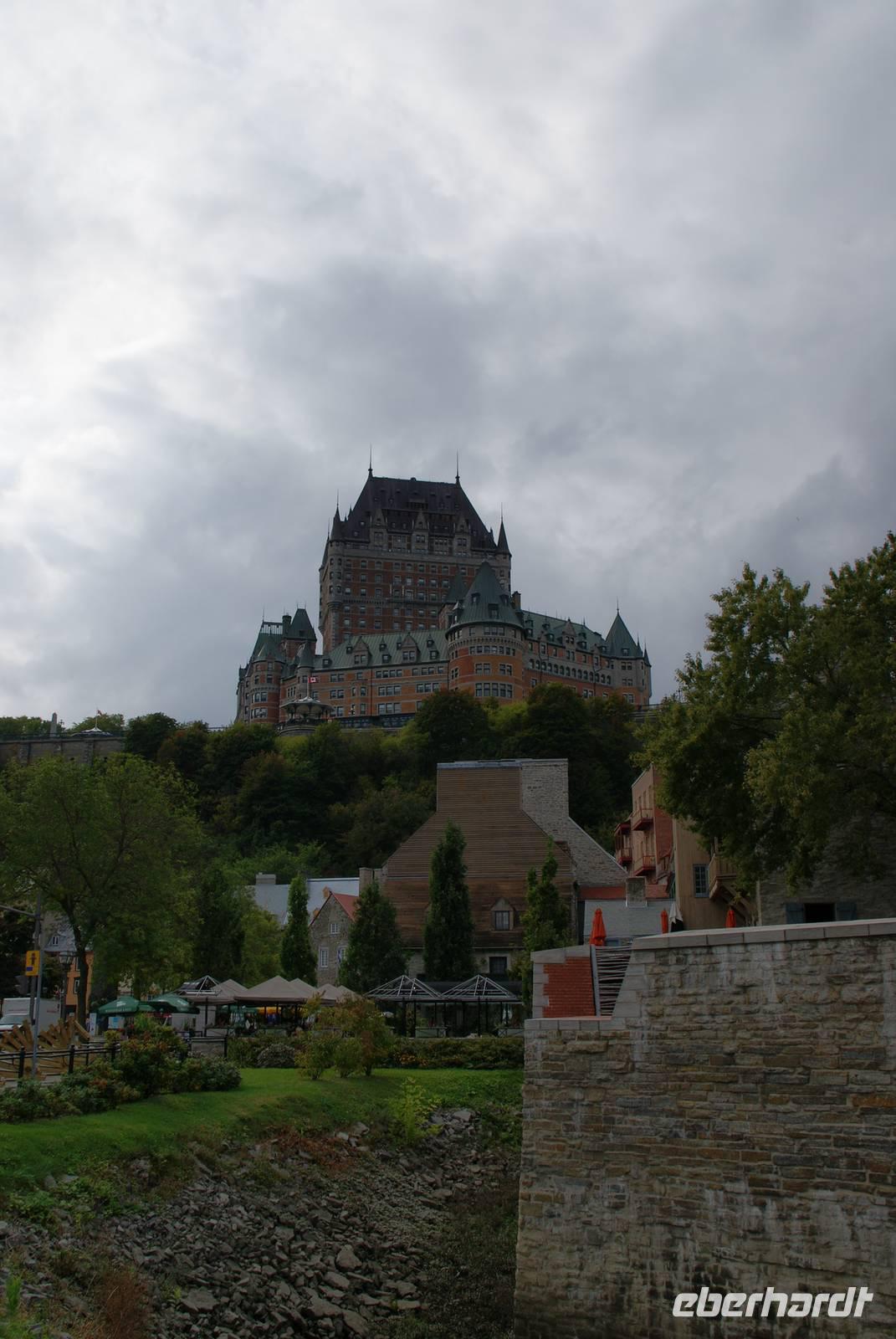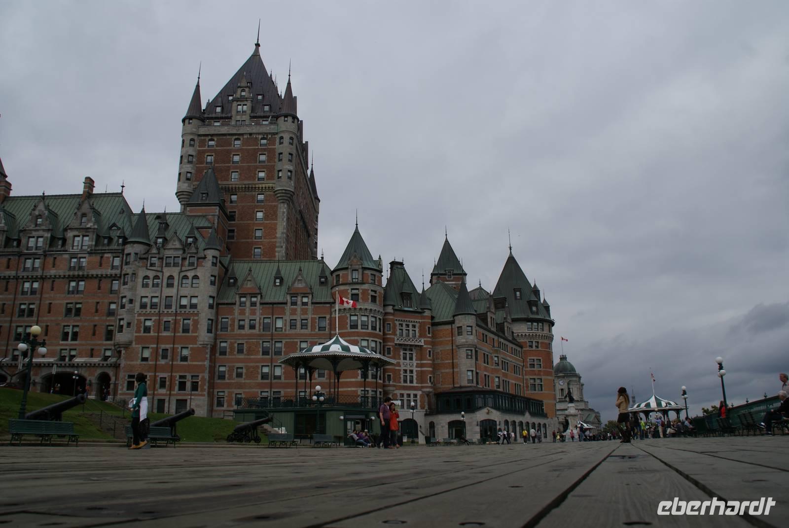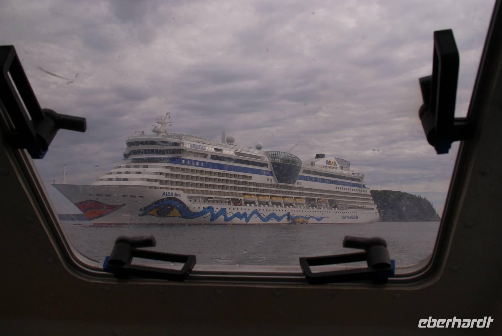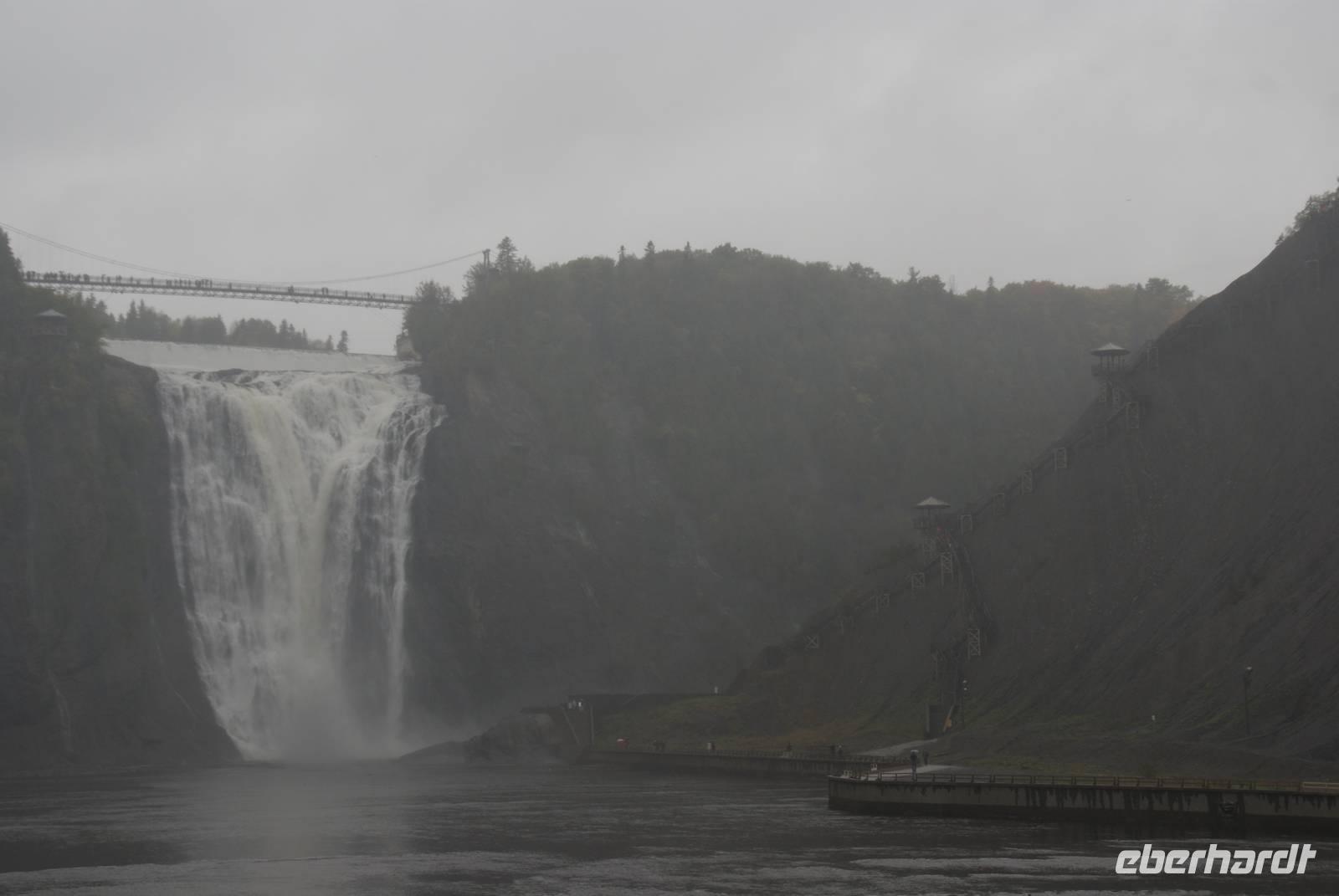 Nachdem wir zwei Tage auf See unterwegs waren, hieß es heute (endlich) wieder Landgang. Es erwartete uns die wohl französischste Stadt außerhalb Frankreichs - Québec, wo etwa eine halbe Million Menschen leben, die zu 95 Prozent französisch als Ihre Muttersprache betrachten. An diesem Tag waren wir alle gemeinsam auf Eberhardt-Landausflug unterwegs. Unser Reiseleiter Paul erwartete uns bereits pünktlich 8.30 Uhr an der Pier und so machten wir uns auf den Weg in Richtung Stadtrundfahrt. Leider spielte heute das Wetter nicht so mit. Es war bedeckt und regnerisch bei schwülwarmen 18 Grad Celsius. Davon ließen wir uns aber nicht abschrecken. Zunächst hielten wir am Parlamentsgebäude, eh wir die Stadtrundfahrt in Richtung der ca. 13 km außerhalb befindlichen Montmorency Wasserfälle fortsetzten. Hier schauten wir uns die 83m hohen Wasserfälle aus verschiedenen Blickrichtungen an und ließen uns durchaus von den Wassermassen beeindrucken. Zurück in Québec führte uns Paul zur Terrasse vor dem Schloss Frontenac, einem der Wahrzeichen Québecs. Nach gut vier Stunden fuhren wir zurück zum Hafen, wo alle Gäste, die gern wollten, mit Paul noch durch die Unterstadt spazierten. Auch wenn das Wetter nicht besonders war - die Stadt hat eindeutig Charme!