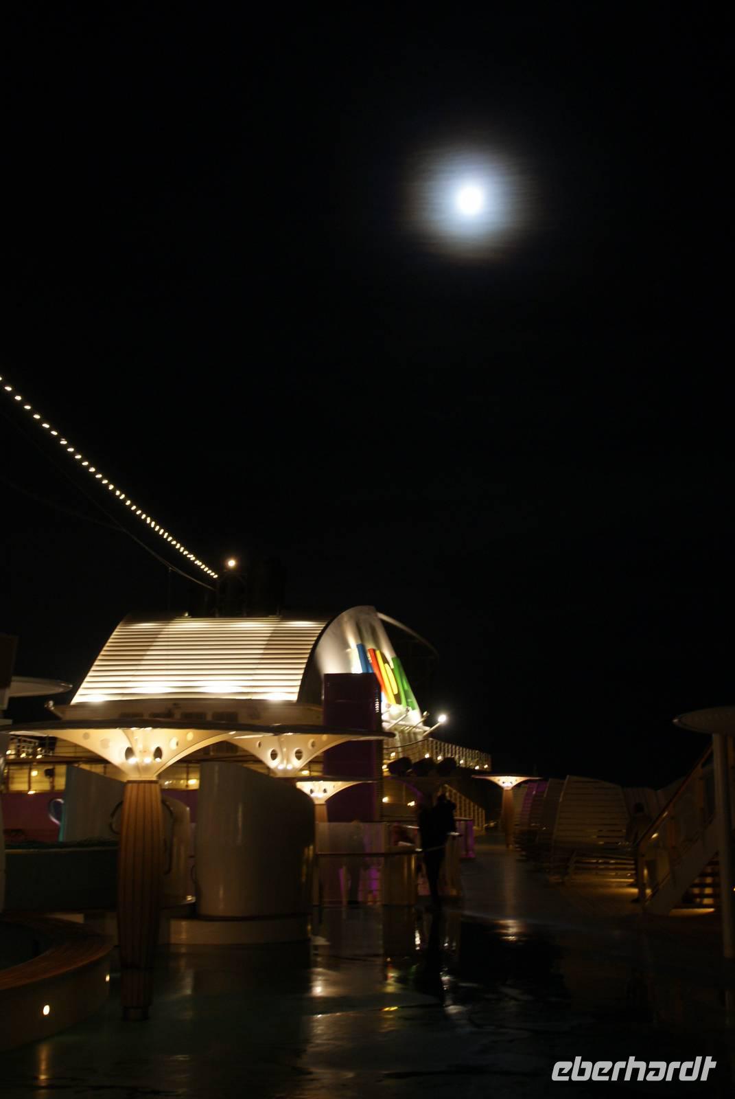 Nach einem gemütlichen, fast faulen Tag auf See, trafen wir uns 18 Uhr zu einem gemeinsamen Abendessen mit der Gruppe im Weite Welt Restaurant auf Deck 10. Nachdem wir fast drei Stunden in bester Gesellschaft beisammen gesessen, geschmaust, viel erzählt und gelacht hatten, sollte es ab 21 Uhr auf dem Pooldeck interessant werden. Eine Mondfinsternis stand an. Diese ließ dann aber doch noch bis kurz vor Mitternacht auf sich warten, war dann aber ein tolles Erlebnis auf hoher See.
