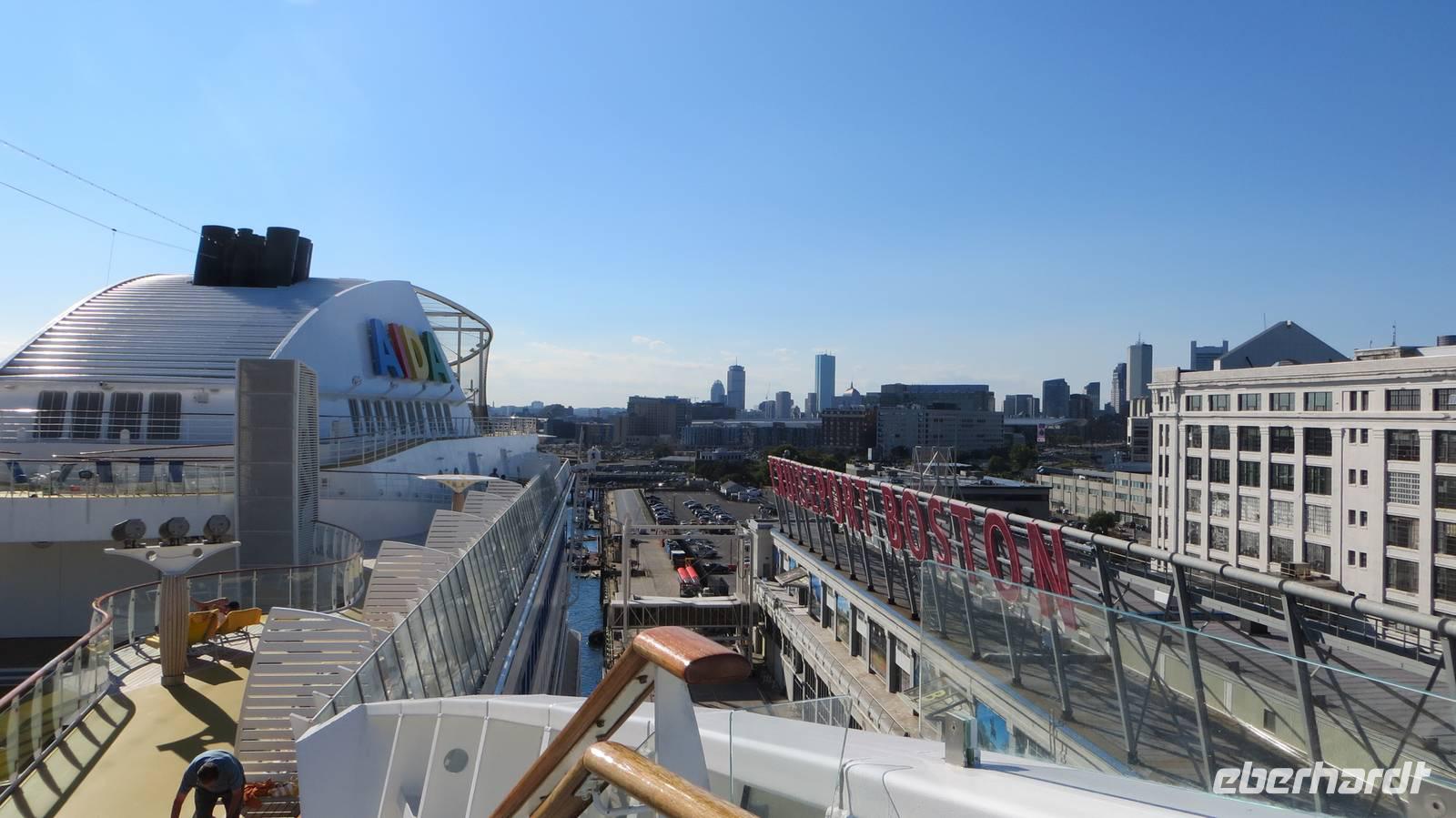 Nachdem wir über den Charles River zurück nach Boston Downtown gefahren waren, ging es hoch hinaus. Die Aussicht bei bestem Wetter vom Skywalk des 50.Stockwerkes auf 229m war wunderbar. Jedoch arbeiteten die Aufzüge an diesem Tag nicht ganz so zuverlässig. Zum Abschluss der Tour hatten wir noch circa eine Stunde Freizeit am Quincy Market, wo wir Schlendern und Bummeln gehen konnten. Gegen frühen Nachmittag zurück am Schiff nutzten viele Gäste das schöne Wetter für einen Aufenthalt auf den Außendecks oder zu einem kleinen Mittagsschläfchen.