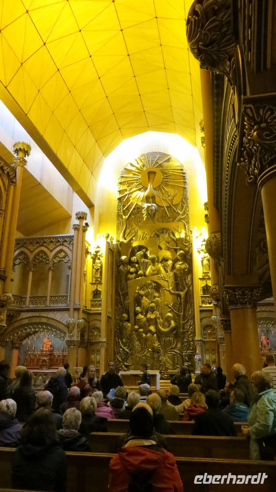 Noch war die Reise nicht zu Ende. Heute wollten wir schließlich noch Montreal, eine Millionenstadt, erkunden und entdecken. Leider war das Wetter heute noch schlechter als am Vortag, denn zum bedeckten Himmel kamen noch kalter Wind und Nieselregen dazu - ein echter Herbsttag. Einige Gäste machten sich wieder allein auf den Weg in die Stadt, andere spazierten mit Joscha durch die Altstadt, was allerdings bei dem Wetter keine allzu große Freude war. Die meisten Eberhardt-Reisegäste waren an dem Tag wieder mit mir (Maria) unterwegs. Wir hatten über AIDA eine dreistündige Stadtrundfahrt gebucht. Die örtliche Reiseleiterin Marie führte uns zunächst zur Innenbesichtigung der Basilika Notre Dame. Danach setzten wir die Stadtrundfahrt fort. Leider war die Sicht vom namensgebenden Hausberg Mont Royal ziemlich nebelverhangen, aber wir machten trotzdem das Beste daraus.