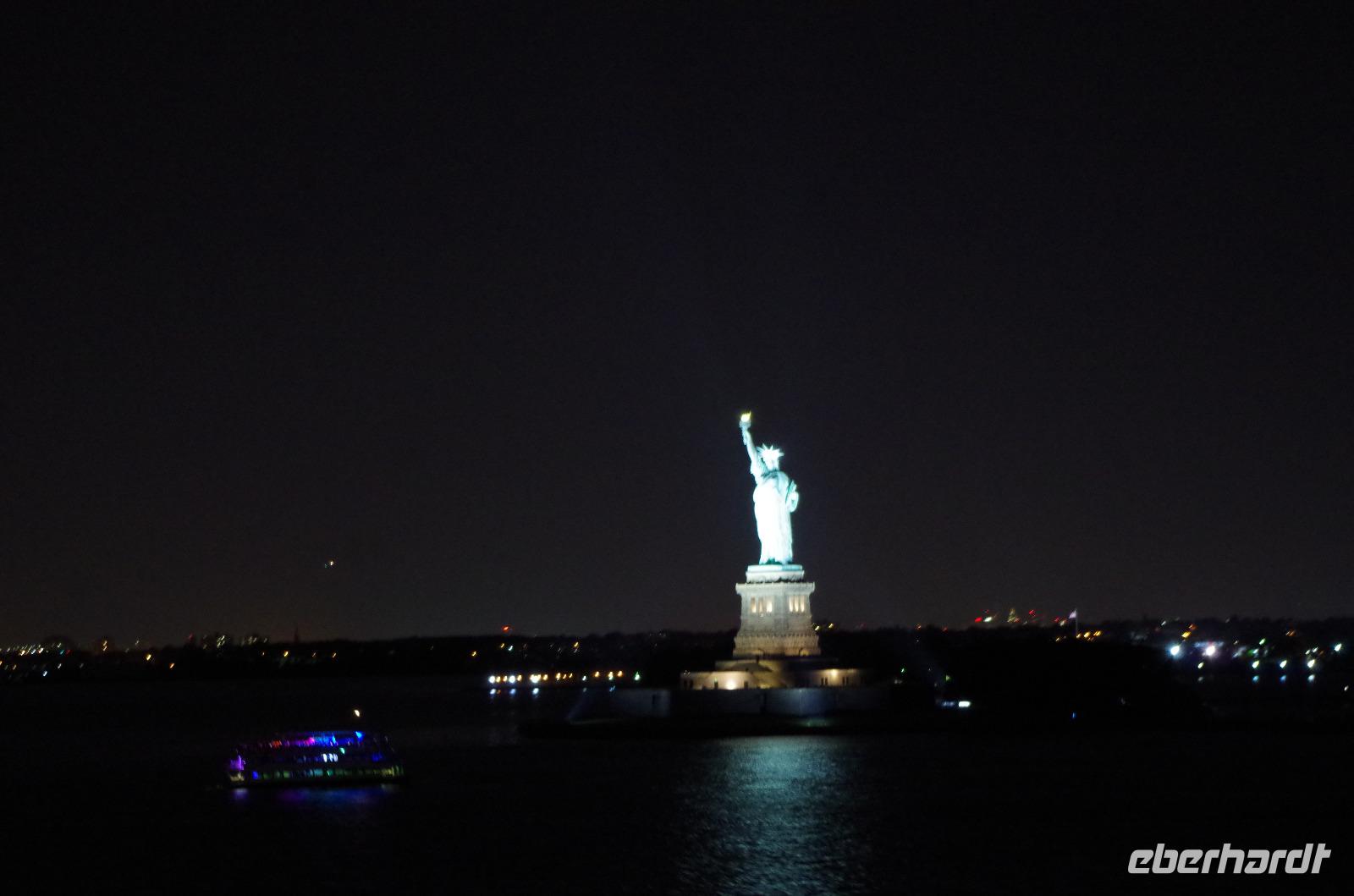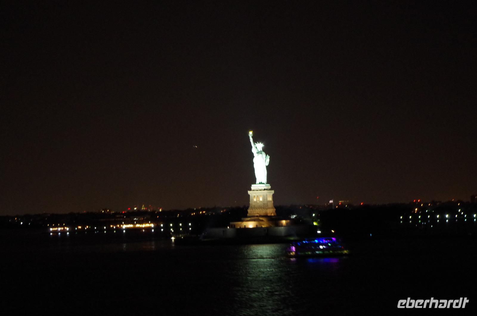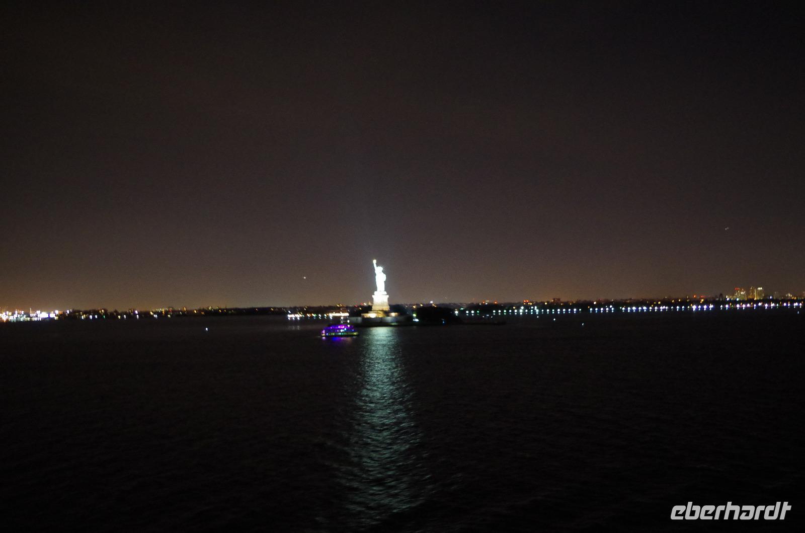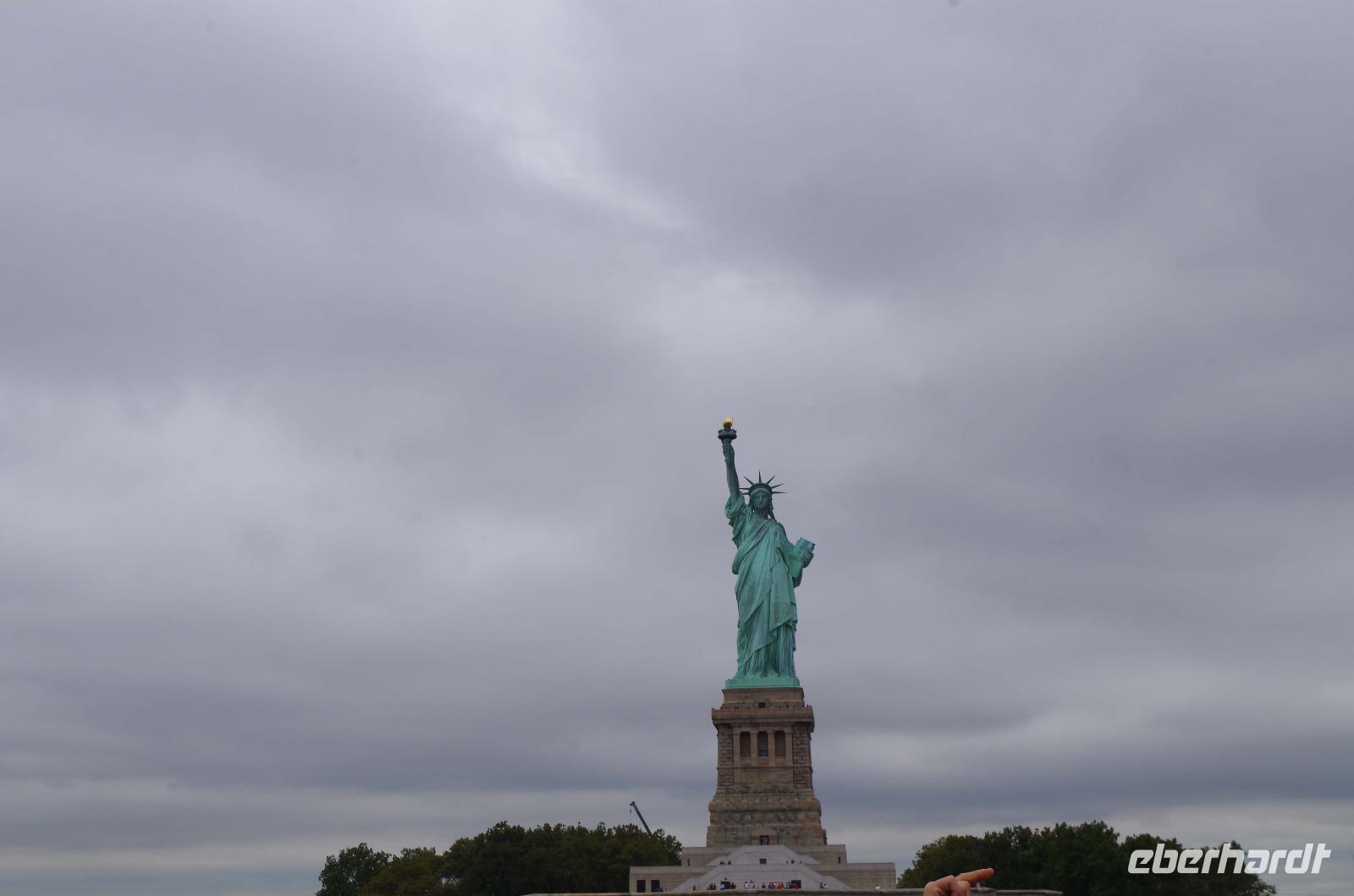 Wir werden zwar nicht mit strahlendem Sonnenschein geweckt, aber was nicht ist, kann ja noch werden :-) Wer möchte, kann um 06.30 Uhr im Frühstücksraum neben der Rezeption frühstücken gehen. Das Frühstück in den USA ist schon eine ganz andere Geschichte als bei uns in Deutschland. Während wir es gewohnt sind, von Porzellan-Geschirr und mit Besteck aus Stahl zu essen, ist dies unter Umständen in vielen amerikanischen Hotels weniger gewöhnlich. Zum Frühstück stehen uns zwar ausreichend Teller und Besteck zur Verfügung, aber die Teller sind aus Pappe und das Besteck aus Plastik. Na gut, dann frühstücken wir heute eben amerikanisch! Ab morgen auf der AIDAdiva erhalten wir dann "richtiges" Besteck und ordentliche Teller. Wir treffen uns mit den Koffern um 09.00 Uhr in der Hotellobby. Die vollständige Gruppe lernt sich endlich kennen. Nach einem problemlosen Check-Out lassen wir unser Gepäck im Bus verladen. Erst am späten Nachmittag fahren wir zum "Manhatten Cruise Ship Terminal, Pier 90, 50th Street", wo die AIDAdiva bereits auf uns wartet. Wir werden abermals von unserer örtlichen Reiseleiterin mit Wasser versorgt, so kann die interessante Stadtrundfahrt beginnen. Aufgrund der vom 19. bis 25. September 2017 stattfindenden 72. Sitzung der UN-Generalversammlung mit Überschrift "Focusing on People: Striving for Peace and a Decent Life for All on a Sustainable Planet" sowie dem Aufenthalt von Präsident Donald Trump in New York City sind einige Straßen rund um die Central Station, Trump Tower und dem Rockefeller Center gesperrt. Jedoch haben wir eine großartige Reiseleiterin, welche sich bestens in New York auskennt und den Busfahrer in die nahegelegensten Straßen führt. Wir fahren unter anderem am Madison Square Garden und Times Square vorbei, durch Greenvich Village, Soho und Little Italy zum Financial District und dem Battery Park City. Während der Fahrt erhalten wir viele interessante Informationen von unserer Reiseleiterin. Natürlich ist das Leben in New York nicht gerade preiswert, obwohl San Francisco die teuerste Amerikas und Boston ebenfalls preisintensiver als New York ist. Wir erfahren, dass der Mietpreis für ein Studio mit einem Raum, Küche und Bad in Manhattan ab 2.500 US-Dollar pro Monat aufwärts liegt. Eine Wohnung mit einem Schlafzimmer kostet zwischen 3.000 bis 4.000 US-Dollar im Monat, eine Zweiraumwohnung zwischen 4.000 und 5.000. Beispielsweise sind in Brooklyn und Queens die Mietpreise für eine Zweiraumwohnung zwar preiswerter mit Preisen ab 2.000 US-Dollar pro Monat je nach Distanz zum Zentrum, aber dennoch empfinden wir die Mietpreise als sehr hoch. New York ist aufgrund der Finanzindustrie mit der Wall Street, den Medien, den Hauptfernsehkanälen, einer Vielzahl an Verlagshäusern, den Werbeagenturen und den Theatern eine sehr bedeutende Stadt in Amerika. Bis 1910 ist NYC die Hauptstadt für Film und Fernsehen gewesen, danach wurde Hollywood gegründet. Ein weiterer Grund liegt womöglich auch im viel schönerem Wetter mit wenig Regen und keinem Schnee in Kalifornien. Anschließend besuchen wir das "National September 11 Memorial and Museum", besser bekannt als "9/11 Memorial". Zum Gedenken an die rund 3.000 Todesopfer der Terroranschläge am 11. September 2001 wurde dieses Mahnmal errichtet, auch zur Erinnerung an die Opfer des Bombenanschlags auf das World Trade Center 1993. Wir befinden uns im Süden von Manhattan am "Ground Zero". Das Mahnmal wurde an der Stelle erbaut, wo das ehemalige World Trade Center gestanden hatte. Wir sehen auch den am 12. September 2011 errichteten Gedenkpavillon und das am 15. Mai 2014 vom 44. Präsident der Vereinigten Staaten, von Präsident Barack Obama, eingeweihte Museum. Für eine Besichtigung müssen sich die Gäste vorher anmelden und nur zu einer den Gästen mitgeteilten bestimmten Zeit darf das Museum besucht werden. Es ist eine respektvolle und nachdenkliche Atmosphäre. Die Gäste erinnern sich wohl noch sehr genau daran, was sie am Tag des Anschlags am 11. September 2001 gemacht haben. Gegen 13.00 Uhr fahren wir von der Fährstation am Battery Park zuerst zur etwa 2,5 Kilometer von der Südspitze Manhattans entfernten Liberty Island und fotografieren ein weiteres Wahrzeichen von New York, nämlich die "Statue of Liberty", die Freiheitsstatue. Liebevoll wird sie auch "Lady Liberty" genannt. Die aus einem Eisengerüst bestehende und mit einer Kupferschicht überzogene Statue mit vollständigem Namen "Liberty Enlightening the World" wurde am 28. Oktober 1886 im Hafen von New York eingeweiht. Eigentlich war die Schicht braunes Kupfer, welche aber durch Verwitterung und Rosten ihre heutige grüne Farbe erhalten hat. Die 46 Meter hohe Statue (ohne Sockel) selbst war ein Geschenk Frankreichs, wobei die USA für den Sockel verantwortlich gewesen sind. Die Amerikaner haben das ursprünglich zum 100. Jahrestag der amerikanischen Unabhängigkeit 1876 erhaltende Geschenk aufgrund stockend liefernden Spendensammlungen beider Seiten erst zehn Jahre später erhalten. Als Darstellung der römischen Göttin der Freiheit mit Namen "Libertas" wurde die Staute vom Franzosen Frédéric-Auguste Bartholdi entworfen, welcher angeblich auch das Gesicht der "Lady Liberty" nach seiner eigenen Mutter bildete. Die Nase ist 1,37 Meter lang. Wir fotografieren die berühmte Lady aus verschiedenen Blickwinkeln, wobei wir uns ihr Aussehen näher betrachten. Sie ist in ein Gewand gekleidet, mit einer in den Himmel ragenden Fackel in der rechten und einer Tafel mit dem amerikanischen Unabhängigkeitsdatum in der linken Hand. Die auf den Kopf tragende Krone besteht aus sieben Zacken, wobei eine Zacke einem Kontinent entspricht. Zudem ist ihr rechter Fuß angehoben, das heißt, sie steht nicht, sondern sie "geht". Die um die Füße herum zerbrochenen Ketten stellen ein Symbol für die Befreiung dar. Für einen entspannten Spaziergang rund um die Insel haben wir ausreichend Zeit. Mit der Fähre fahren wir später nur wenige Minuten weit