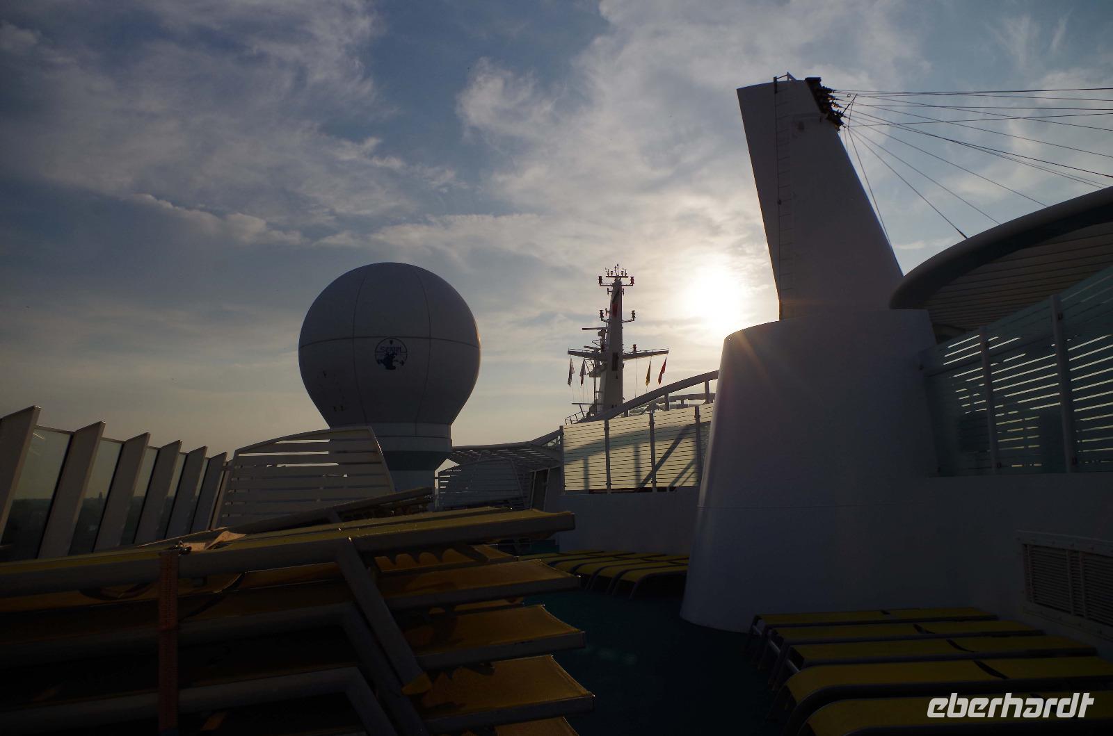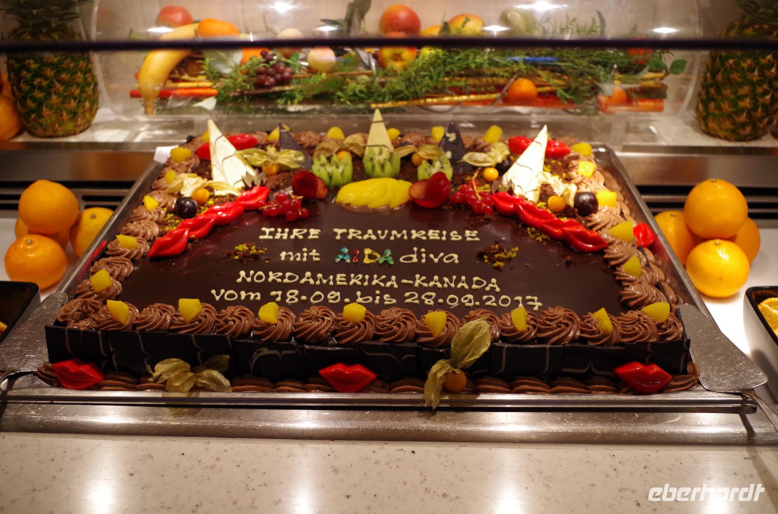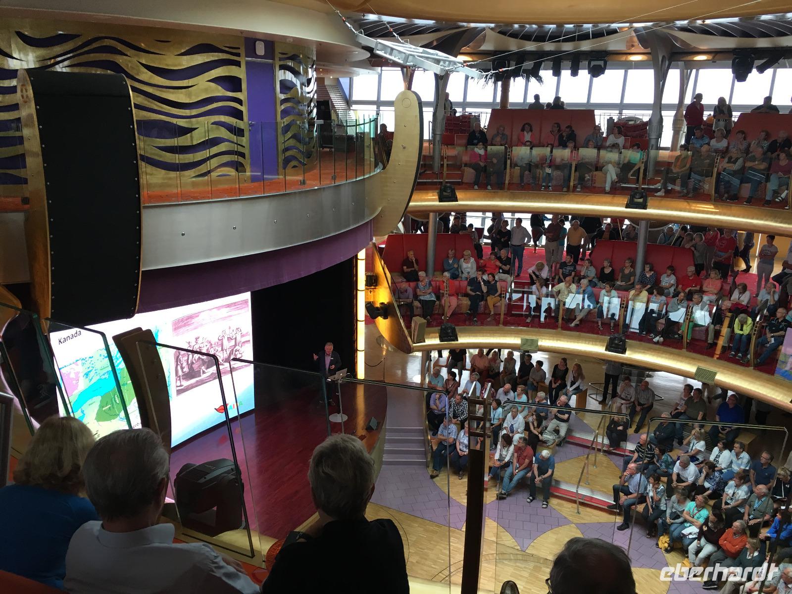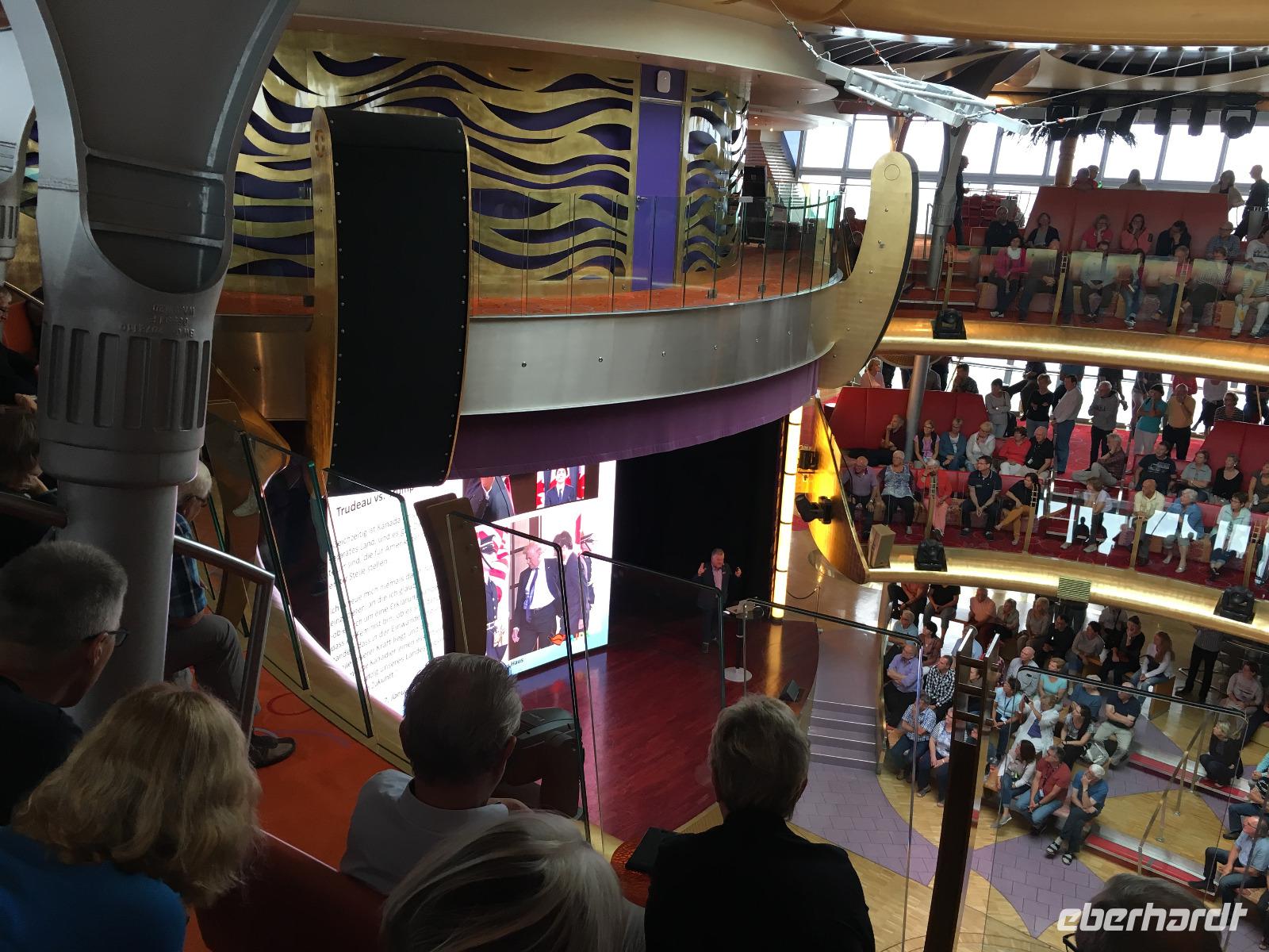 Ein weiterer Tag zur Erholung auf See erwartet uns. Frühstücken können wir heute wieder ab 08.00 Uhr im "Weite Welt Restaurant". Es ist wechselhaft bei rund 22 Grad. Wir erfahren weitere interessante Fakten zur Seemannssprache, welche unter anderem vom Niederländischen, Englischen und Plattdeutsch aufgrund der internationalen Besatzung geprägt ist. Das Bedürfnis nach Sicherheit steht bei der Seemannssprache an erster Stelle. Folglich wurden die Begriffe eindeutig nach Funktion und Art charakterisiert, auch zur Vermeidung einer Mehrdeutigkeit. Die Begriffe Back- und Steuerboard sind uns bestens bekannt. Vom Heck zum Bug gesehen entspricht Backboard "Bd" der linken und Steuerboard "Stb" der rechten Seite. Des Weiteren bedeutet zum Beispiel "achtern" auf einem Schiff "ganz hinten". Das Veranstaltungsprogramm beginnt unter anderem um 10.30 Uhr mit dem unterhaltenden Vortrag "Montreal & Québec: Wo Amerika französisch ist" von Lektor Boris Henn im Theatrium auf Deck 9 bis 11. Zum Mittagessen und Nachmittagskaffee treffen sich einige Eberhardt Gäste abermals im "Weite Welt Restaurant" oder auch im "Bella Vista". Natürlich darf die Erholung und Entspannung an einem solchen Tag nicht zu kurz kommen! Am Nachmittag findet aber noch ein wichtiges Gruppentreffen statt :-) Bereits in der Nacht zuvor haben die Eberhardt Gäste eine Einladung zum (vom ersten Tag auf See verschobenem) exklusiven Sektempfang erhalten. Um 11.30 Uhr treffen wir uns in der AIDA Bar, um gemeinsam beim Eberhardt TRAVEL Sekt Empfang auf eine traumhafte Reise anzustoßen. Das ein oder andere Lächeln entsteht vielleicht schon beim Hören des "Touristengedichts" durch die Reisebegleitung. Es folgt aber noch eine weitere Überraschung! Denn um 17.00 Uhr haben wir ein wichtiges Fotoshooting, wo auch unser erstes gemeinsames Gruppenfoto aufgenommen wird. Wir werden aber nicht allein auf diesem Foto zusehen sein, sondern unser sympathischer griechischer Kapitän Nikos Nitschai wird sich zu uns gesellen. Ein wirklich tolles lustiges Foto von der gesamten Eberhardt Reisegruppe entsteht *freu* Das Abendessen findet wie gewohnt für die meisten Gäste um 18.00 Uhr im "Weite Welt Restaurant" statt. Bei gutem Essen, leckerem Wein und tollen Gesprächen lassen wir einen schönen erholsamen Tag gemeinsam ausklingen. Später am Abend wird um 19.30 Uhr Martins Prime Time gezeigt. Um 20.30 Uhr schauen wir uns "Die Queen-Show: I Want It All" mit den AIDA-Stars im Theatrium an. Musik zum Tanzen bietet ab 21.00 Uhr die Wunschbox mit der Band "Guys and Rosie" in der AIDA Bar auf Deck 10 oder die Black & White Party mit DJ Marcial in der Anytime Bar auf Deck 12.