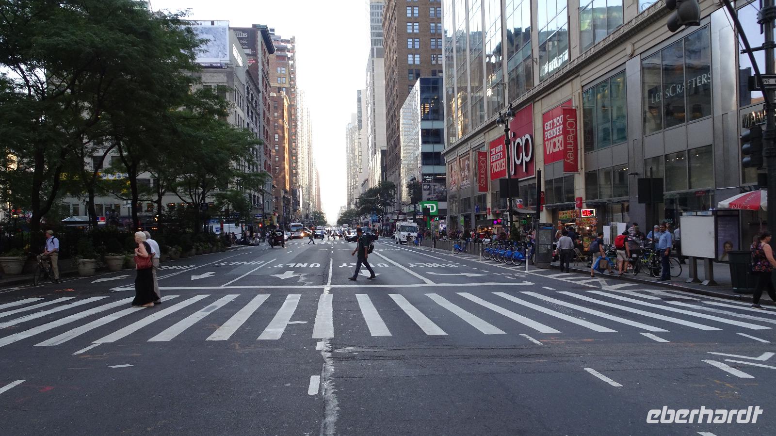 Ein weiterer sonniger Tag in New York erwartet uns :-) Nachdem wir die gestrige Hiobsbotschaft einigermaßen gut verdaut haben, werden wir diese interessante Weltmetropole individuell zu Fuß, auf dem Rad oder im Sightseeing-Bus erkunden. Die Reisebegleitung bietet an, gemeinsam eine Stadtrundfahrt "Hop on, Hop off" im BIG BUS NY zu unternehmen. Wir treffen uns um 09.00 Uhr an der Rezeption und laufen zum Standort "Circle Line Sightseeing Cruises in Hudson River Park - 42nd St & West Side Hwy". Ein Zwei-Tages-Ticket kostet rund 60 US-Dollar. Mit diesem Ticket haben wir auch die Möglichkeit, an einer Nachttour teilzunehmen oder die "Brooklyn Tour" zu fahren. Wir erhalten beim Einstieg In-Ear Kopfhörer, mit denen wir uns einzelne Informationen zu den Stationen in verschiedenen Sprachen anhören können. Manhattan wird von Nord nach Süd in Uptown, Downtown und Midtown eingeteilt, so dass auch die Linien des BIG BUS danach benannt sind. Am heutigen Tag wählen wir die Route "Midtown Loop", welche eigentlich auch das Rockefeller Center und die Grand Central Station beinhaltet. Aber da macht uns mal wieder der Präsident der Vereinigten Staaten einen Strich durch die Rechnung, da dank der UN-Generalsversammlung dieser Bereich abgesichert sowie teilweise eingeschränkt bis gar nicht zu erreichen ist. Davon lassen wir uns aber unsere gute Laune nicht verderben! Wir fahren am riesigen weltberühmten 1858 gegründeten Einkaufszentrum und dem mit 728 Filialen größten amerikanischen Warenhausbetreiber "Macy's" vorbei, dann zum uns bereits bekannten Empire State Building und letztendlich zum Times Square an der Kreuzung Broadway & 7th Ave, wo wir auch aussteigen. Sowohl bei Nacht als auch am Tag ist der Times Square mit den überdimensional großen Reklamebildschirmen ein wahres Blitzlichtgewitter für die Augen. Hier zeigt sich auch, dass New York zurecht die Stadt ist, welche niemals schläft. Aber woher stammt überhaupt der Name Times Square? Wir haben bereits von Frédérique erfahren, dass der von der 42nd bis zur 47th St reichende riesige Platz Times Square seinen Namen vom Gebäude der New York Times mit Standort am Times Square Nummer 1 erhalten hat. Das Wahrzeichen ist wahrscheinlich auch der Times Tower, welcher wie eine riesige Litfaßsäule mit überdimensional großen Werbungsbildschirmen ausschaut. Wir erfahren, dass die Platzierung einer Reklametafel auf dem Times Square einen zweistelligen Millionenbereich an US-Dollars pro Jahr umfasst. Berühmt ist der Times Square auch für seine bereits zur Tradition gewordene Silvesterfeier. Bereits 1904 wurde erstmals von der New York Times ein Feuerwerk veranstaltet, welches aber unkontrolliert war und so zu Verletzten führte. Im Jahr 1907 wurde dann der Times Square Ball eingeführt, welcher sich, wie wir bereits wissen, auf das Gebäude der New York Times ab 60 Sekunden vor dem Jahreswechsel herabsenkt. Um 00.00 Uhr singen alle Besucher traditionsgemäß das bekannte englische Lied "Auld Lang Syne". Der Broadway bildet den Theaterplatz mit rund 40 Theatern in NYC. Zu den berühmtesten Theatern zählen unter anderem das Majestic Theater oder die Metropolitan Opera. Ein Klassiker ist zum Beispiel die Aufführung des Musicals "Der König der Löwen". Wir laufen über den bis zu 33 Kilometer langen Broadway auf bunten Pflastersteinen entlang und fotografieren auch den bereits seit 1928 existierenden Times Square Ticker mit aktuellen Schlagzeilen in Form einer übergroßen Laufschrift. Wir laufen zum Einstieg "W 42nd St & 8th Ave" und fahren mit Big BUS entlang der "Uptown Loop" mit Central Park & Columbus Circle und am Lincoln Center Plaza vorbei. Wir steigen am "American Museum of Natural History" aus. Da wir uns gerade am amerikanischen Naturkundemuseum befinden, folgt noch ein kurzer Einblick in die Geschichte New Yorks. Die Stadt war bis 1626 ein Versammlungsort für Indianer, bis die Insel an den Niederländer Peter Minuit für 24 US-Dollar verkauft wurde. Heute ist New York City eine bunte multikulturelle Acht-Millionen-Metropole mit überdimensionalen Wolkenkratzern und der Finanzhochburg an der Wall Street. Am "American Museum of Natural History" starten wir unseren Spaziergang durch den im Herzen von NYC liegenden rund 349,15 Hektar großen Central Park. Manhattan wird durch den Park in Upper East und Upper West Side getrennt. Rund 45 Minuten später gegen 13.30 Uhr steigen wir am "The Frick Museum - 5th Ave & E 72nd St" wieder ein. Unsere Weiterfahrt mit BIG BUS entlang der "Uptown Loop" führt uns zum Central Park Zoo, am "The Plaza Hotel" und Carnegie Hall vorbei zum "M&M's World Stop - 7 Ave & 48 St". Wir wechseln zur "Midtown Loop" und steigen am gleichen Standort "Circle Line Sightseeing Cruises in Hudson River Park - 42nd St & West Side Hwy" wie am Morgen wieder aus. Wenige Minuten später sind wir gegen 14.15 Uhr wieder auf dem Schiff zurück und wir gönnen uns noch ein leckeres verspätetes Mittagessen im "Weite Welt Restaurant" auf Deck 10. Wer möchte, spaziert am Nachmittag ab 15.00 Uhr gemeinsam mit der Reisebegleitung die "High Line" entlang, eine ehemalige Eisenbahnlinie, welche in den 80er Jahren stillgelegt wurde. Insgesamt ist die früher als Güterzugtrasse genutzte Strecke im Westen von Manhattan rund 2,33 Kilometer lang. Von 2006 bis 2014 hat der Umbau der ehemaligen Güterzugtrasse zur Parkanlage "High Line Park" stattgefunden. Wir betreten die High Line an der Ecke der 11th Ave & West 34 St und laufen gemeinsam bis zur 30th St, wo wir die High Line wieder verlassen und über die 8th Ave unter anderem am Madison Square Garden und der New York Times zum Pier 90 und der AIDAdiva zurückkehren. Bereits nach wenigen Tagen können wir eine sehr gute Orientierung in New York vorweisen, was nicht zuletzt darin liegt, dass das Straßennetz von oben gesehen wie eine Art Schachbrett aufgebaut ist. Während eine Straße von Nord nach Süd eine "Avenue" ist, wird eine Straße von Ost nach West als "Street" bezeichnet. U