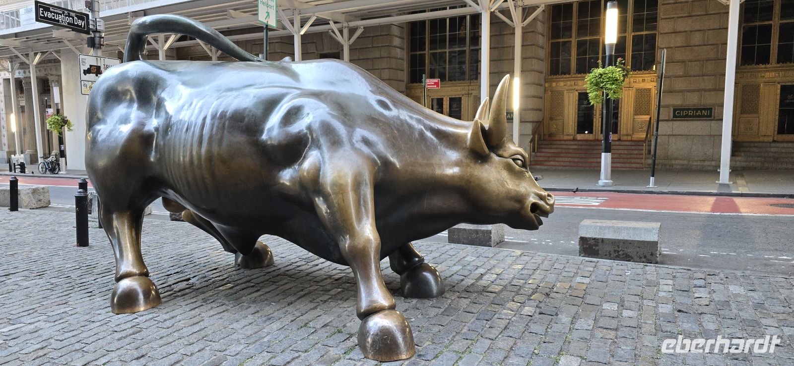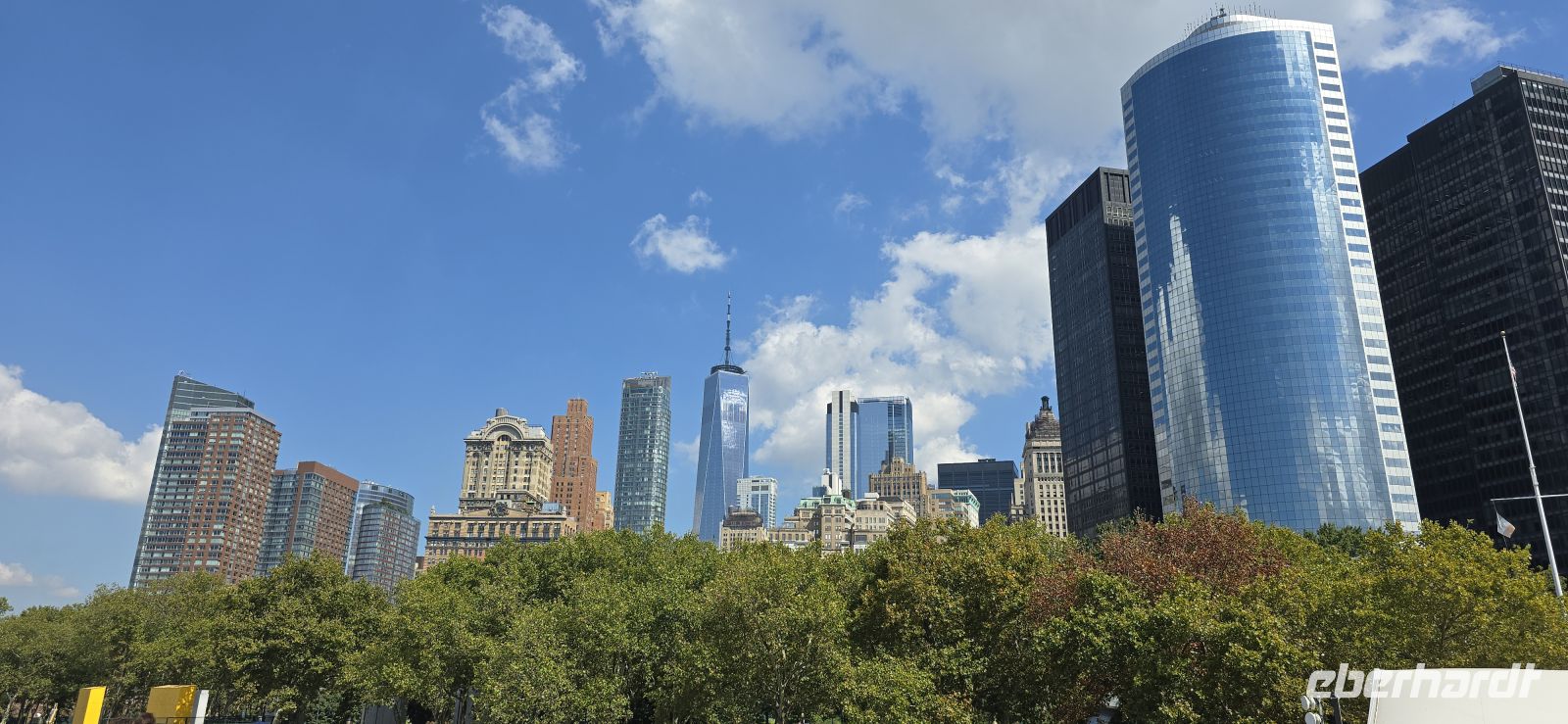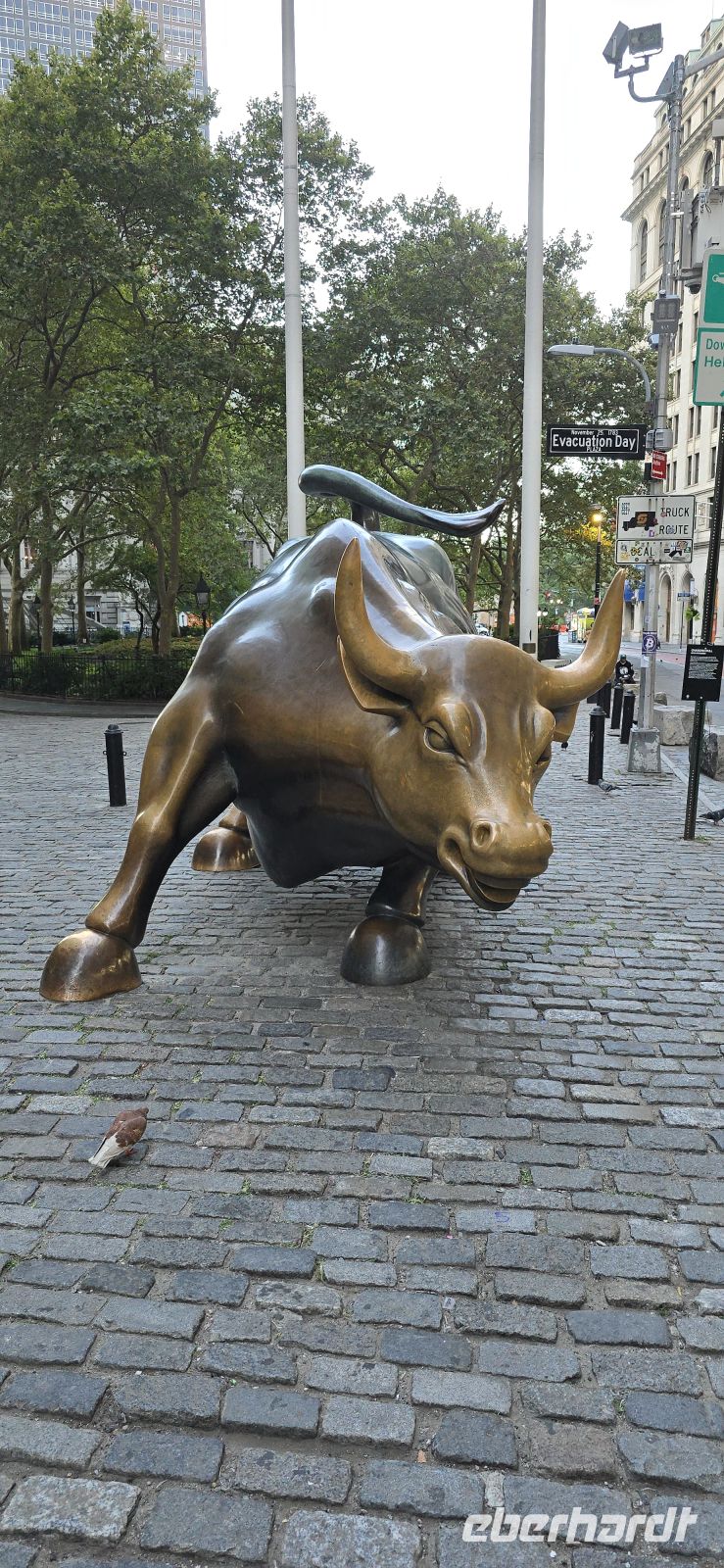 Doch lange hielt es niemanden drinnen. Bei strahlendem Sonnenschein und angenehm warmen Temperaturen machten wir uns auf den Weg zu einem ersten Orientierungsspaziergang durch Downtown Manhattan. Zwischen den mächtigen Fassaden der Wall Street, der ehrwürdigen Börse, dem funkelnden Tiffany-Gebäude und der berühmten Bullen-Skulptur tauchten wir in die besondere Atmosphäre des Finanzdistrikts ein. Schließlich führte uns der Weg bis zum Battery Park, wo wir den ersten Blick auf die Freiheitsstatue erhaschten – ein Moment, der für viele von uns Gänsehaut bedeutete.