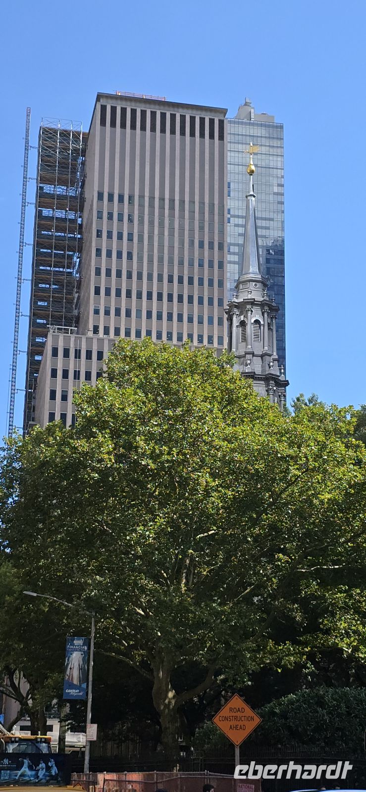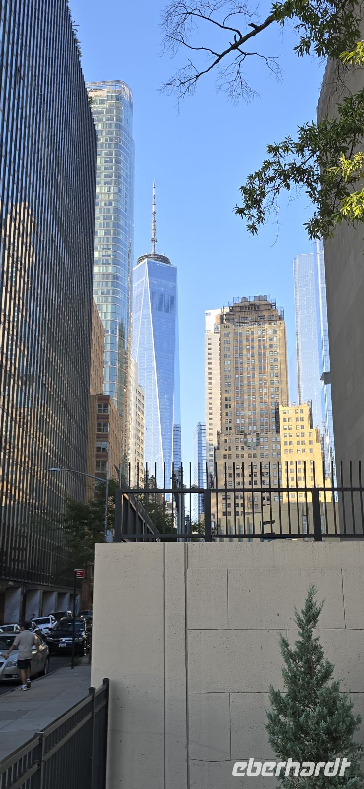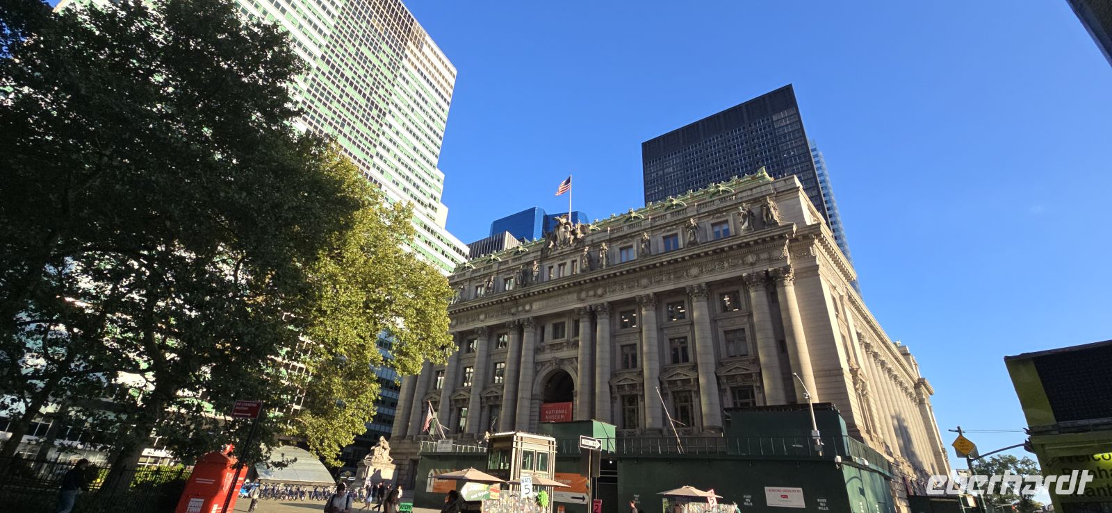 Doch lange hielt es niemanden drinnen. Bei strahlendem Sonnenschein und angenehm warmen Temperaturen machten wir uns auf den Weg zu einem ersten Orientierungsspaziergang durch Downtown Manhattan. Zwischen den mächtigen Fassaden der Wall Street, der ehrwürdigen Börse, dem funkelnden Tiffany-Gebäude und der berühmten Bullen-Skulptur tauchten wir in die besondere Atmosphäre des Finanzdistrikts ein. Schließlich führte uns der Weg bis zum Battery Park, wo wir den ersten Blick auf die Freiheitsstatue erhaschten – ein Moment, der für viele von uns Gänsehaut bedeutete.