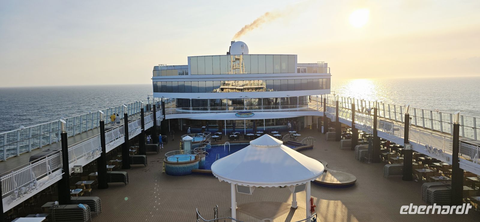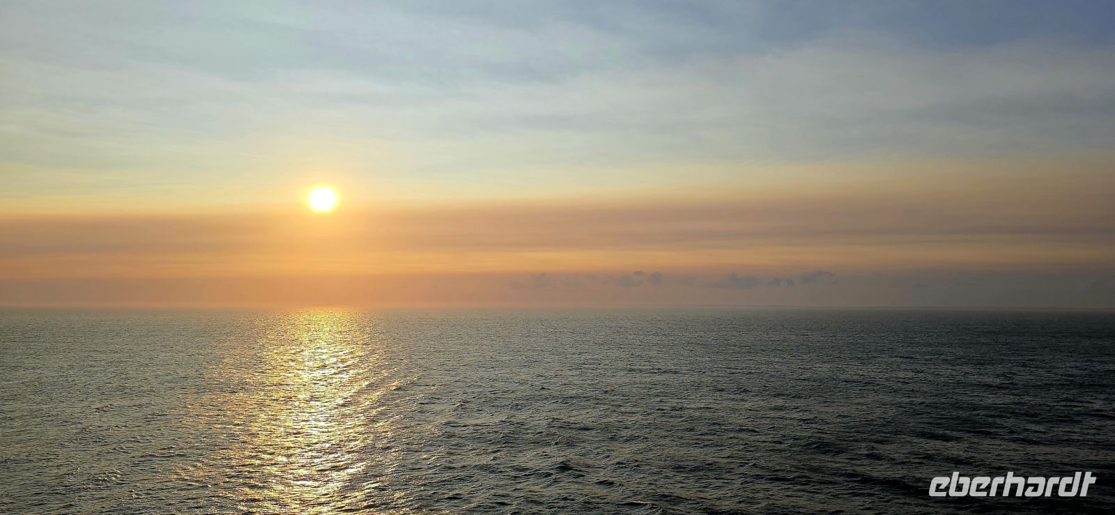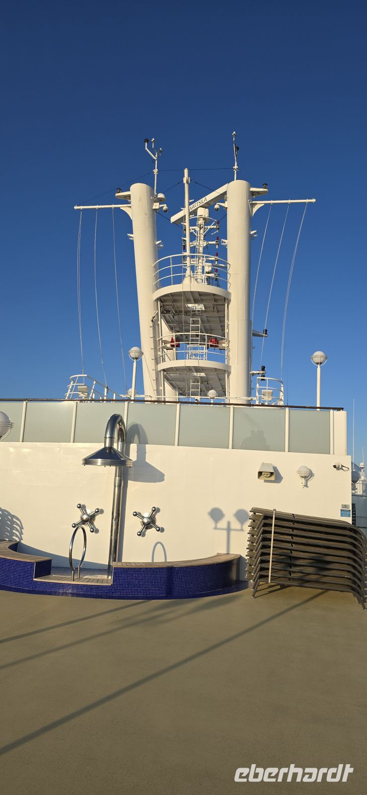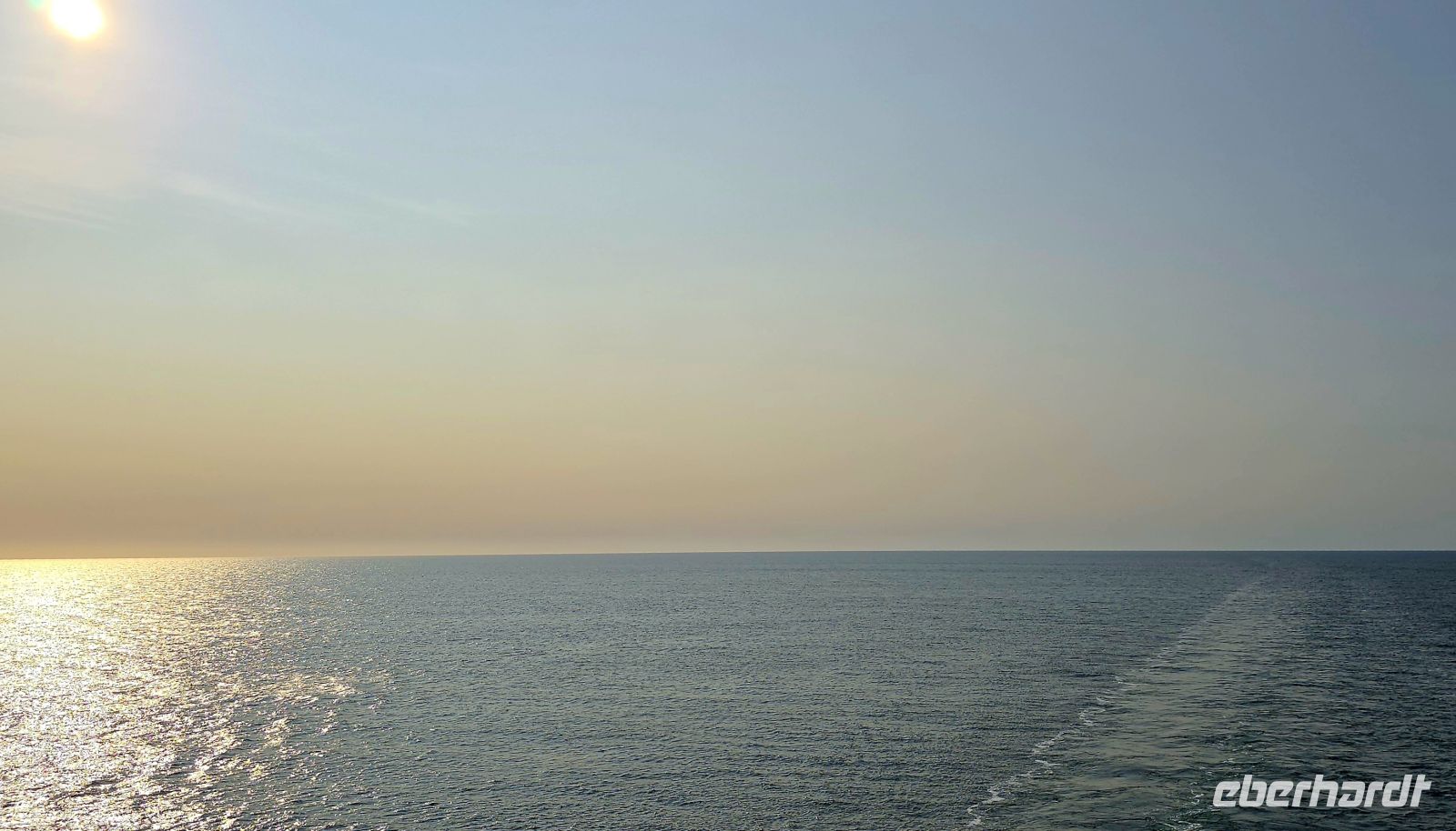 Der Morgen begrüßt uns mit strahlend blauem Himmel – ganz anders als es die Vorhersage noch prophezeit hatte. Die Luft ist klar, die Weite des Meeres scheint unendlich, und nur am Horizont zieht gemächlich ein weiteres Kreuzfahrtschiff vorbei. Heute beginnt alles etwas später: Die Zeitumstellung und der erste volle Seetag lassen Raum für Ruhe und Entspannung.