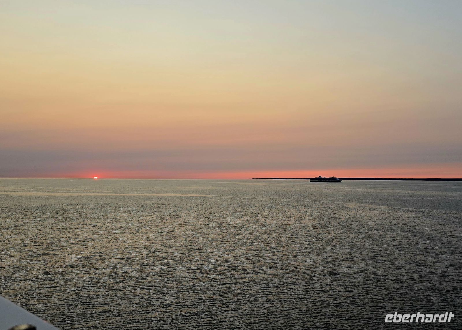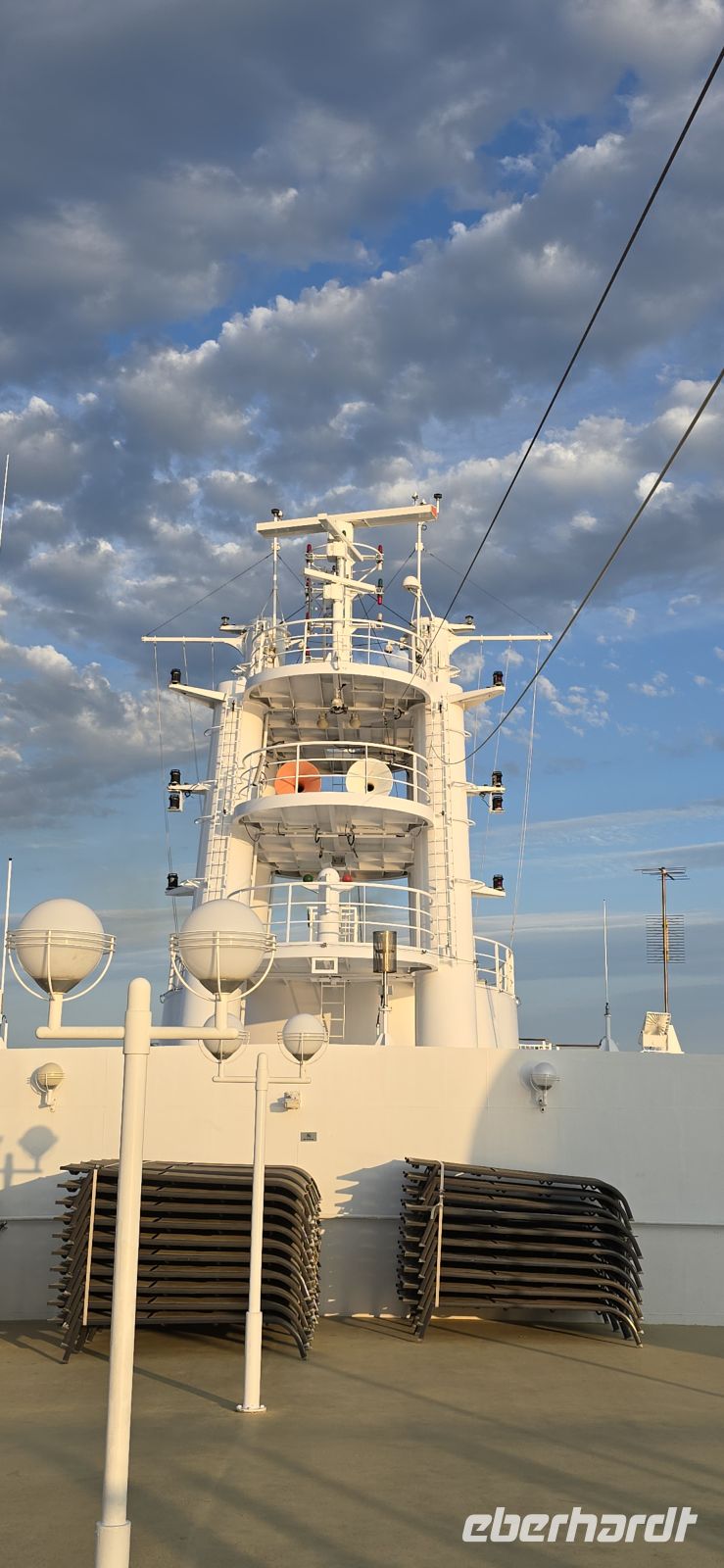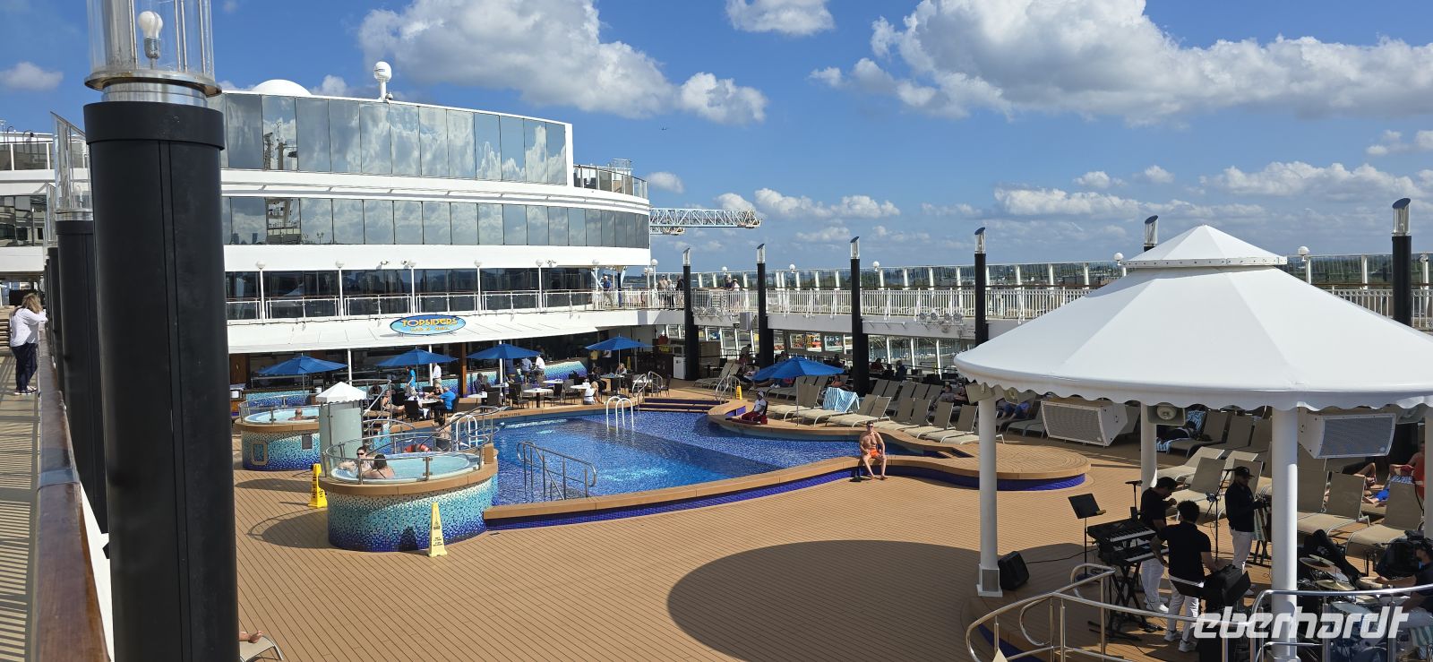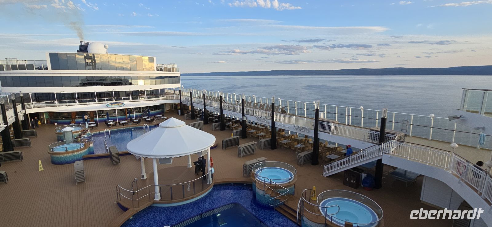 Der Morgen begrüßt uns mit strahlend blauem Himmel – ganz anders als es die Vorhersage noch prophezeit hatte. Die Luft ist klar, die Weite des Meeres scheint unendlich, und nur am Horizont zieht gemächlich ein weiteres Kreuzfahrtschiff vorbei. Heute beginnt alles etwas später: Die Zeitumstellung und der erste volle Seetag lassen Raum für Ruhe und Entspannung.