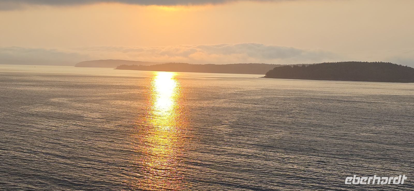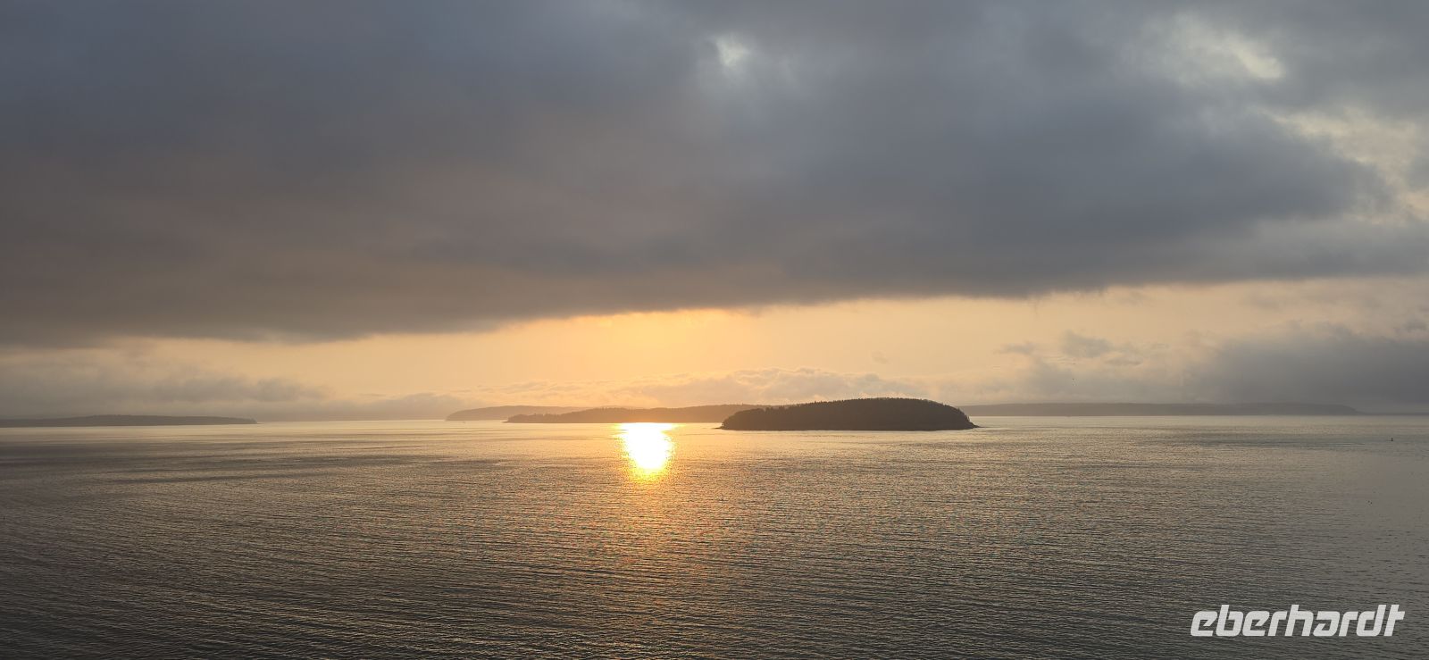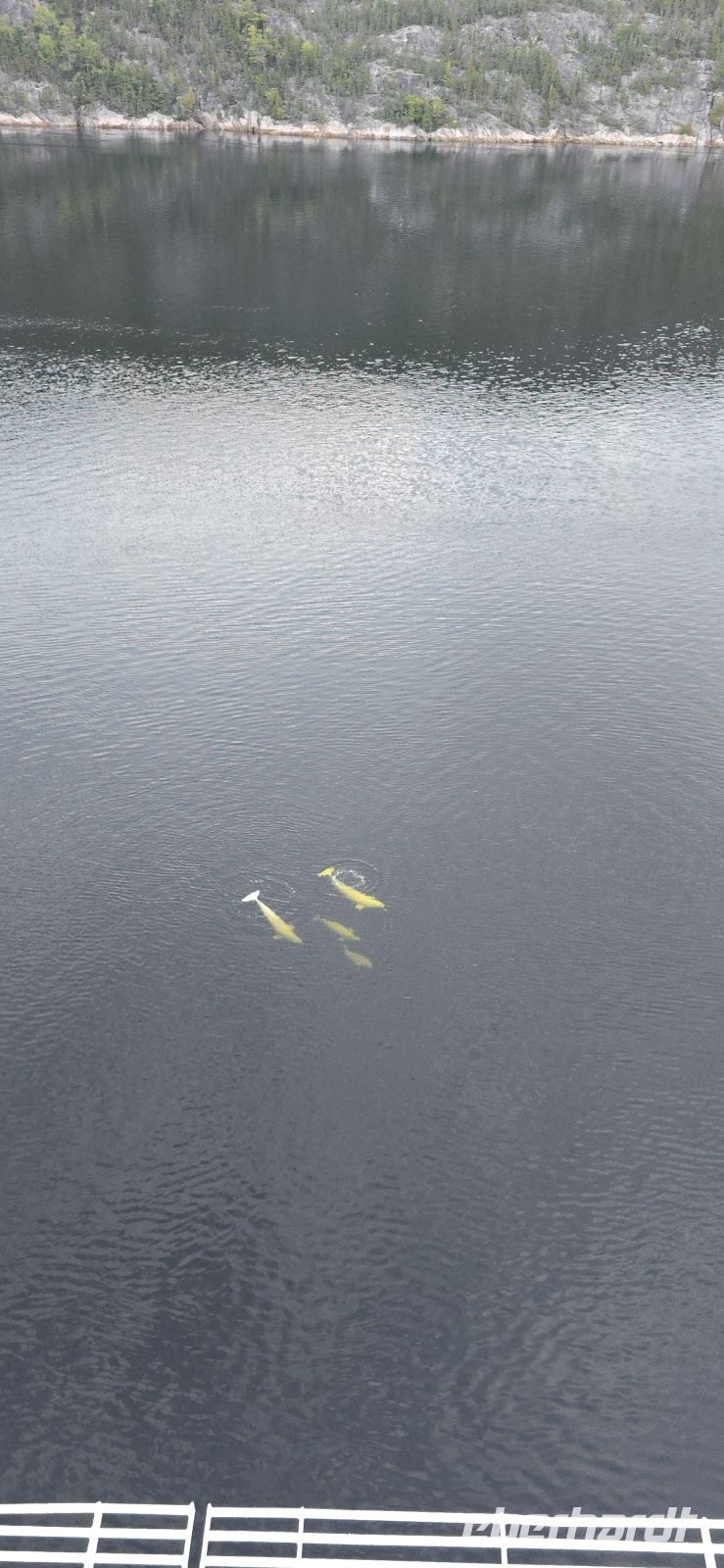 Heute lohnt sich das frühe Aufstehen! Schon um 6 Uhr morgens gleiten wir in den Saguenay Fjord hinein – ein Schauspiel der Natur, das man so schnell nicht vergisst. Sanftes Morgenlicht taucht die steilen Felswände in warme Farben, und zur Krönung zeigen sich mehrere Beluga-Wale in der St. Margaret Bucht, die als Kinderstube dieser seltenen Tiere gilt. Ein großes Glück, sie beobachten und sogar fotografieren zu können.
