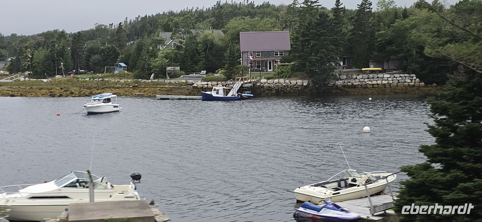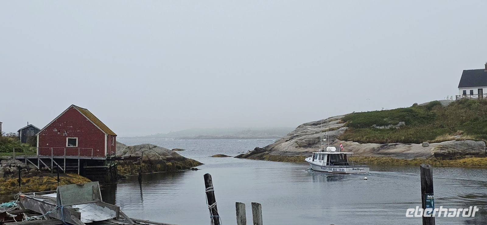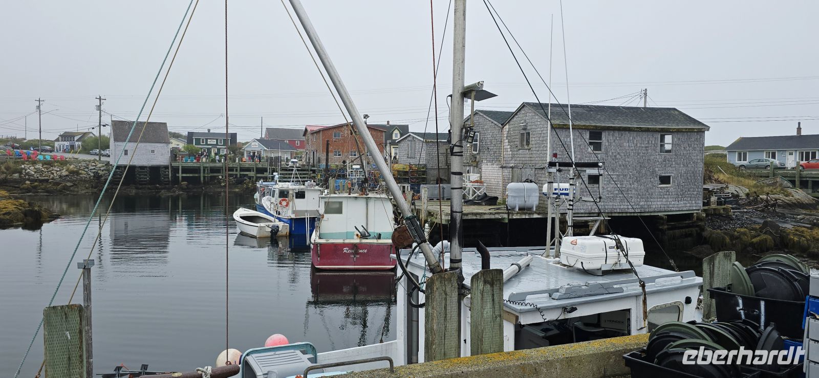 Am Nachmittag zieht Bewölkung auf, und die Fahrt nach Peggy’s Cove verläuft unter grauem Himmel mit leichtem Nieselregen. Doch die Küste selbst mit ihren kleinen Hummerfischereien macht die Fahrt besonders. Peggy’s Cove – so viel wie „Peggys Küste“ – entpuppt sich als winziger, aber überaus pittoresker Ort, der vom Tourismus regelrecht belagert wird. Kein Wunder, denn die bunten Fischerhäuschen und der Leuchtturm auf den gewaltigen Granitfelsen sind ein Postkartenmotiv par excellence. Trotz Regen lassen wir uns nicht davon abhalten, am berühmten Tony’s Kiosk eine köstliche Lobster Roll zu probieren.