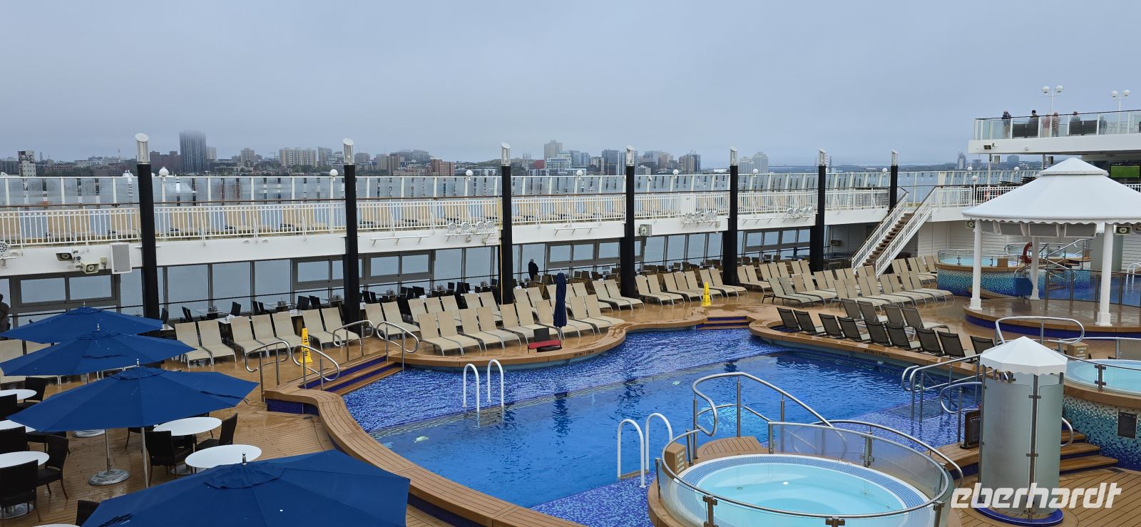 Am Nachmittag versammelten wir uns bei Sonnenschein und warmem Wetter mit einem „Sail Away Drink“ auf dem Pooldeck. Während das Schiff langsam den Hafen verließ und Kurs auf unsere Route nahm, genossen wir die Aussicht und die entspannte Atmosphäre an Bord.