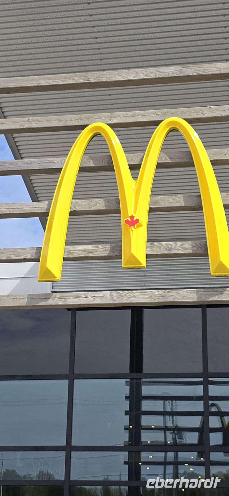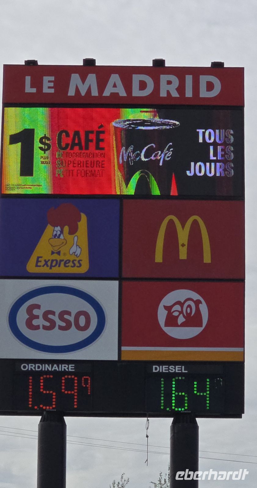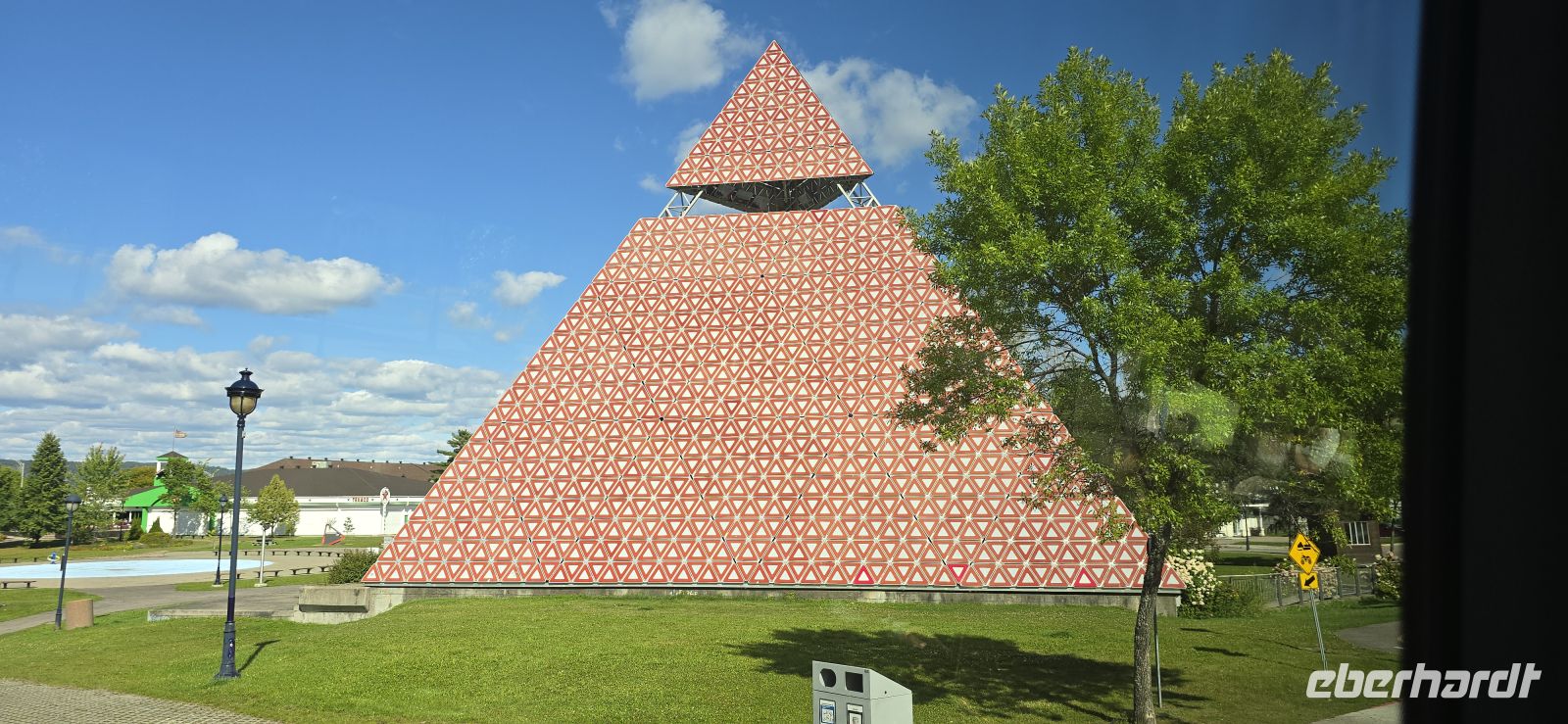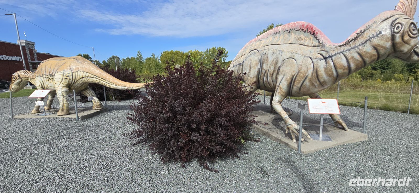 Gegen Mittag erwartet uns ein komfortabler Reisebus, in dem jeder gleich vier Sitze für sich nutzen kann – viel Platz zum Entspannen! Unsere Fahrt führt uns über den St.-Lorenz-Strom und entlang des berühmten *Trans-Canada-Highway*. Unterwegs legen wir eine Pause im *Le Madrid* ein, wo die originelle Dinosaurier-Ausstellung für Aufsehen sorgt.