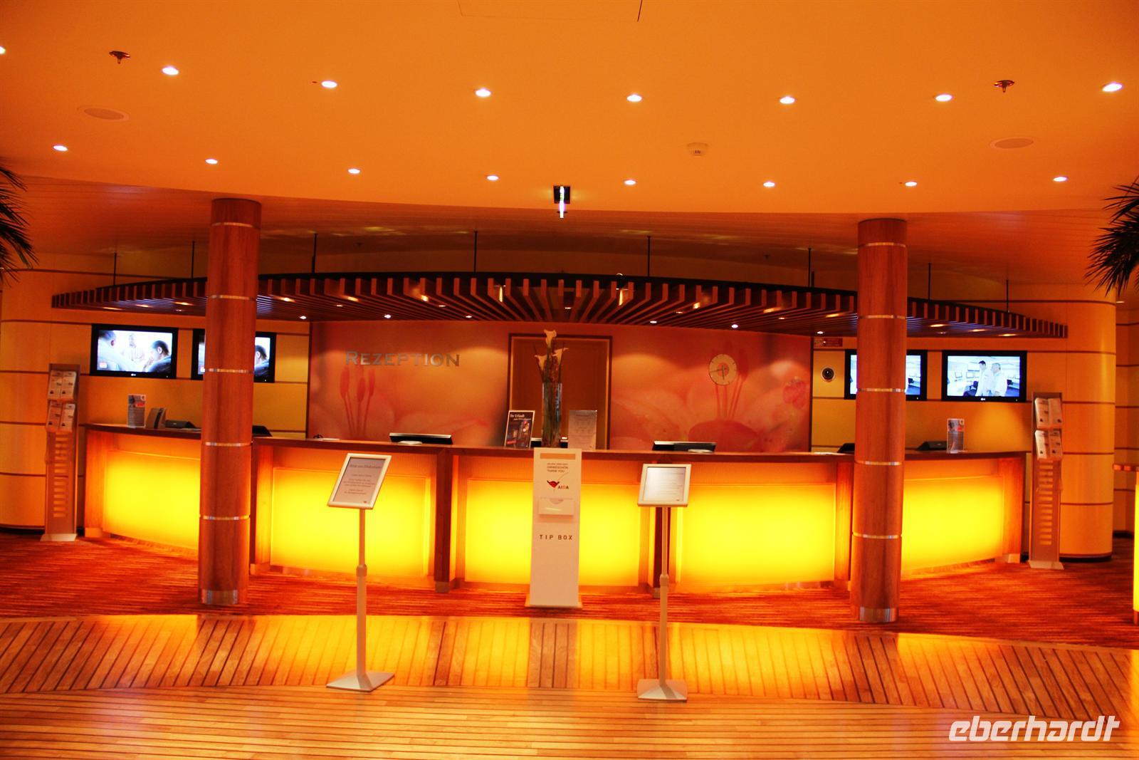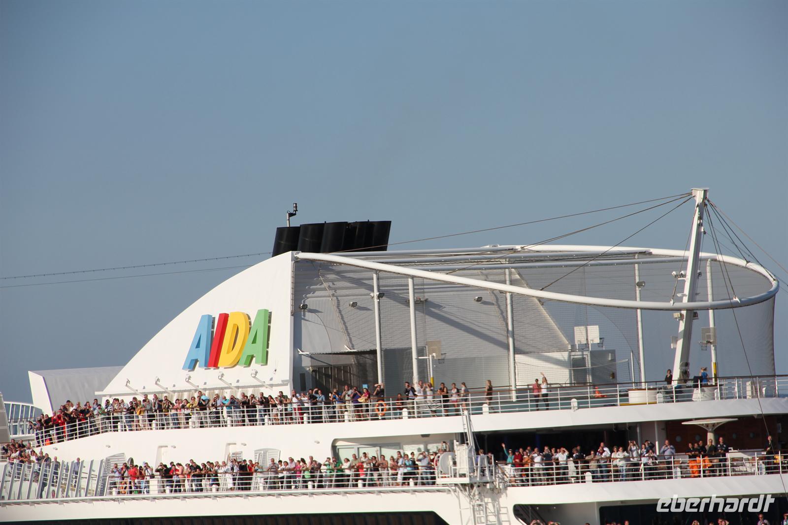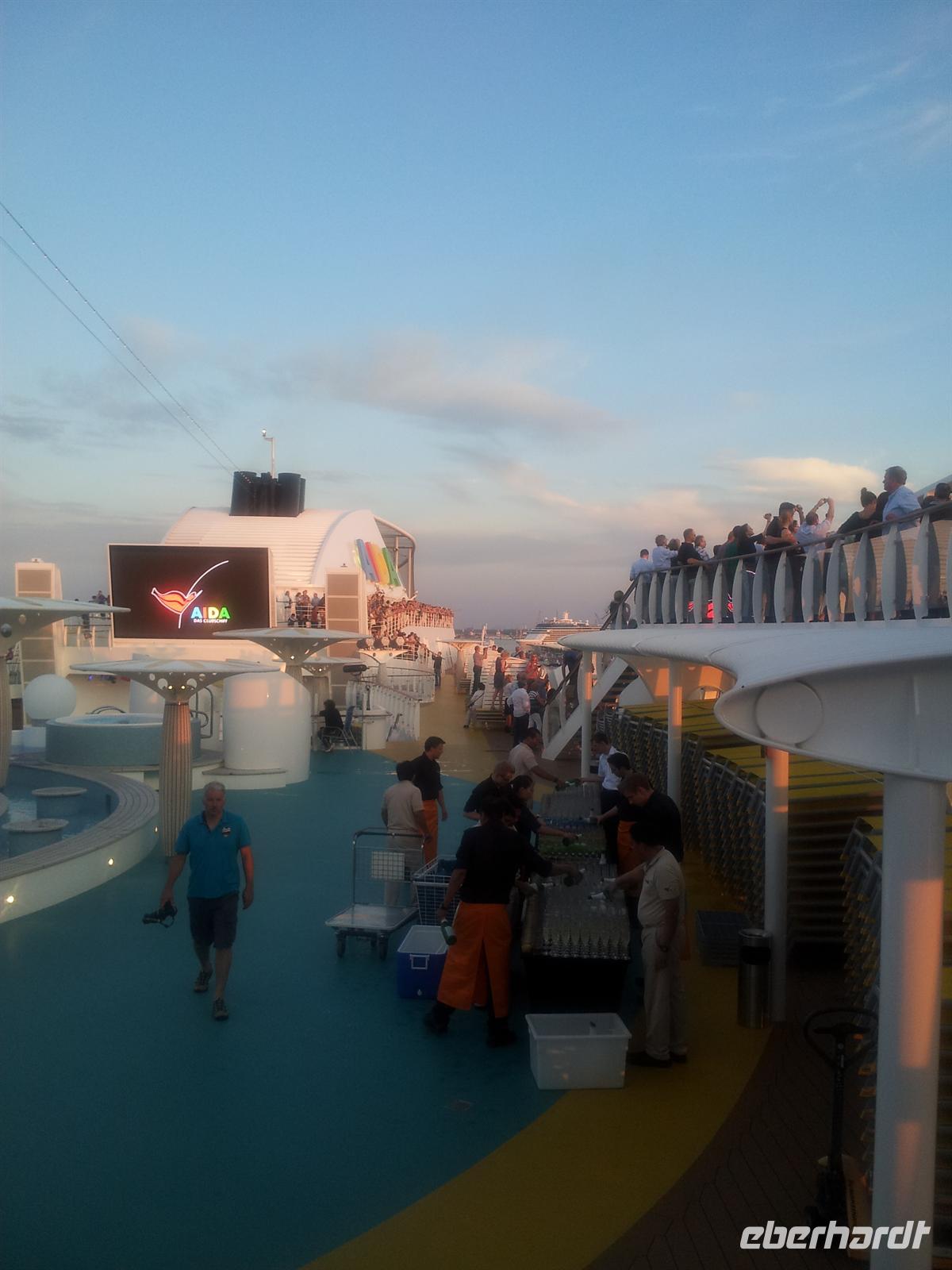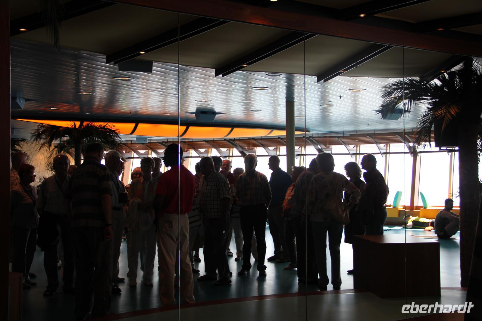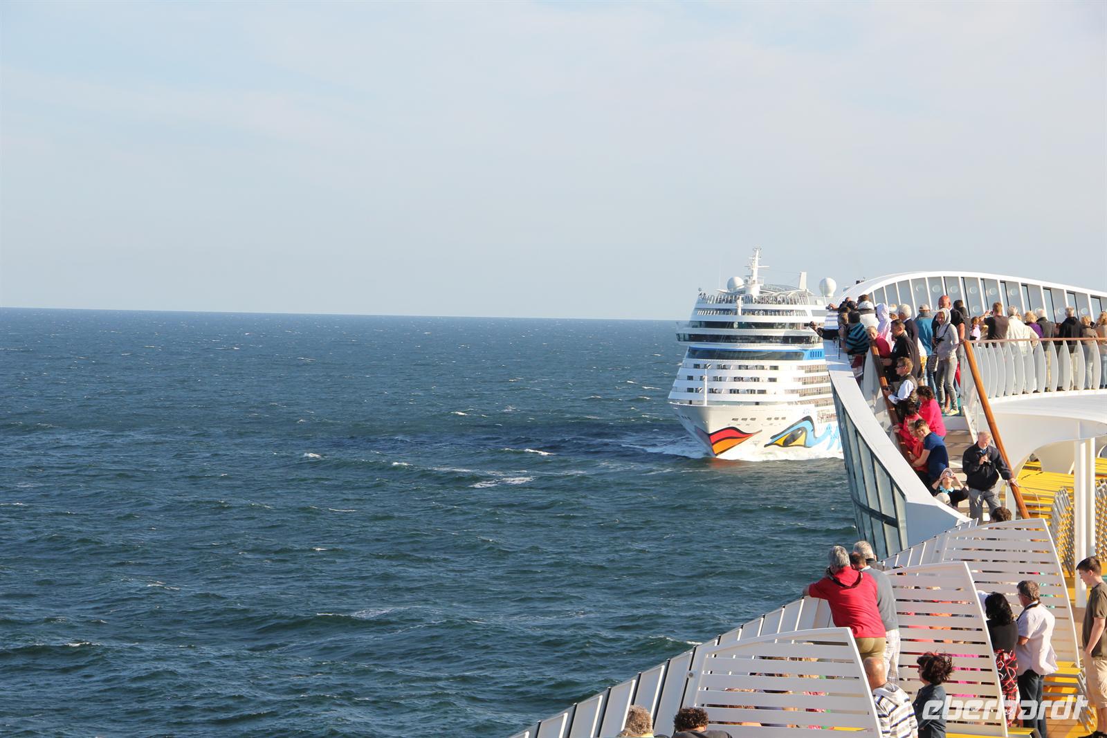 Nachdem wir die Uhr in der letzten Nacht eine Stunde vorstellen mussten - schließlich fahren wir immerzu gen Osten - hatten wir wieder die Auswahl: wo geht man frühstücken? Sogar für Frühaufsteher war ab um sechs gesorgt. Danach konnten wir uns wieder den Annehmlichkeiten des Schiffes hingeben bevor es um elf hieß: „Bitte alle in die AIDA Lounge.“Dort wartete der Hotel Manager Gregor Landmesser bereits auf uns um sie noch einmal herzlich willkommen zu heißen. Bei einem privaten Sektempfang nur für unsere Eberhardt-Gäste konnten die ersten Eindrücke ausgetauscht werden. Der anschließende Schiffsrundgang durfte natürlich - besonders für AIDA-Neulinge - nicht fehlen. Unser Guide Samuel führte uns durch die Decks des Schiffes, angefangen bei der AIDA Lounge, vorbei an der AIDA Bar zum Kasino, weiter zu den verschiedenen Restaurants, der Anytime Bar sowie dem Body & Soul Spa und Sport Bereich. Den Schluss unserer Führung bildete das 4D Kino, in dem Kurzfilme wie auch längere Filme während der Schiffsreise gespielt werden. Mit Witz und Humor wurde uns das Schiff somit ein Stück näher gebracht und wir lernten wieder ein sympathisches Gesicht der Crew kennen.Am Abend wurden dann alle AIDA-Gäste ins Theatrium gebeten, wo der Kapitän seine Offiziere vorstellte. Hier konnte man einen sehr lustigen Eindruck von dem obersten Mann an Bord gewinnen und mit seinem Charme und der lockeren Art begeisterte er alle Gäste.