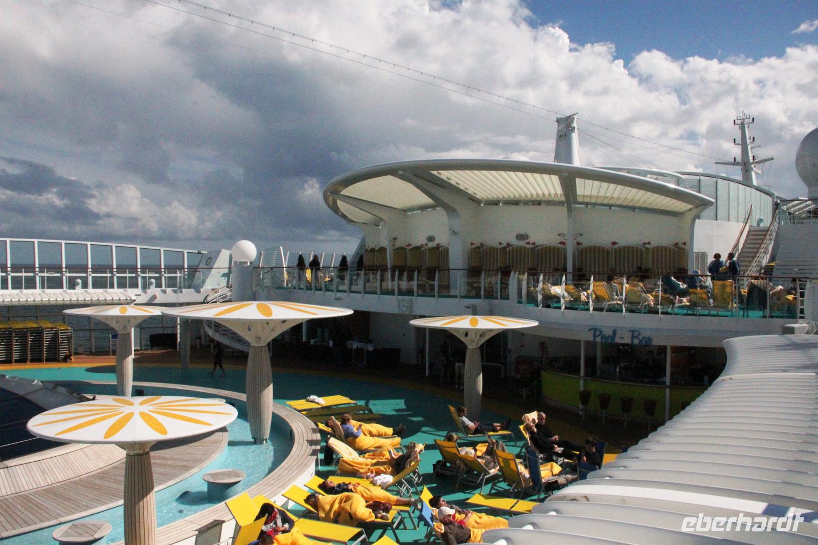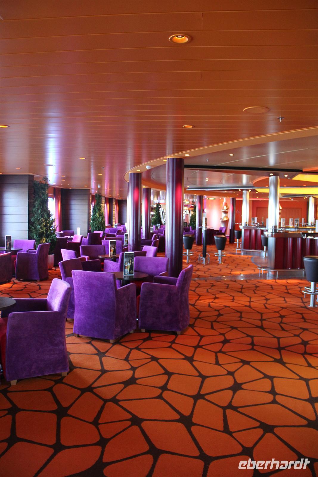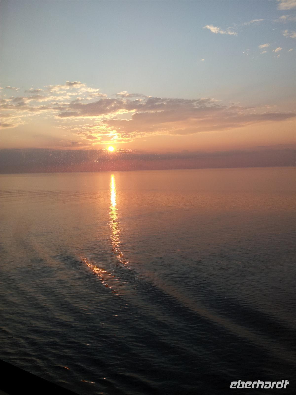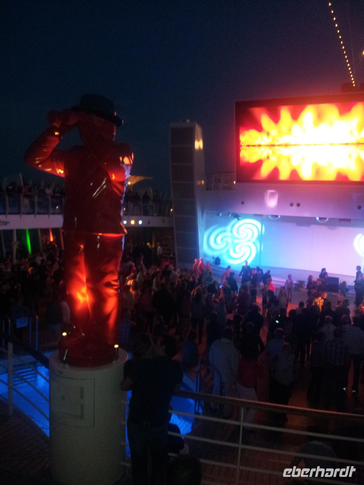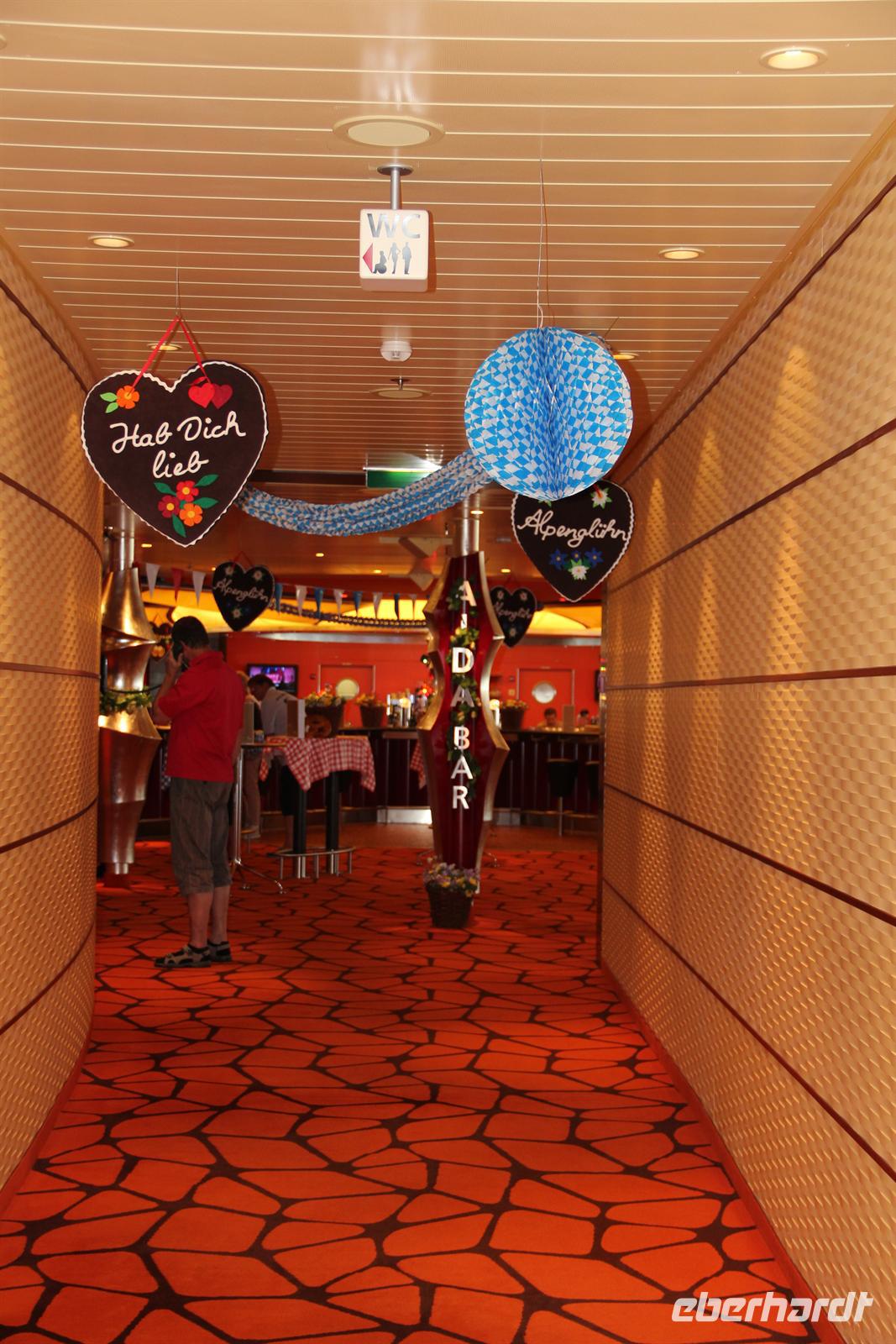 Nachdem wir die Uhr in der letzten Nacht eine Stunde vorstellen mussten - schließlich fahren wir immerzu gen Osten - hatten wir wieder die Auswahl: wo geht man frühstücken? Sogar für Frühaufsteher war ab um sechs gesorgt. Danach konnten wir uns wieder den Annehmlichkeiten des Schiffes hingeben bevor es um elf hieß: „Bitte alle in die AIDA Lounge.“Dort wartete der Hotel Manager Gregor Landmesser bereits auf uns um sie noch einmal herzlich willkommen zu heißen. Bei einem privaten Sektempfang nur für unsere Eberhardt-Gäste konnten die ersten Eindrücke ausgetauscht werden. Der anschließende Schiffsrundgang durfte natürlich - besonders für AIDA-Neulinge - nicht fehlen. Unser Guide Samuel führte uns durch die Decks des Schiffes, angefangen bei der AIDA Lounge, vorbei an der AIDA Bar zum Kasino, weiter zu den verschiedenen Restaurants, der Anytime Bar sowie dem Body & Soul Spa und Sport Bereich. Den Schluss unserer Führung bildete das 4D Kino, in dem Kurzfilme wie auch längere Filme während der Schiffsreise gespielt werden. Mit Witz und Humor wurde uns das Schiff somit ein Stück näher gebracht und wir lernten wieder ein sympathisches Gesicht der Crew kennen.Am Abend wurden dann alle AIDA-Gäste ins Theatrium gebeten, wo der Kapitän seine Offiziere vorstellte. Hier konnte man einen sehr lustigen Eindruck von dem obersten Mann an Bord gewinnen und mit seinem Charme und der lockeren Art begeisterte er alle Gäste.