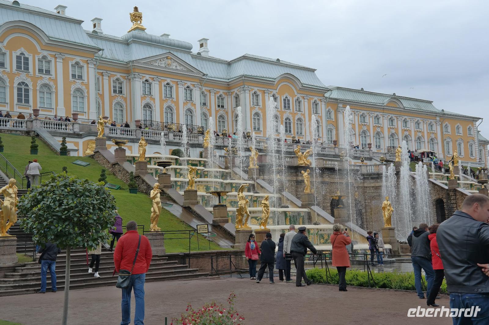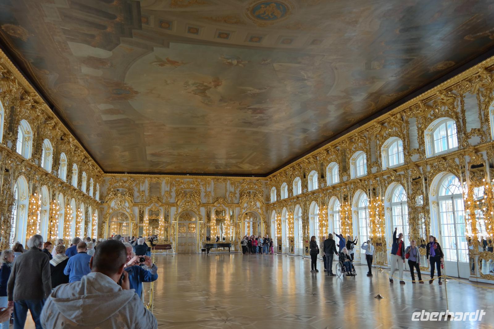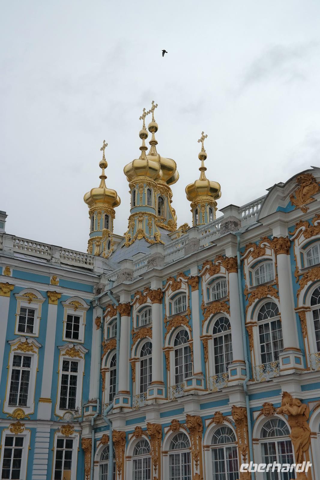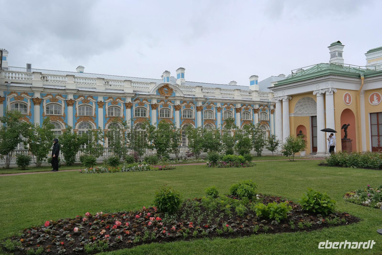 Der zweite Tag in St. Petersburg verlief wettertechnisch nicht viel besser als der erste. Mit Nieselregen und Wind wurden wir zu unseren Ausflügen begrüßt. Nicole hat dieses Mal den Ausflug „Katharinenpalast und Bootsfahrt auf der Newa" begleitet und ich den Ausflug „Katharinenpalast und Fontänen des Peterhofs". Am Katharinenpalast hatten wir das Glück, dass Kreuzfahrt-Gäste schon eine Stunde eher in die Räumlichkeiten des Palastes durften denn sonst hätten wir wohl den ganzen Vormittag anstehen müssen. So ging es recht flott hinein und während der kurzen Wartezeit wurden wir von russischer Volksmusik, die einige Musiker vor dem Palast spielten, unterhalten.