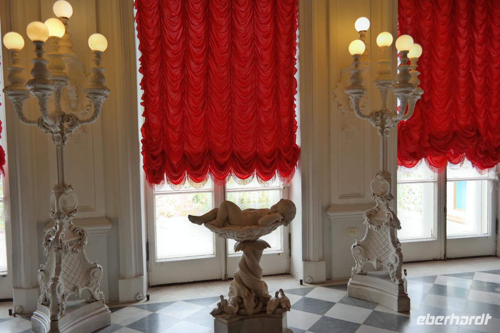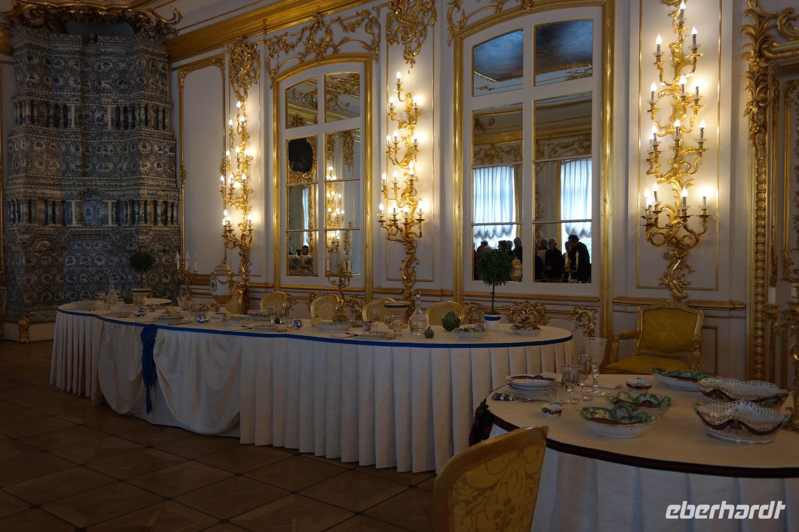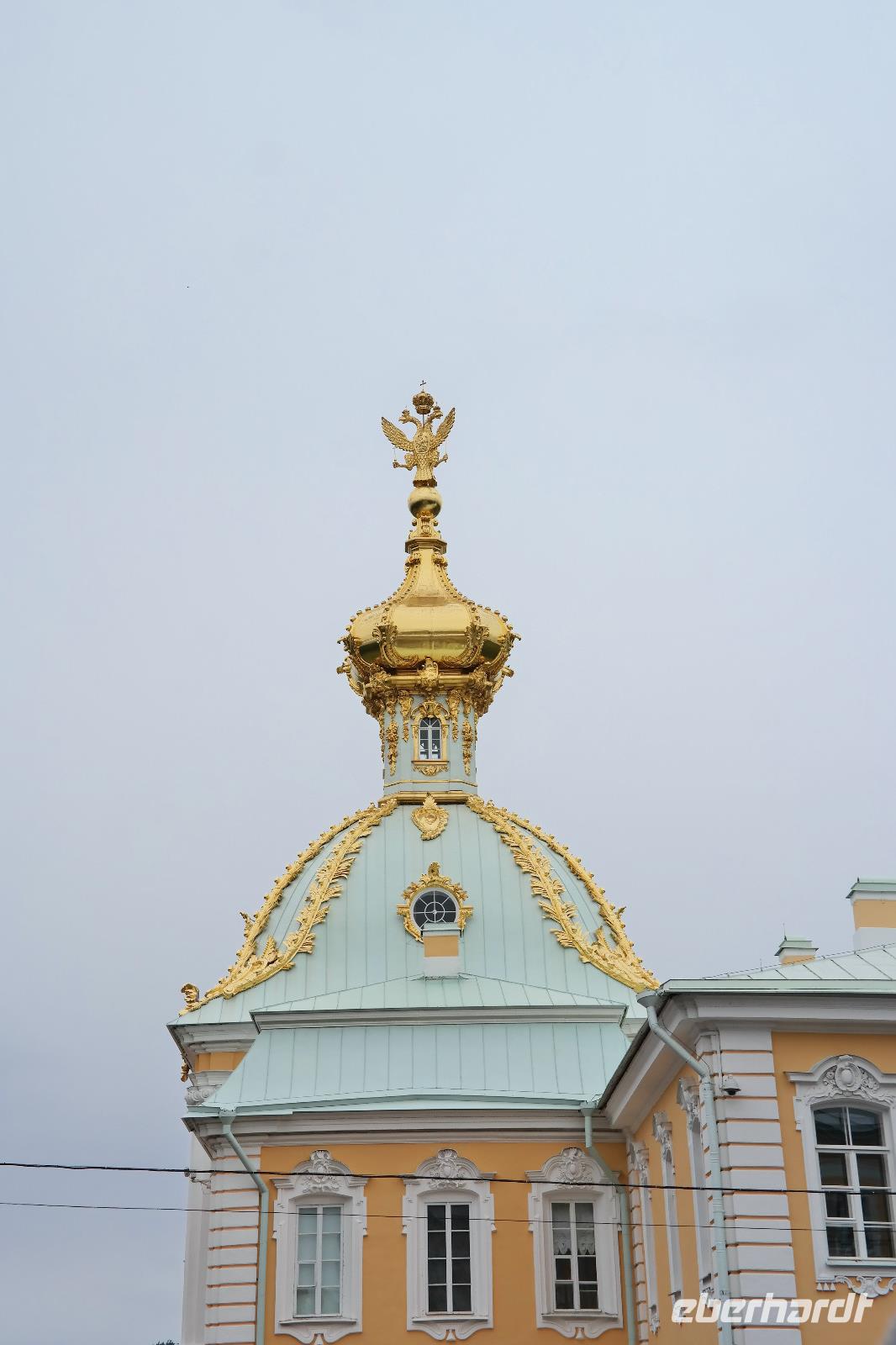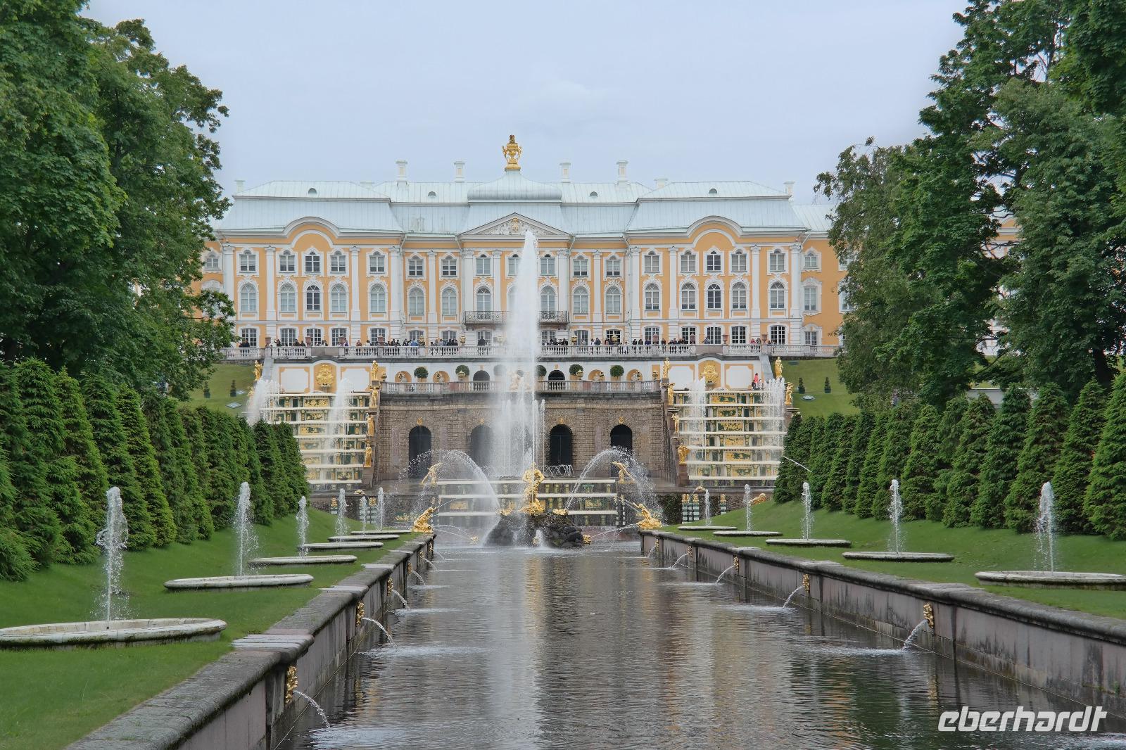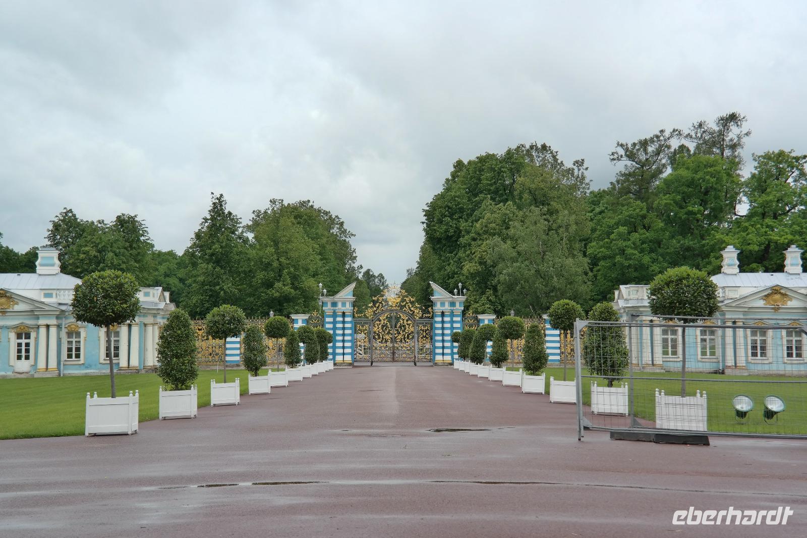 Der zweite Tag in St. Petersburg verlief wettertechnisch nicht viel besser als der erste. Mit Nieselregen und Wind wurden wir zu unseren Ausflügen begrüßt. Nicole hat dieses Mal den Ausflug „Katharinenpalast und Bootsfahrt auf der Newa" begleitet und ich den Ausflug „Katharinenpalast und Fontänen des Peterhofs". Am Katharinenpalast hatten wir das Glück, dass Kreuzfahrt-Gäste schon eine Stunde eher in die Räumlichkeiten des Palastes durften denn sonst hätten wir wohl den ganzen Vormittag anstehen müssen. So ging es recht flott hinein und während der kurzen Wartezeit wurden wir von russischer Volksmusik, die einige Musiker vor dem Palast spielten, unterhalten.