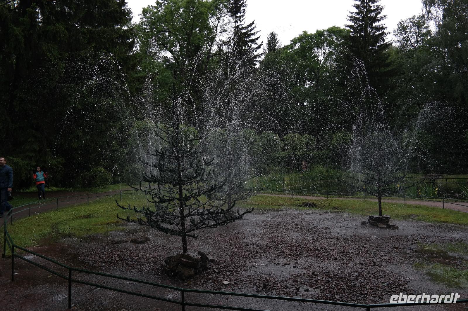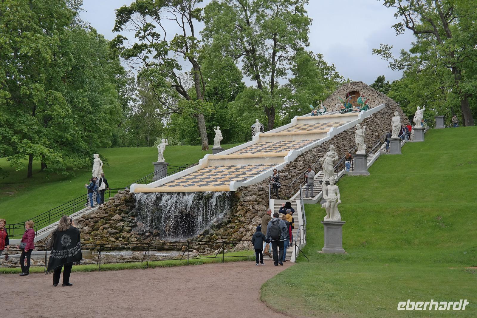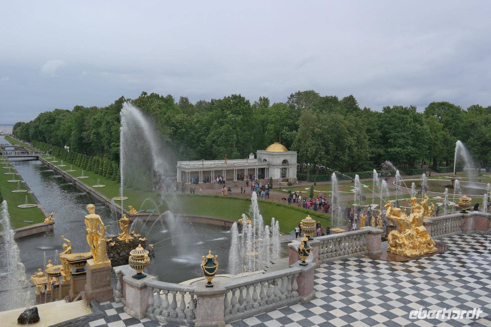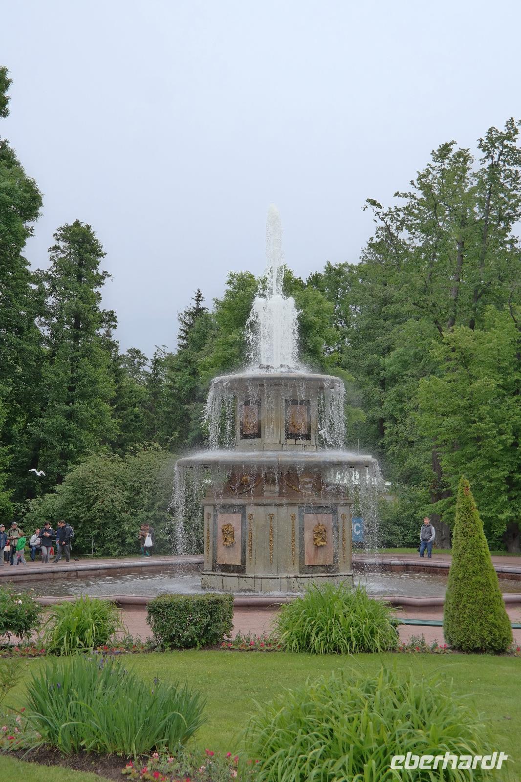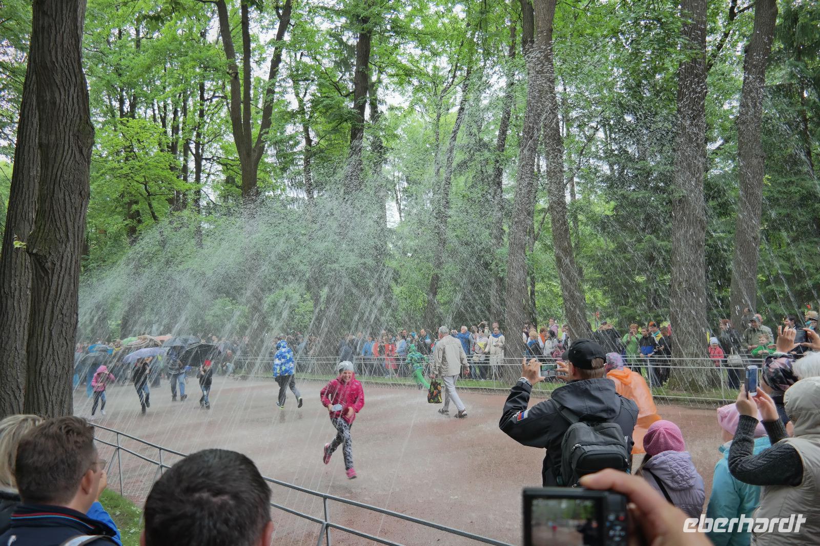 Als wir es dann endlich in den Katharinenpalast geschafft haben, kamen wir gar nicht mehr aus dem Staunen heraus: vergoldete Verzierungen an den Decken und prunkvolle Zimmer egal wohin man sah. Ein Höhepunkt war natürlich das Bernsteinzimmer. Die nachgebauten Bernsteintafeln waren wirklich ein kleines Wunder. Die örtliche Reiseleiterin erzählte uns einige Interessante Fakten über das damalige, sowie das heutige Bernsteinzimmer. So haben zum Beispiel die Restauratoren die Tafeln in mühevoller Arbeit originalgetreu nachgebaut, indem sie die neuen Tafeln in schwarz-weiß fotografierten und die Bilder mit alten Aufnahmen der alten Bernsteintafeln verglichen. Eine wahnsinnige Arbeit die jeden von uns staunen ließ. Nach einem kleinen Spaziergang im Garten des Palastes haben wir uns erst einmal bei einem Mittagessen stärken können. Der Vodka durfte hierbei natürlich auch nicht fehlen. Weiter ging es dann in Richtung Peterhof mit Spaziergang im Garten und natürlich vorbei an den zahlreichen Fontänen. Bei einem ca. 1 ½ stündigen Rundgang durch den Garten konnten wir viele kleinere Fontänen und auch Scherzfontänen sehen, die natürlich vor allem den kleineren Besuchern viel Freude bereiteten. Die schönste Fontäne war aber natürlich die Hauptfontäne direkt vor dem Peterhof. Viele vergoldete und prachtvolle Statuen schmückten das Wasserspiel. Als dann auch noch die Sonne etwas hervor kam, war dies ein toller Anblick denn alles glänzte und war noch ein Stück schöner.