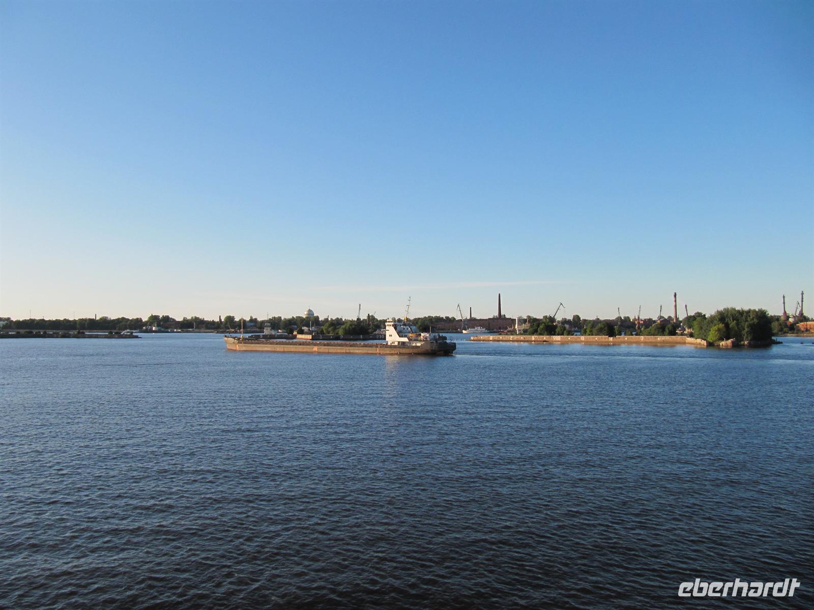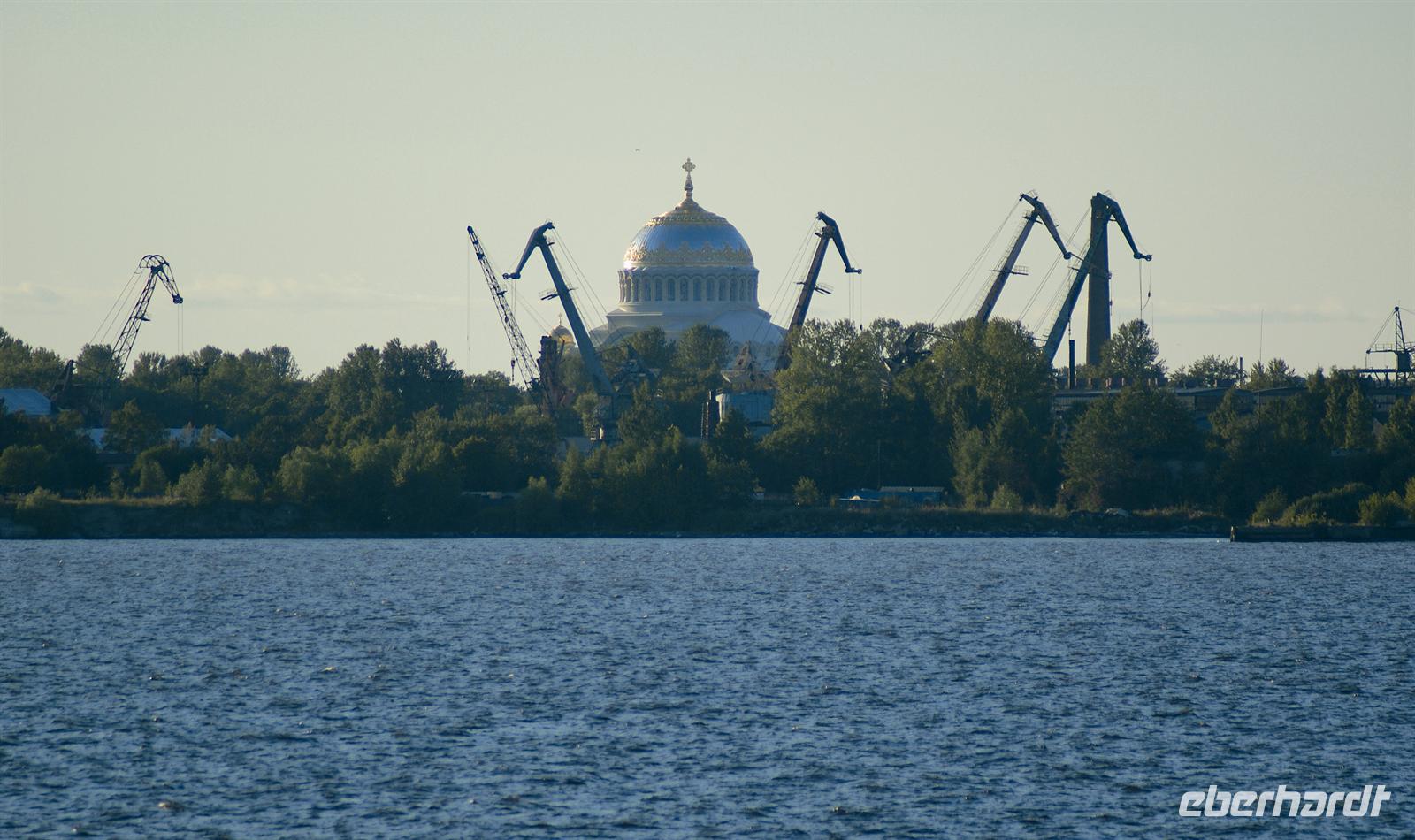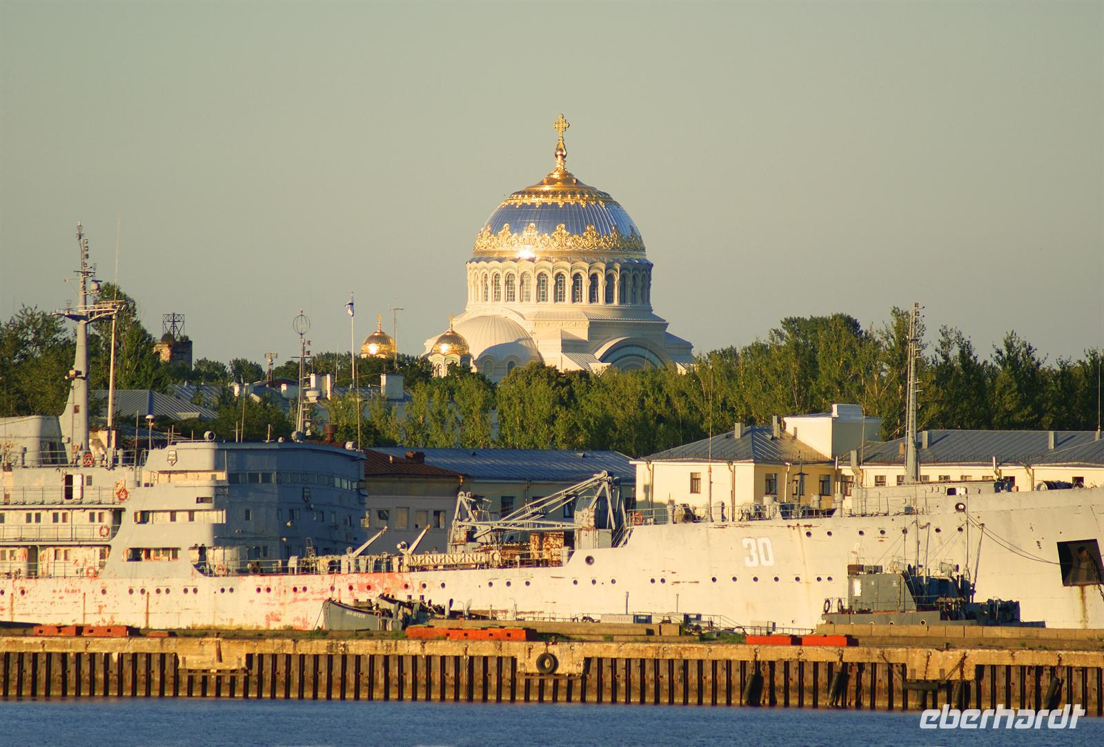 21.00 Uhr standen wir an der Reling und Steuerbord kam Kronstadt auf der Insel Kotlin, nur 30 Kilometer von St. Petersburg entfernt, in Sicht. Bereits von Weitem strahlte uns im Licht der Abendsonne die wuchtige Marine-Kathedrale mit ihrer großen, in frischem Gold glänzenden Kuppel entgegen. Wir sahen zudem die Häfen der Stadt, den Handelshafen und den Militärhafen, sowie die alten Festungsanlagen.
