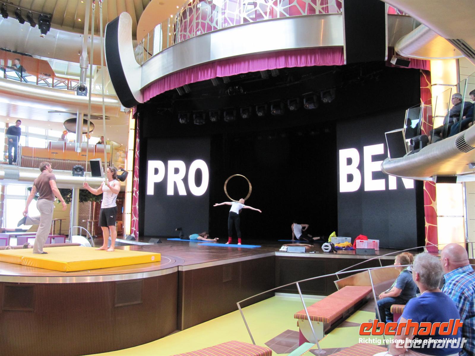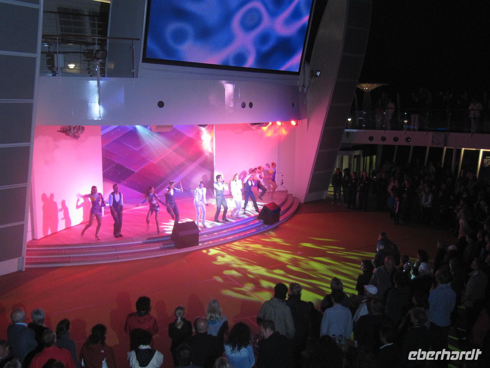 Doch halt - wir hatten einen gemeinsamen Termin. Wir trafen uns mit allen Gästen 17.45 Uhr im Theatrium auf Deck 9 zum Erinnerungsfoto. Der Show-Manager lud uns zum Casting für das AIDA-Show-Ensemble ein ... leider hat keiner von uns das geforderte Spagat auf die berühmten Bretter der AIDA-Welt gezaubert ... Wir nutzten die Gelegenheit, um alle wichtigen Abreiseinformationen an unsere Reisegäste zu übermitteln.