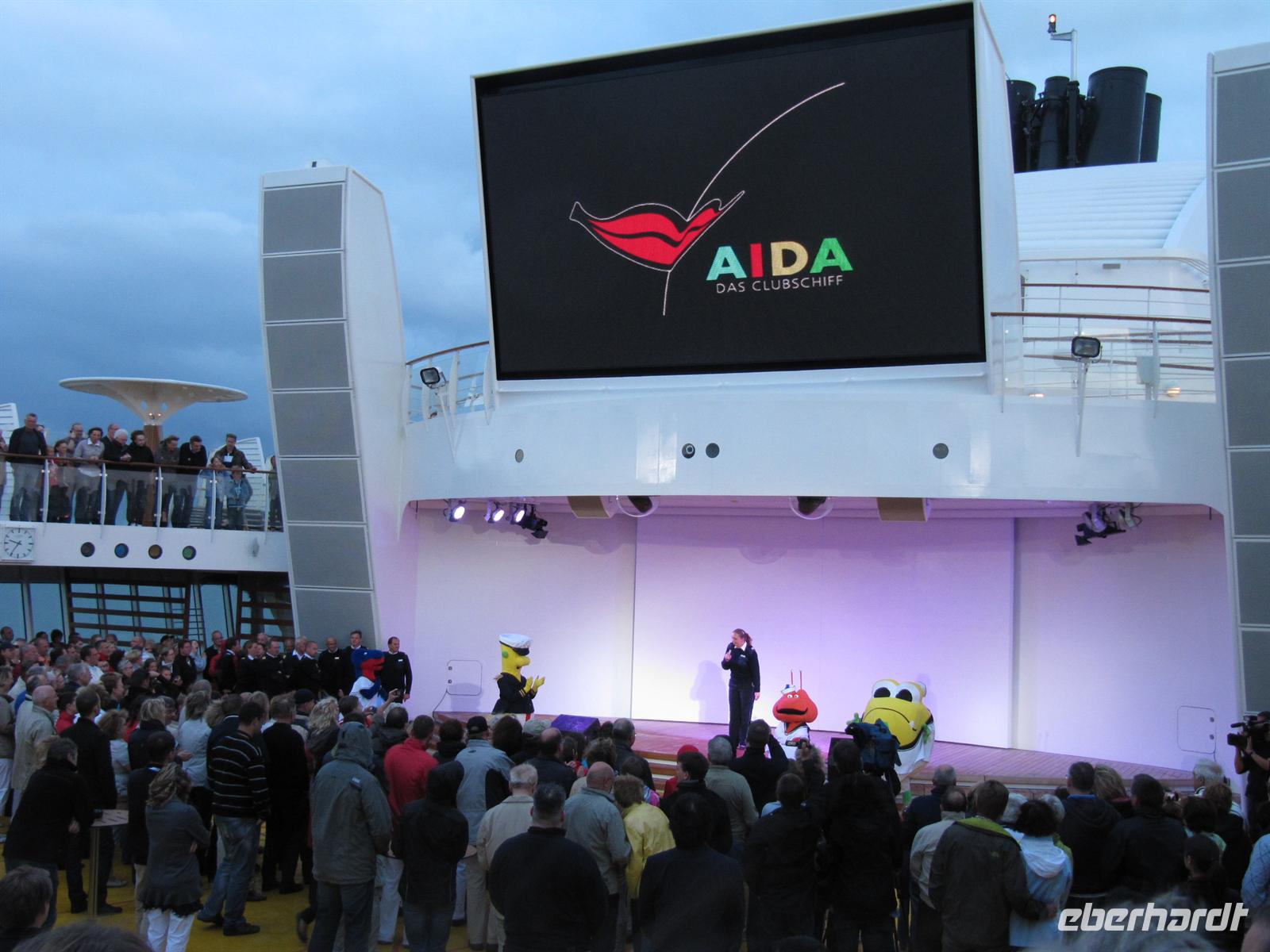 21.30 Uhr war es dann soweit, Kapitän Wieprecht stellte uns seine Offiziere stellvertretend für die gesamte Crew vor. Der Warenmünder erzählte dabei so manche Anekdote . Als erfahrener „Seebär“ ist er seit 1964 auf den Weltmeeren unterwegs. Danach erfreute uns das AIDA-Show-Ensemble zur Poolshow „Best of Blondie“. Nach den Shows im Theatrium, heute waren dies „Einmal noch nach Bombay“ und „Varieté Nostalgia“, erklang auf Deck 9 Live-Musik mit Serpico. So fand auch am heutigen Abend jeder Gast eine seinen Vorstellungen entsprechende Unterhaltung.