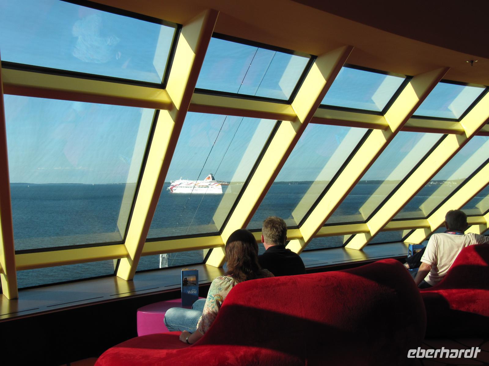 12.00 Uhr trafen wir uns mit unseren Gästen in der AIDA-Bar in der Lounge und stießen mit einem Glas Sekt auf erlebnisreiche Tage unserer Ostsee-Kreuzfahrt an. Alle waren wir voller Vorfreude und voller Erwartungen. Wir übergaben allen Gästen die Informationen für den Eberhardt-Inklusiv-Ausflug am nächsten Tag in Tallinn. Maurice und Martin führten uns anschließend über die AIDAsol, erläuterten uns was Backbord und Steuerbord sind, wo der Bug und das Heck des Schiffes sind und warum die Restaurants sich alle am Heck befinden. Natürlich zeigten sie uns auch die Vielzahl der Bordeinrichtungen: die einzelnen Restaurants, die Bars, das Cafémar, die A-la-carte-Restaurants, den SPA-Bereich, den Fitness-Bereich, die Shops, das 4-D-Kino und das Theatrium. Nun fällt es uns leichter, uns an Bord zu orientieren.