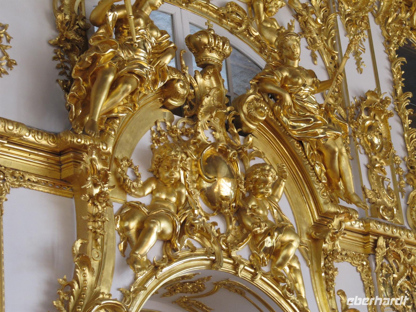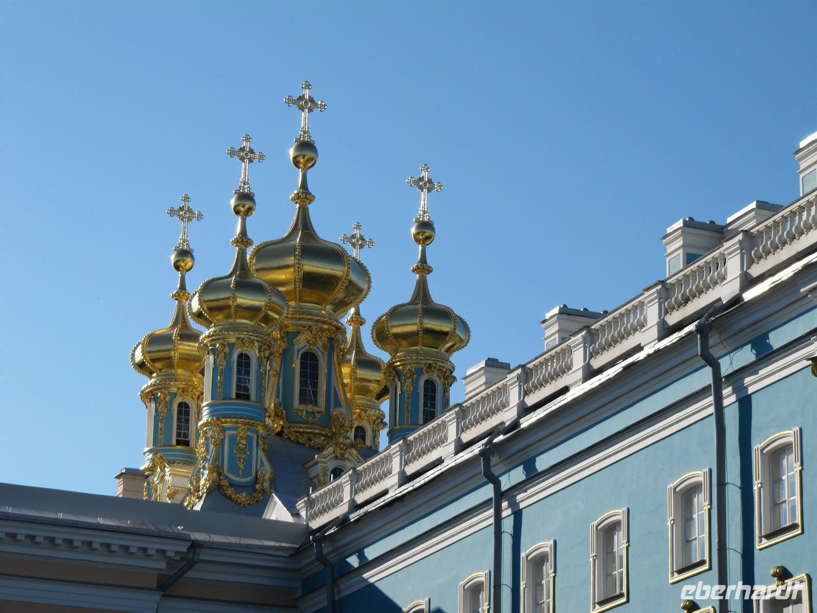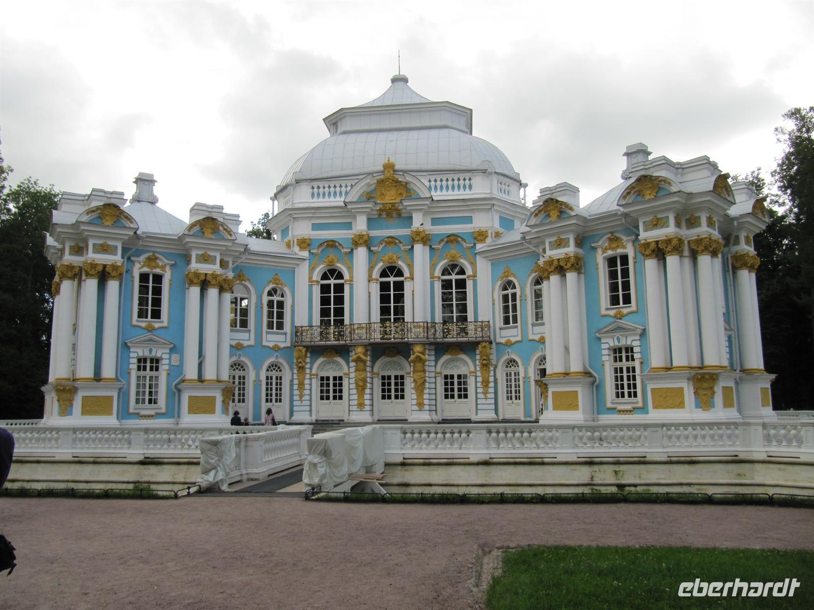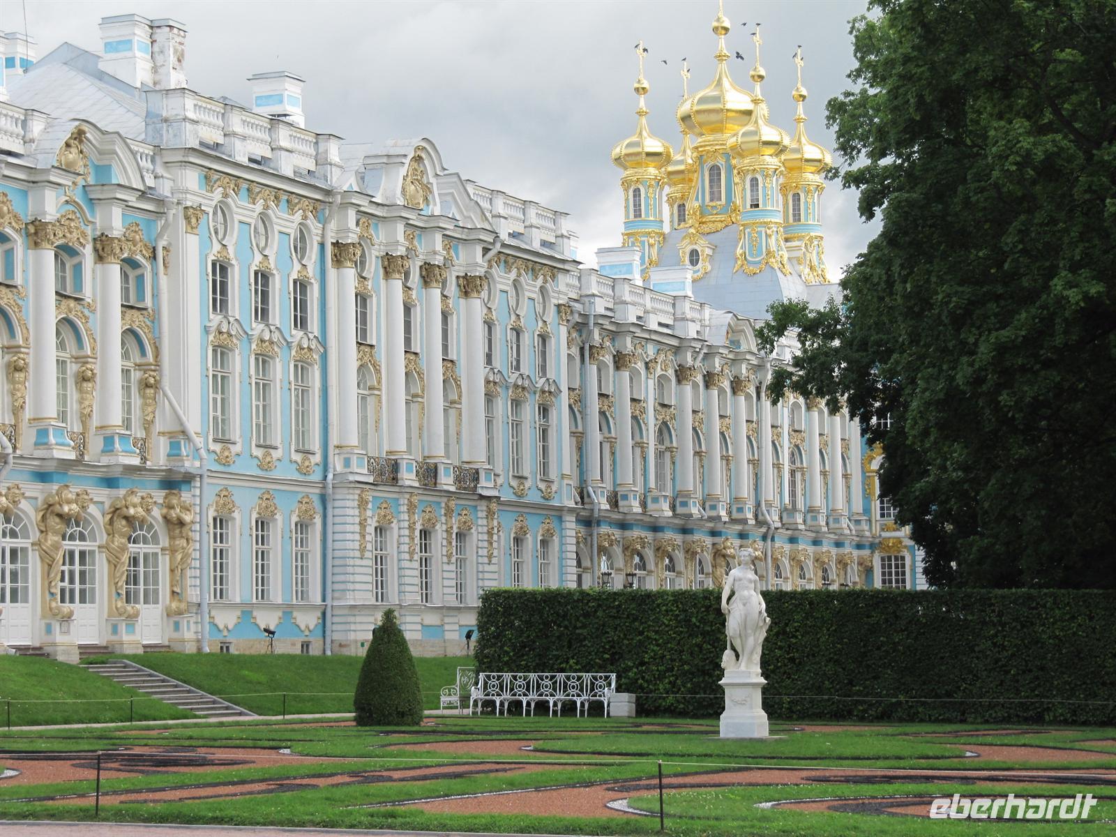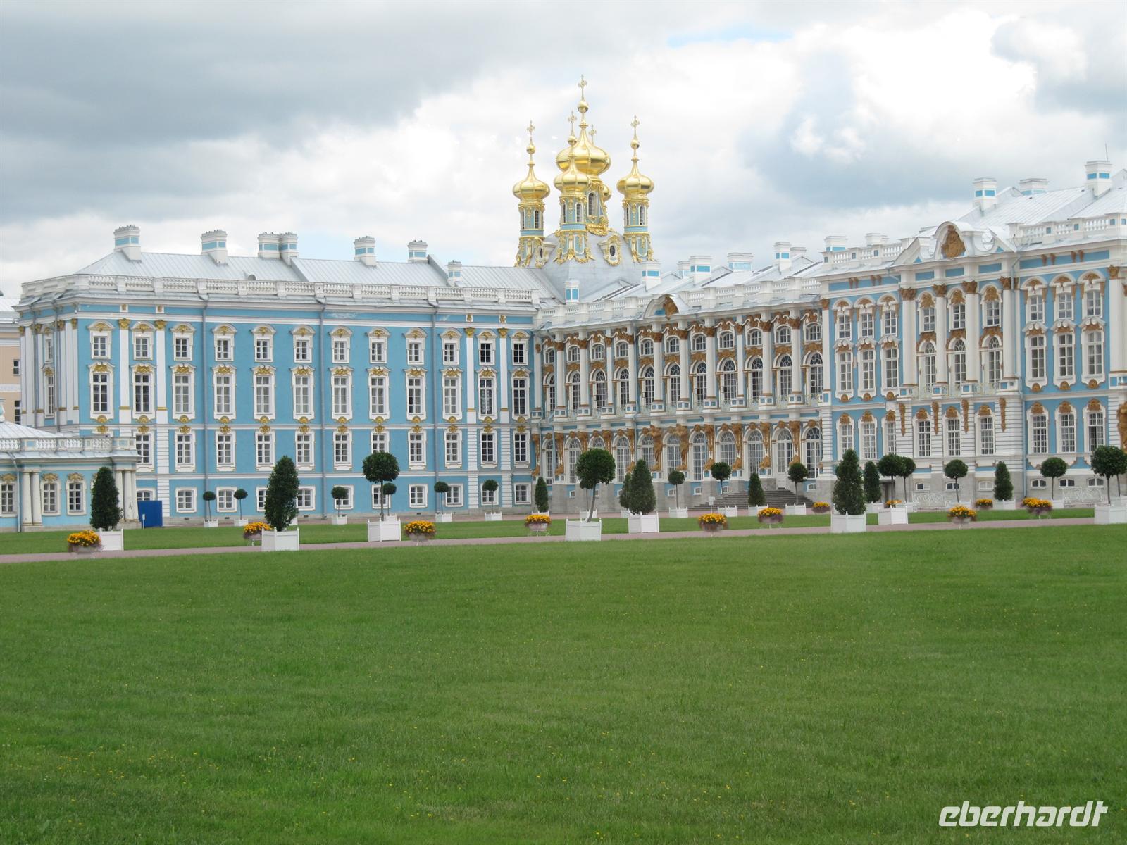 Marion weilte mit ihren Gästen in Zarskoje Sielo, dem ehemaligen Zarendorf und heutigem Puschkin. Unser Ziel war der einzigartige Katharinenpalast. Peter der Große hatte das Land seiner Gattin Katharina I. geschenkt. Als diese dann als Zarin Russland regierte, ließ sie sich einen Palast erbauen. Elisabeth, die Tochter von Peter dem Großen, ließ den Palast erweitern und vergrößern. Rastrelli, der St. Petersburg wesentlich prägte, wurde Mitte des 18. Jahrhunderts zum Architekten für Erweiterungen und den Umbau. Es entstand in Pastellblau und Weiß ein Pendant zum Winterpalais am Schlossplatz - ein Meisterwerk des russischen Barocks. Wir wurden mit Musik empfangen und freuten uns darauf, die prachtvollen Räume zu besichtigen und das legendäre Bernsteinzimmer zu bestaunen. Valentina, unsere Reiseleiterin, hatte uns während der Fahrt nach Puschkin bestens eingestimmt. Wir schritten die Freitreppe hinauf, durch die beeindruckenden Prunksäle, die einzelnen Salons und standen dann im in unterschiedlichen Gelb-Braun-Tönen schimmernden Bernsteinzimmer. Erstaunlich, wie dieses Kunstwerk nachempfunden wurde. Hatten die Restauratoren lediglich alte Schwarz-Weiß-Fotos als Grundlage, um das Zimmer zu rekonstruieren. Eine geduldige Arbeit mit viel Liebe zum Detail war dazu erforderlich. Dies ist auch unter heutigen Bedingungen ein Meisterwerk. Ob das alte Original je wieder auftaucht ist völlig ungewiss, auch wenn im erzgebirgischen Deutsch-Neudorf noch immer Hoffnung bestehen soll ...