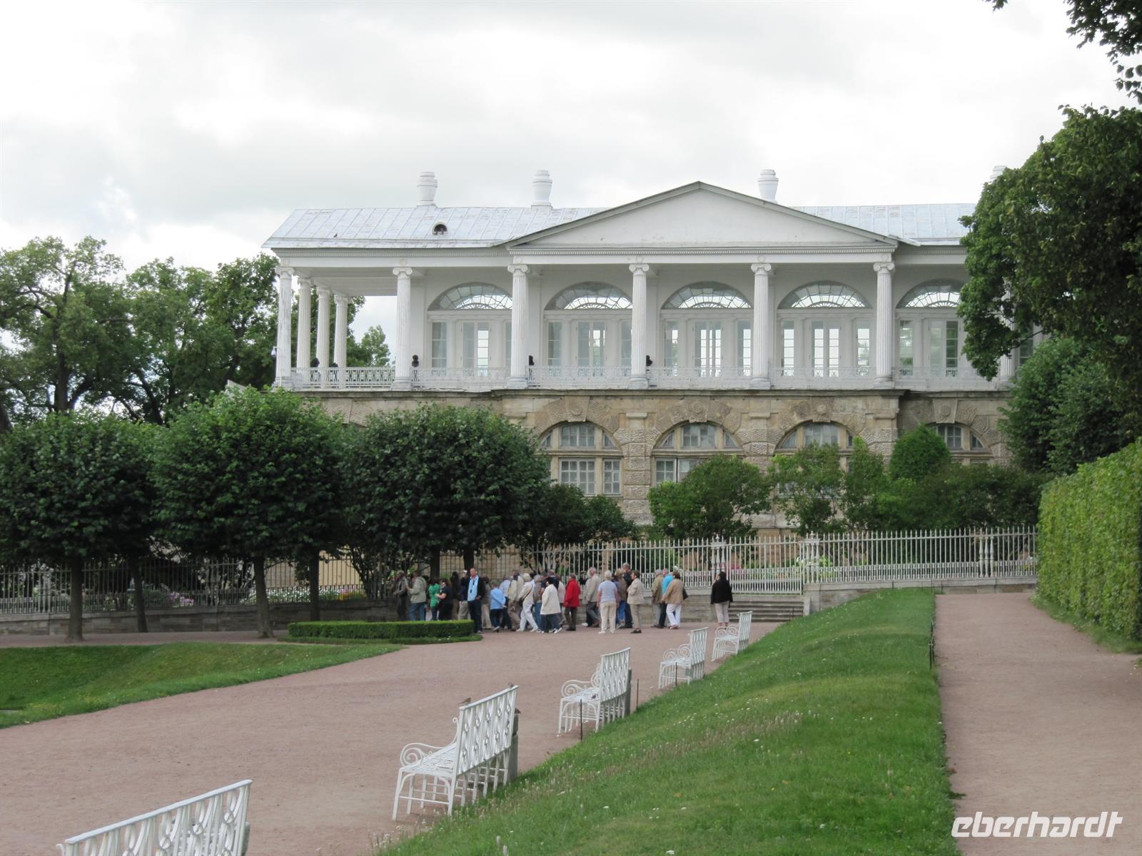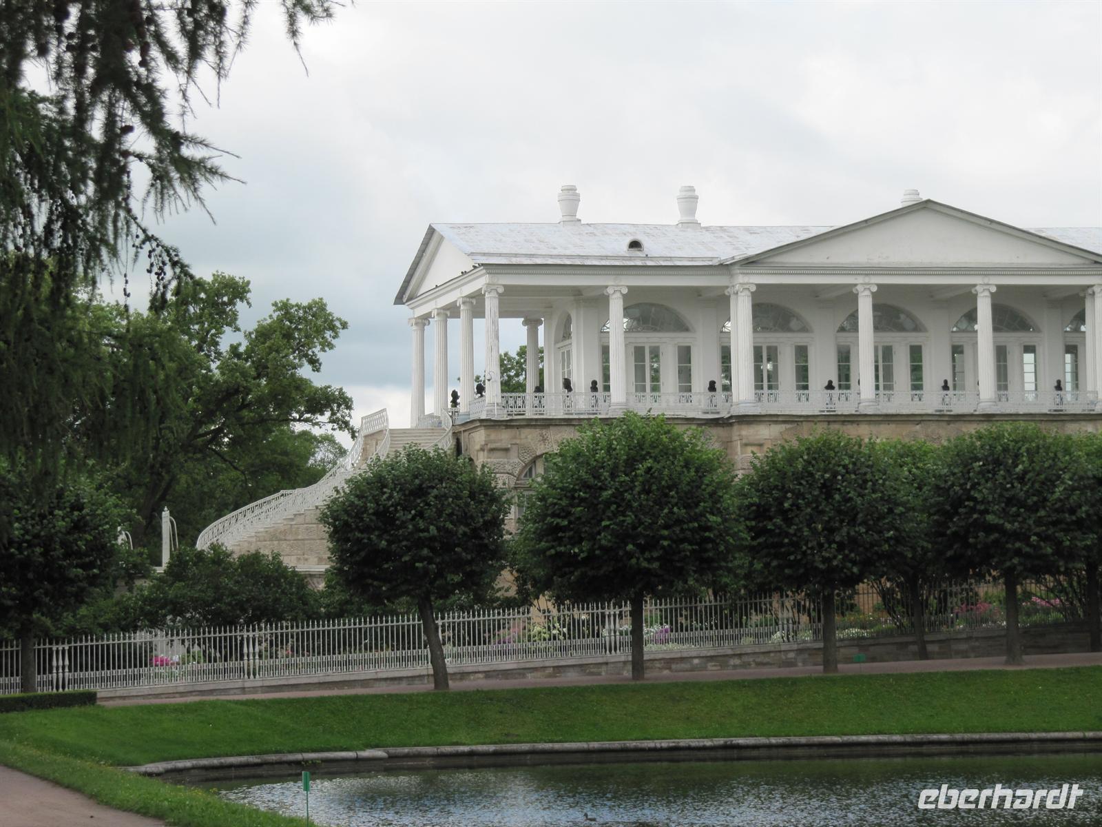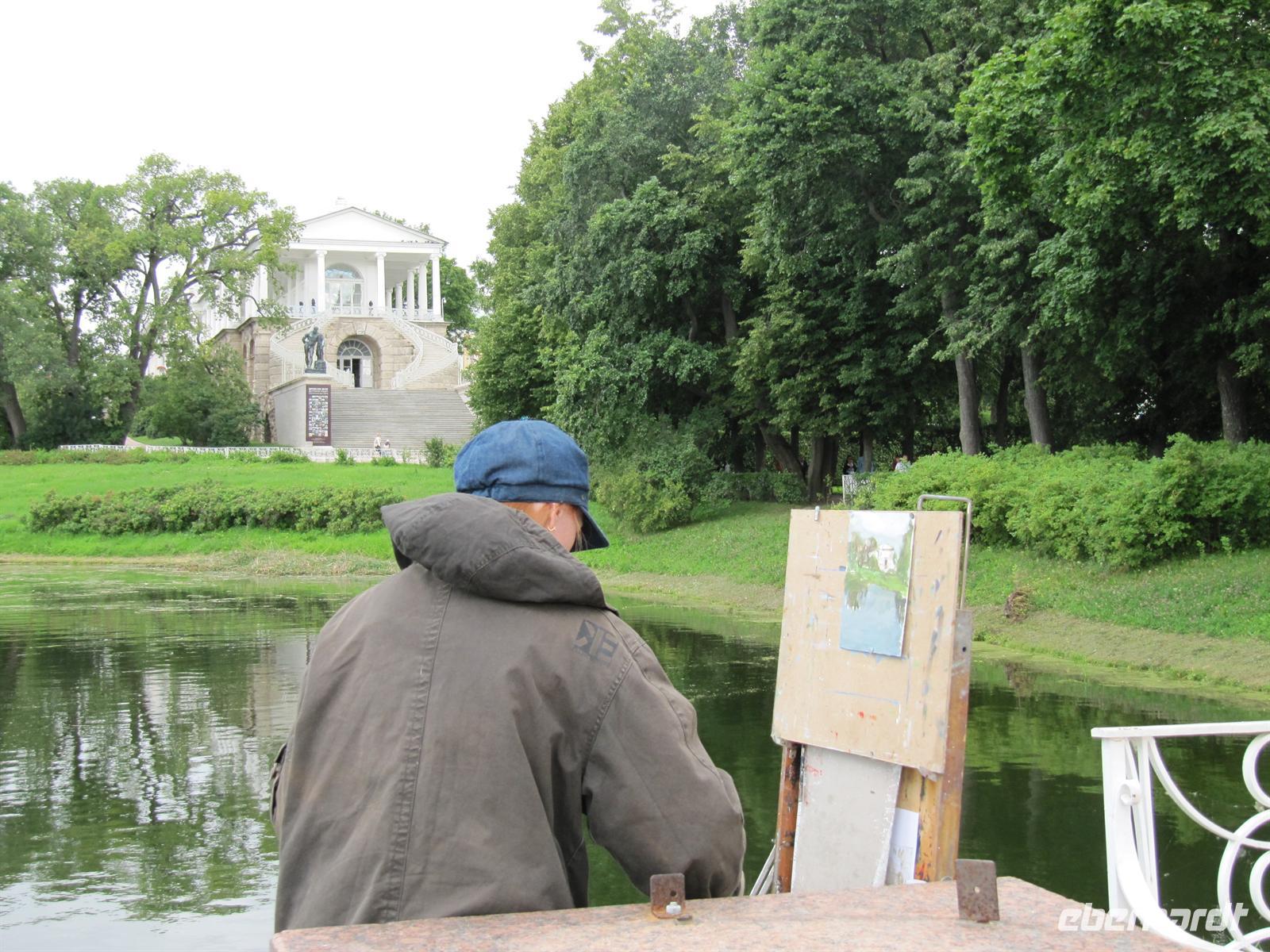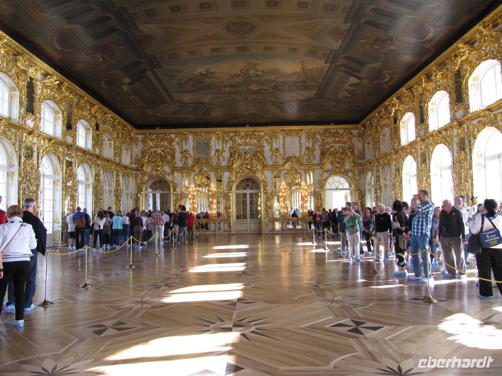Marion weilte mit ihren Gästen in Zarskoje Sielo, dem ehemaligen Zarendorf und heutigem Puschkin. Unser Ziel war der einzigartige Katharinenpalast. Peter der Große hatte das Land seiner Gattin Katharina I. geschenkt. Als diese dann als Zarin Russland regierte, ließ sie sich einen Palast erbauen. Elisabeth, die Tochter von Peter dem Großen, ließ den Palast erweitern und vergrößern. Rastrelli, der St. Petersburg wesentlich prägte, wurde Mitte des 18. Jahrhunderts zum Architekten für Erweiterungen und den Umbau. Es entstand in Pastellblau und Weiß ein Pendant zum Winterpalais am Schlossplatz - ein Meisterwerk des russischen Barocks. Wir wurden mit Musik empfangen und freuten uns darauf, die prachtvollen Räume zu besichtigen und das legendäre Bernsteinzimmer zu bestaunen. Valentina, unsere Reiseleiterin, hatte uns während der Fahrt nach Puschkin bestens eingestimmt. Wir schritten die Freitreppe hinauf, durch die beeindruckenden Prunksäle, die einzelnen Salons und standen dann im in unterschiedlichen Gelb-Braun-Tönen schimmernden Bernsteinzimmer. Erstaunlich, wie dieses Kunstwerk nachempfunden wurde. Hatten die Restauratoren lediglich alte Schwarz-Weiß-Fotos als Grundlage, um das Zimmer zu rekonstruieren. Eine geduldige Arbeit mit viel Liebe zum Detail war dazu erforderlich. Dies ist auch unter heutigen Bedingungen ein Meisterwerk. Ob das alte Original je wieder auftaucht ist völlig ungewiss, auch wenn im erzgebirgischen Deutsch-Neudorf noch immer Hoffnung bestehen soll ...
