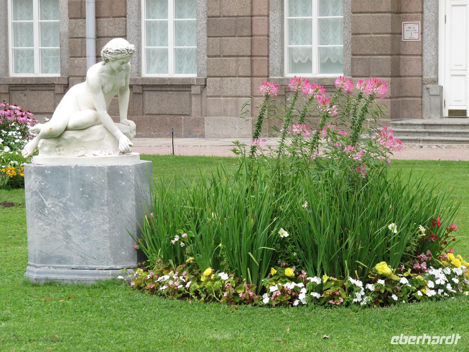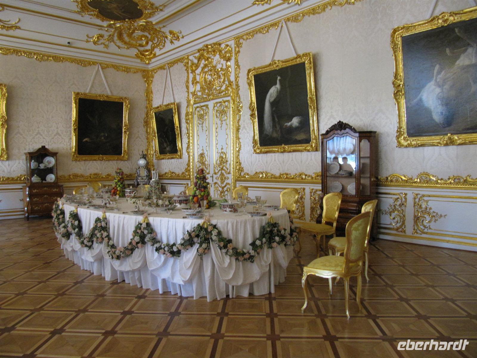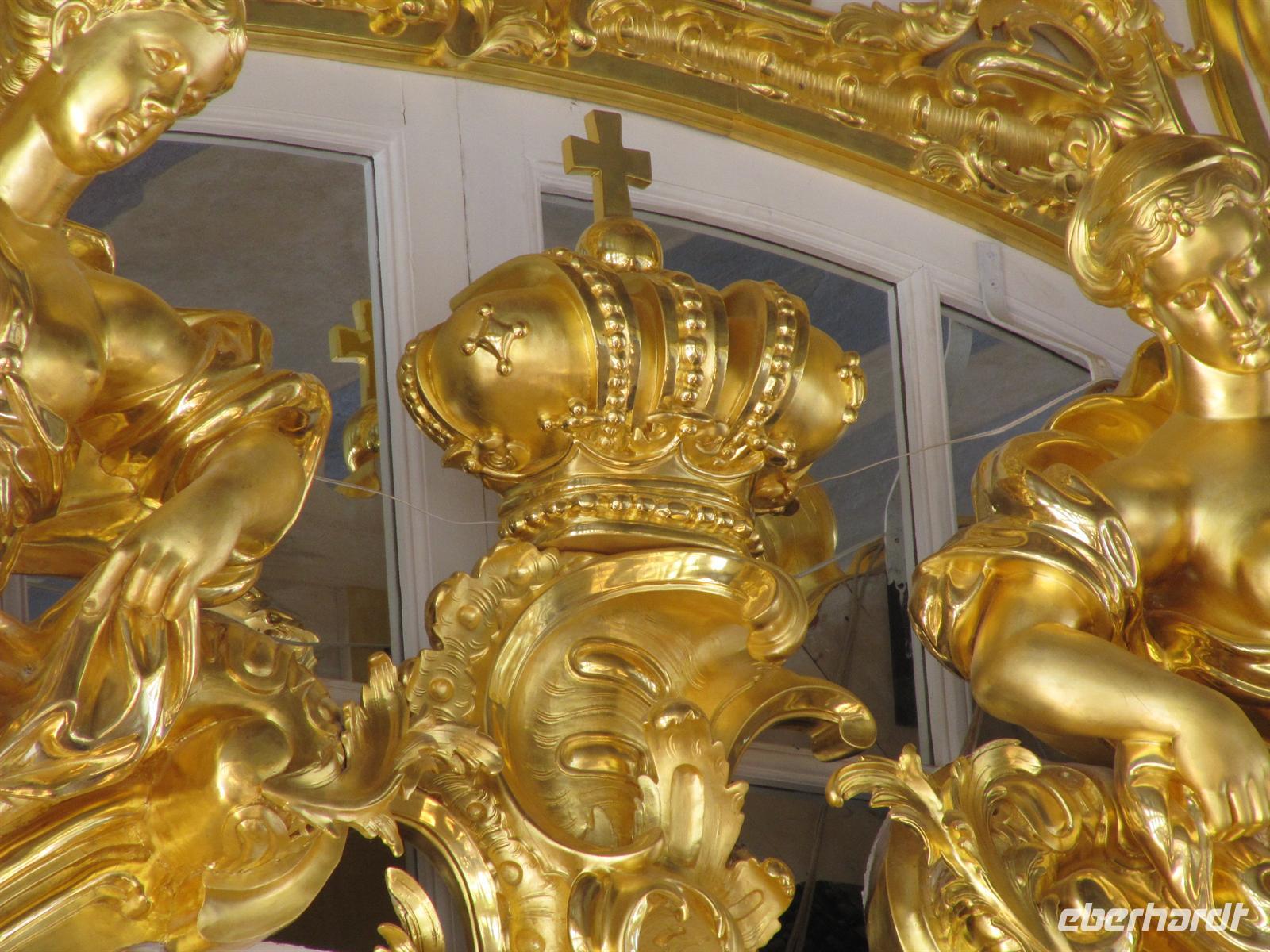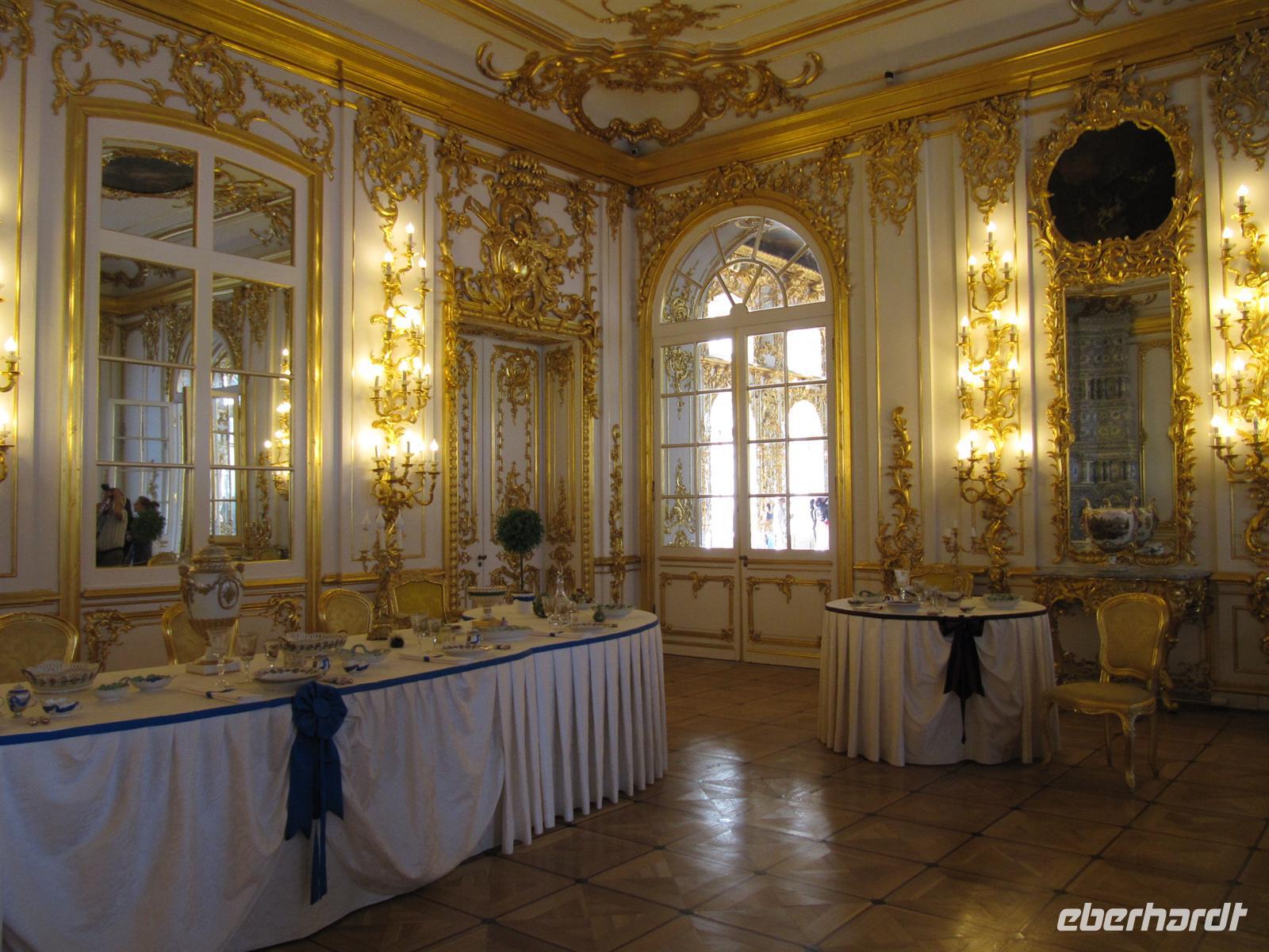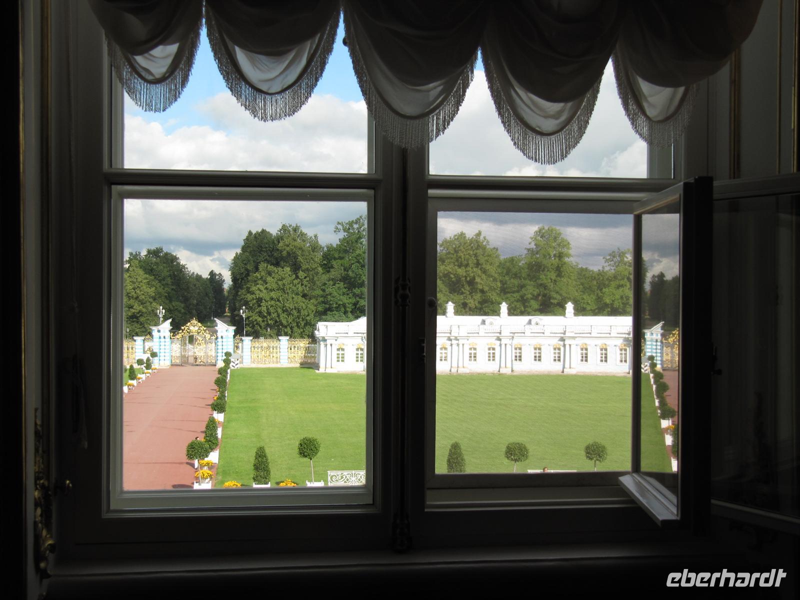 Marion weilte mit ihren Gästen in Zarskoje Sielo, dem ehemaligen Zarendorf und heutigem Puschkin. Unser Ziel war der einzigartige Katharinenpalast. Peter der Große hatte das Land seiner Gattin Katharina I. geschenkt. Als diese dann als Zarin Russland regierte, ließ sie sich einen Palast erbauen. Elisabeth, die Tochter von Peter dem Großen, ließ den Palast erweitern und vergrößern. Rastrelli, der St. Petersburg wesentlich prägte, wurde Mitte des 18. Jahrhunderts zum Architekten für Erweiterungen und den Umbau. Es entstand in Pastellblau und Weiß ein Pendant zum Winterpalais am Schlossplatz - ein Meisterwerk des russischen Barocks. Wir wurden mit Musik empfangen und freuten uns darauf, die prachtvollen Räume zu besichtigen und das legendäre Bernsteinzimmer zu bestaunen. Valentina, unsere Reiseleiterin, hatte uns während der Fahrt nach Puschkin bestens eingestimmt. Wir schritten die Freitreppe hinauf, durch die beeindruckenden Prunksäle, die einzelnen Salons und standen dann im in unterschiedlichen Gelb-Braun-Tönen schimmernden Bernsteinzimmer. Erstaunlich, wie dieses Kunstwerk nachempfunden wurde. Hatten die Restauratoren lediglich alte Schwarz-Weiß-Fotos als Grundlage, um das Zimmer zu rekonstruieren. Eine geduldige Arbeit mit viel Liebe zum Detail war dazu erforderlich. Dies ist auch unter heutigen Bedingungen ein Meisterwerk. Ob das alte Original je wieder auftaucht ist völlig ungewiss, auch wenn im erzgebirgischen Deutsch-Neudorf noch immer Hoffnung bestehen soll ...