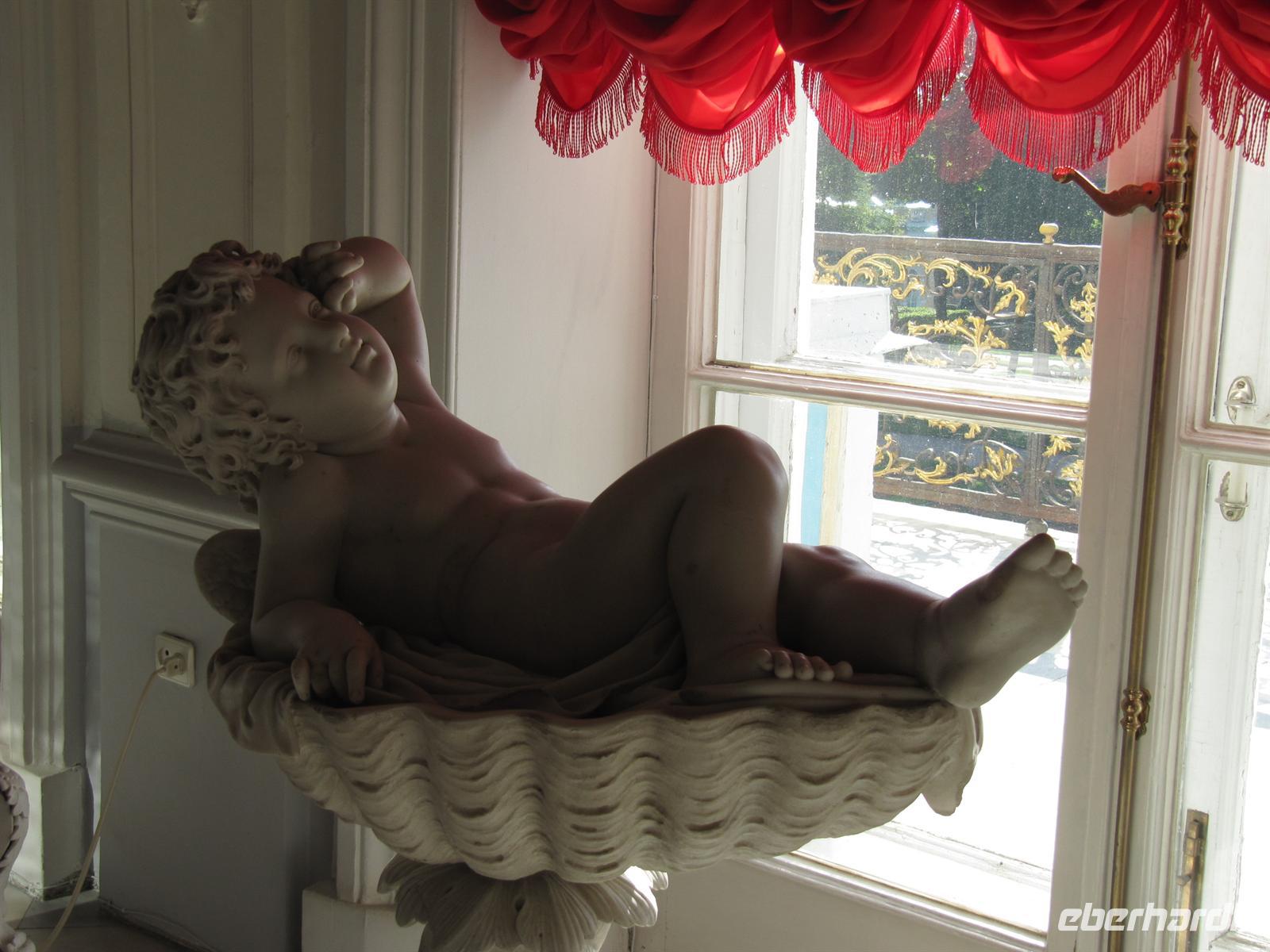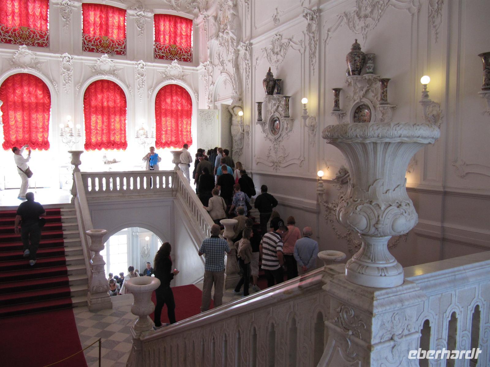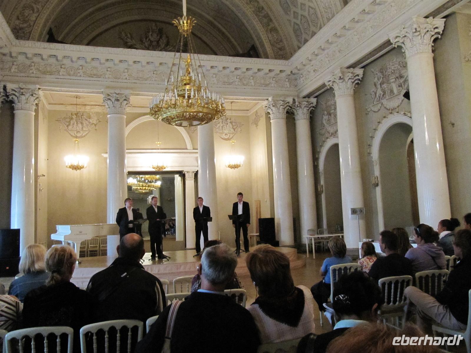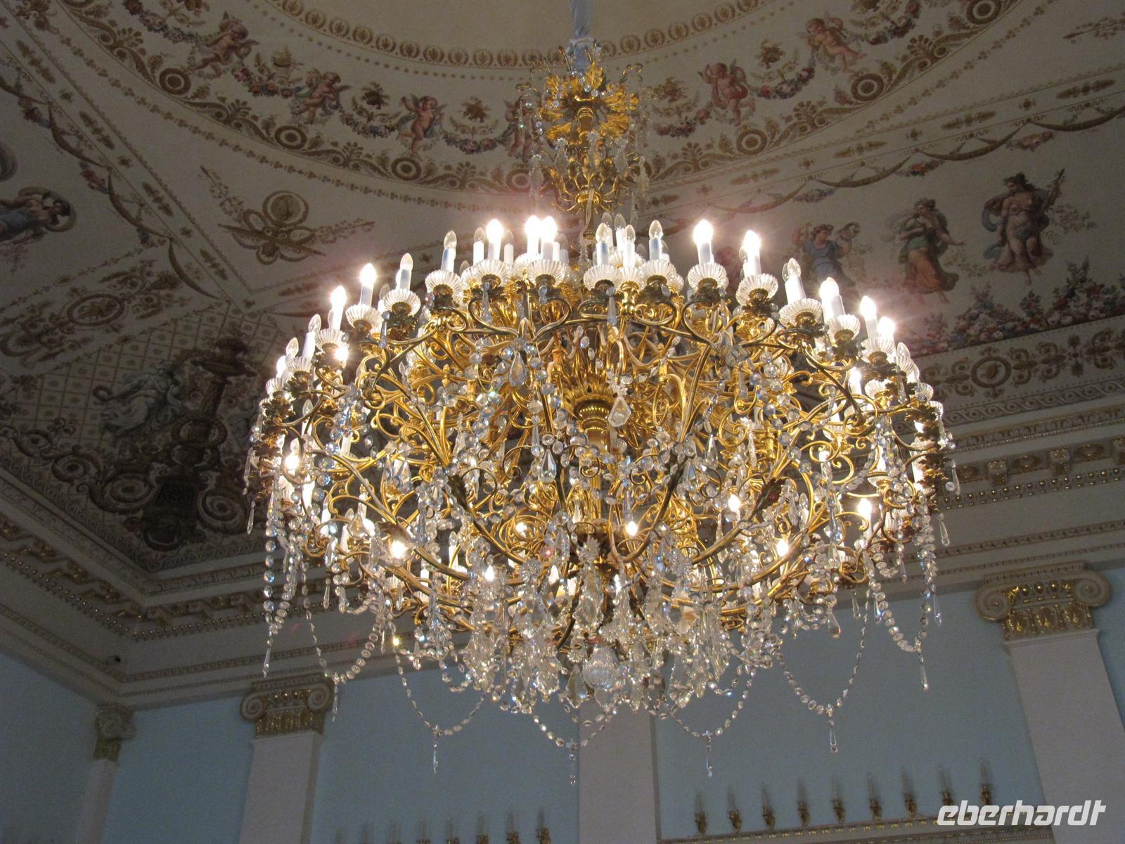 Wir spazierten nun durch den Katharinenpark zur Eremitage und zur Grotte, wo wir einem kleinen Konzert lauschten. Beim Mittagessen im Restaurant des Schlosses stärkten wir uns mit russischen Spezialitäten. Eine Folkloregruppe unterhielt uns stimmungsvoll. Gut gestärkt fuhren wir zurück nach St. Petersburg zu einem der alten Adelspalaste, dem Jussupow-Palast am Mojka-Kanal. Von außen sah der Palast eher wie ein größeres Bürgerhaus aus. Die Säulen am Eingang verliehen ihm jedoch ein besonders würdevolles Antlitz. Die Adelsfamilie zählte zu den reichsten St. Peterburger Familien. Niemand von uns ahnte, welche wundervolle Räume wir sehen würden und welche Geheimnisse das Haus hatte. Zuerst stiegen wir in den Rasputin-Keller hinab. Valentina erzählte uns sehr eindrucksvoll die interessante Geschichte um den Wunderheiler, der eng mit dem Leben der Zarenfamilie verbunden war. Als er neben seinen medizinischen Kenntnissen auch zunehmend als politischer Berater galt, wurde sein Einfluss selbst auf Staatsgeschäfte zu groß. So wurde seine Ermordung im Jussupow-Palast geplant und ausgeführt ... In der ersten Etage besichtigen wir später den großen Speisesaal, das Prunkstück des hauseigenen Theatersaales und die verschiedenen Räume mit Gemälden und Skulpturen. Die Adelsfamilie hatte eine immense Gemälde- und Skulpturensammlung zusammengetragen. Viele dieser Exponate sind heute in der Eremitage zu sehen. Abschließend bestaunten wir die privaten Gemächer der Jussupows: das kleine Musikzimmer, das Kabinett des Fürsten, die Bibliothek, die einst 55.000 Bände zählte, den orientalischen Saal und das Schlafzimmer ... Es war ein interessanter Einblick in das Leben und Wirken dieser Adelsfamilie. Kein Wunder, das dieser Palast nach dem Winterpalast der Zarenfamilie als luxuriösester St. Petersburgs gilt.
