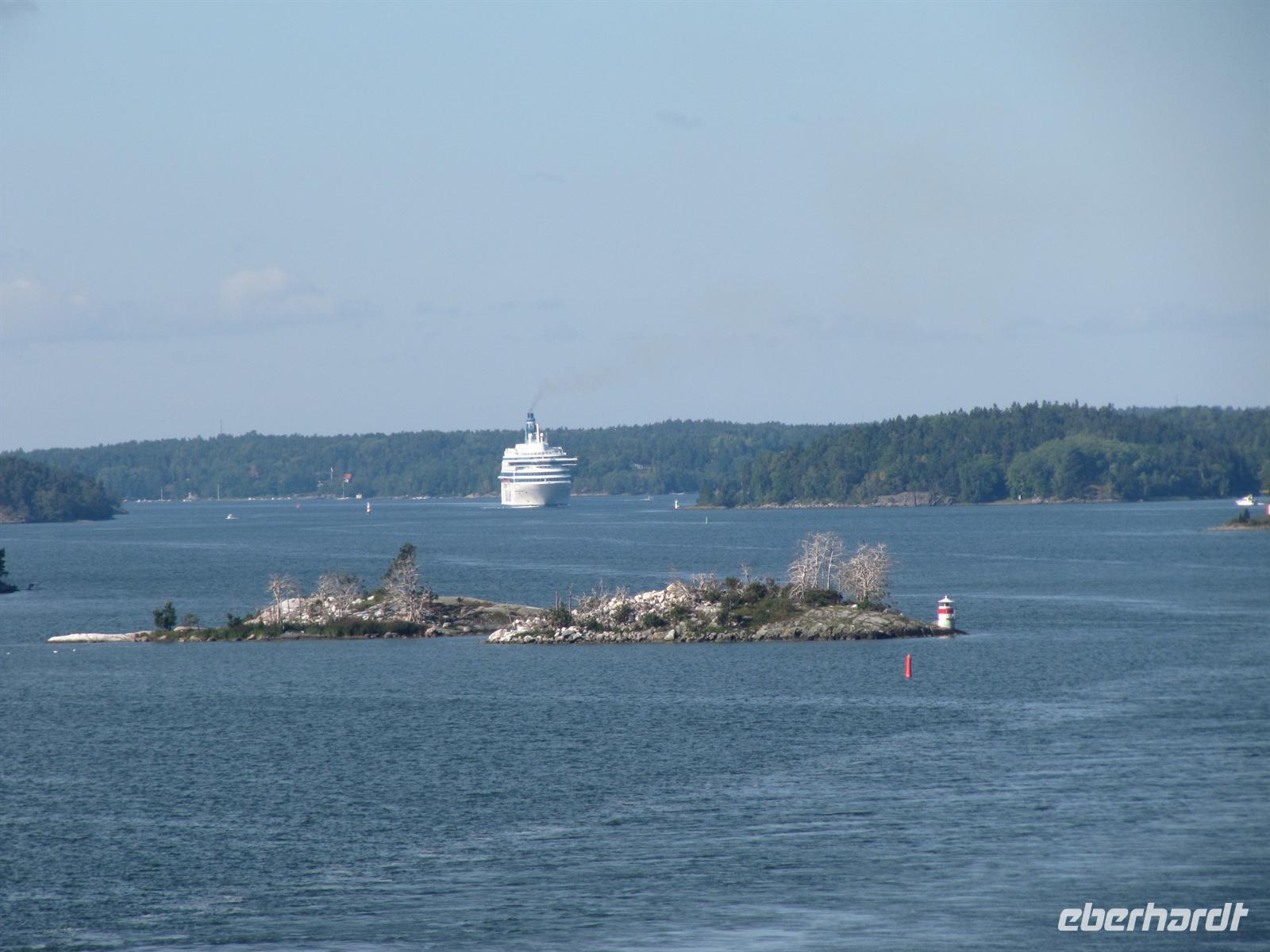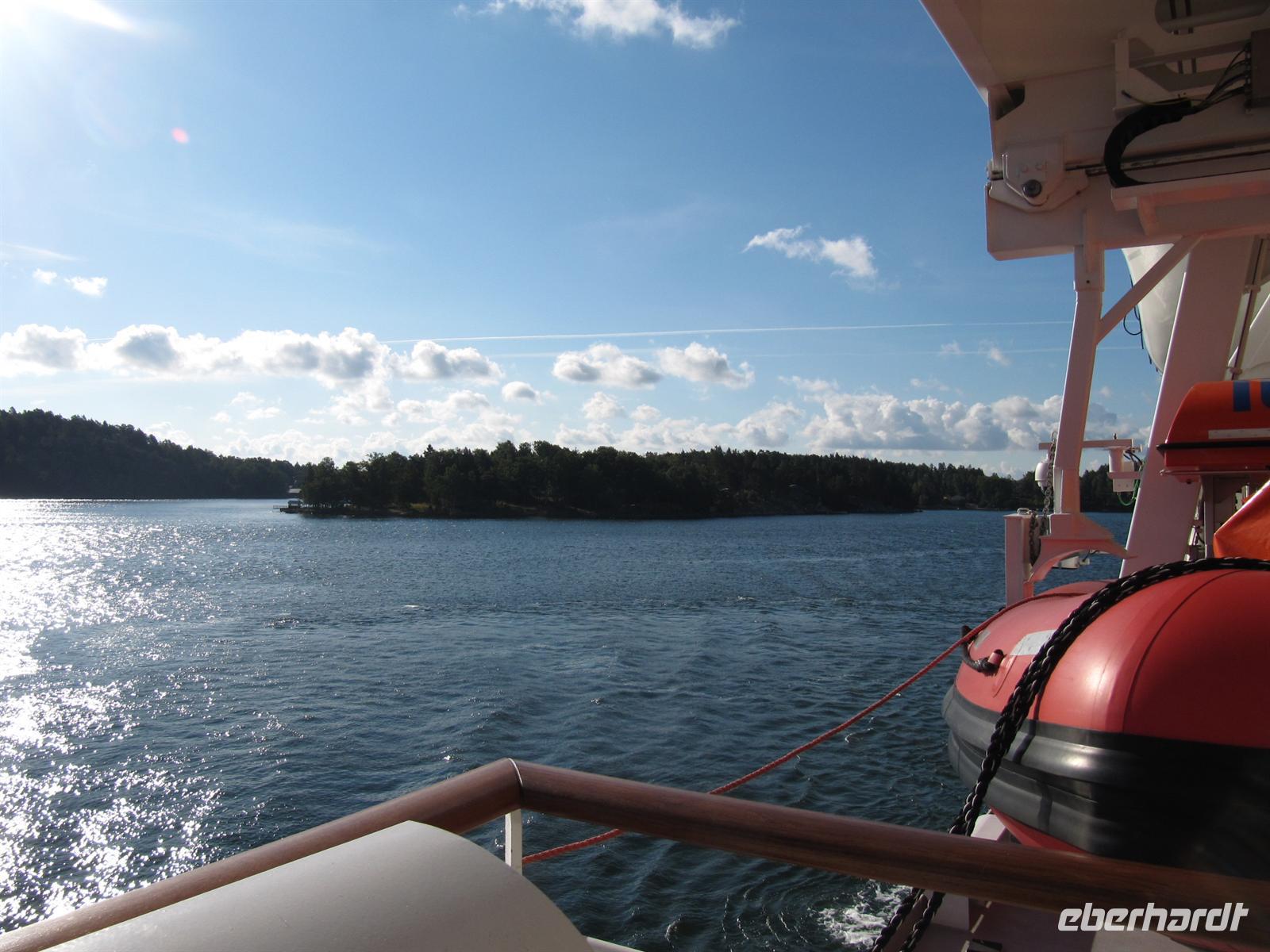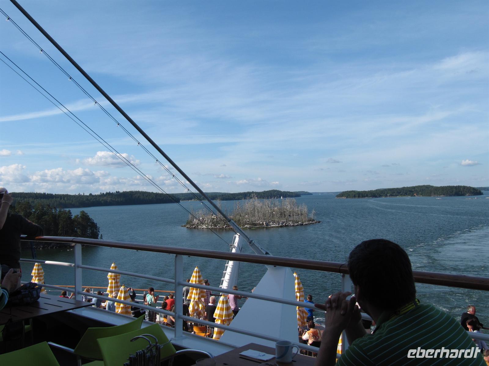 07.00 Uhr legte die AIDAsol in Stockholm ab und es erwartete uns eine faszinierende Route durch die Schärenwelt rund um Stockholm auf dem Weg in die offene See. Uns eröffneten sich immer wieder schöne, ja faszinierende Blicke Steuer- und Backbord. In der teils engen Fahrrinne hatten die Offiziere ihr ganzes Können aufzuweisen, denn es gab Gegenverkehr großer Fähr- und Kreuzfahrtschiffe und dazwischen kreuzten Fähren, Motor- und Segelboote unseren Weg. Ganz nah erblickten wir kleine Ortschaften, Häfen und schmucke Häuser. Manchmal auf einer kleinen Insel war auch nur ein einziges Haus zu sehen. Dann erreichten wir die Komoraninseln. Es war eine sehr interessante, vielfältige Fahrt entlang dieser Inselwelt des Schärengartens.