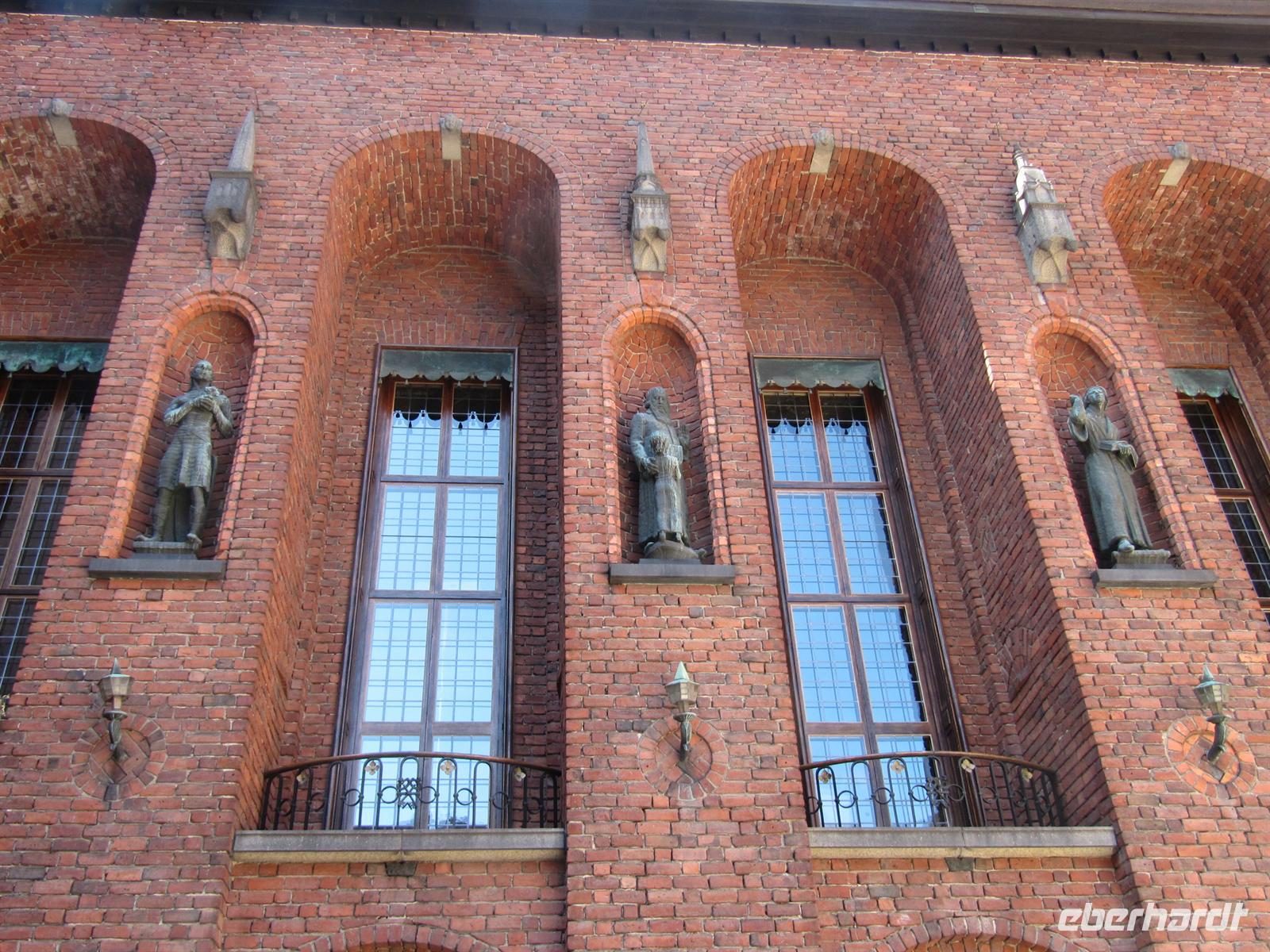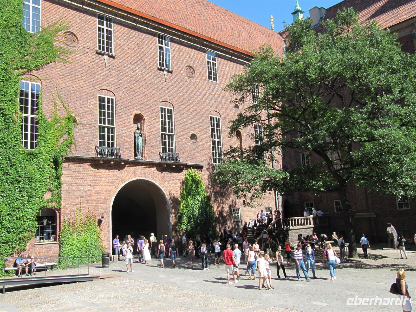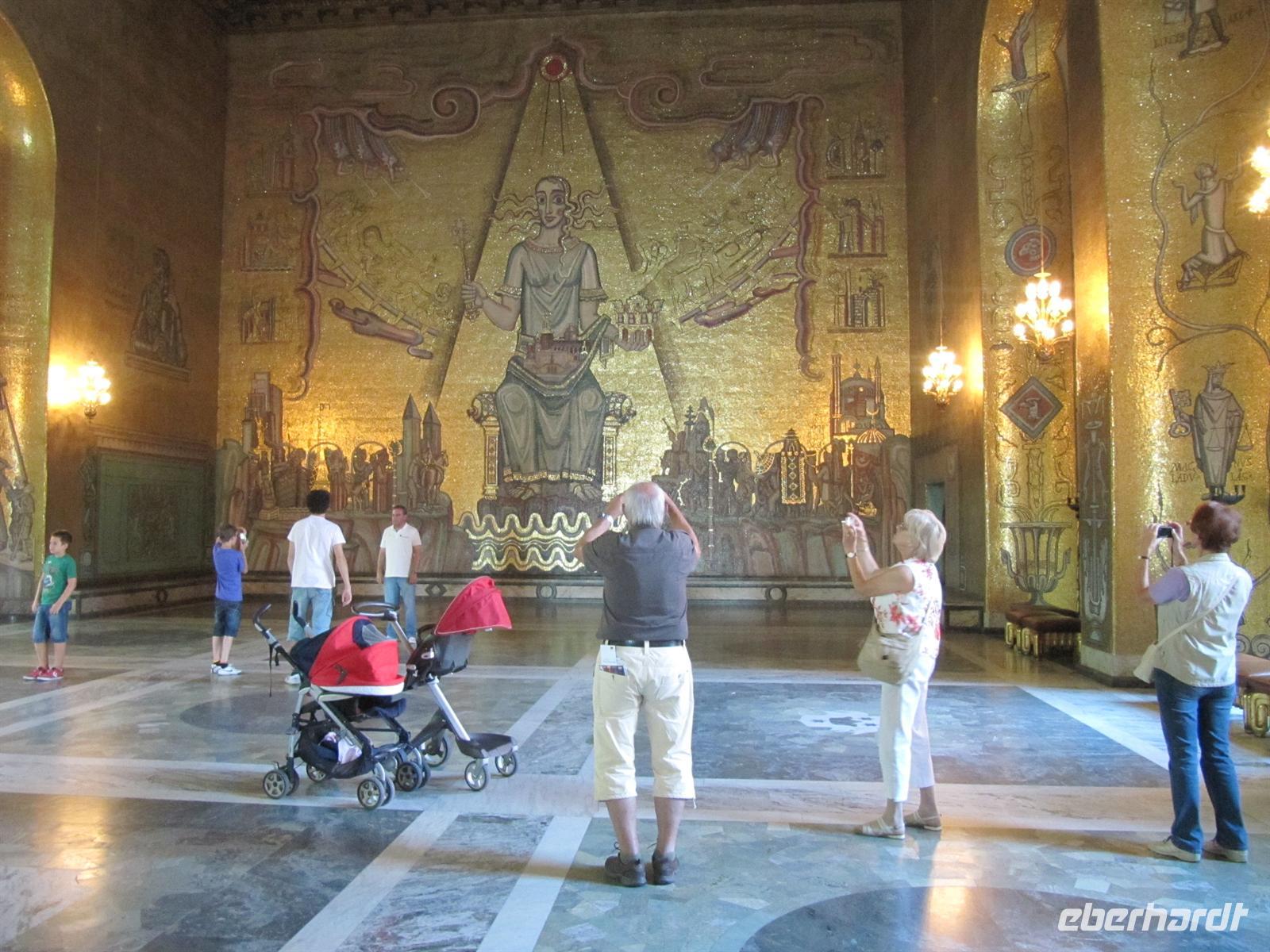 Danach war das Stadshuset, das Stadthaus, unser Ziel. Der dunkelrote Klingerbau mit dem 105 Meter hohen Turm und seinem grünen Kupferdach, erbaut zu Beginn des 20. Jahrhunderts von Ragnar Östberg, befindet sich direkt am Malarsee. Wir besichtigten, geführt von Matthias und Erika, den Blauen Saal und den Goldenen Saal mit den prachtvollen goldfarbenen Mosaiken. Beide Säle bilden einen würdigen Rahmen für die Festbankette nach der alljährlichen Verleihung der Nobelpreise. Unsere Reiseleiter würzten die Führung mit mancher Anekdote, so zum Frack von Günther Grass oder zu den neuen Vorhänge aus China.