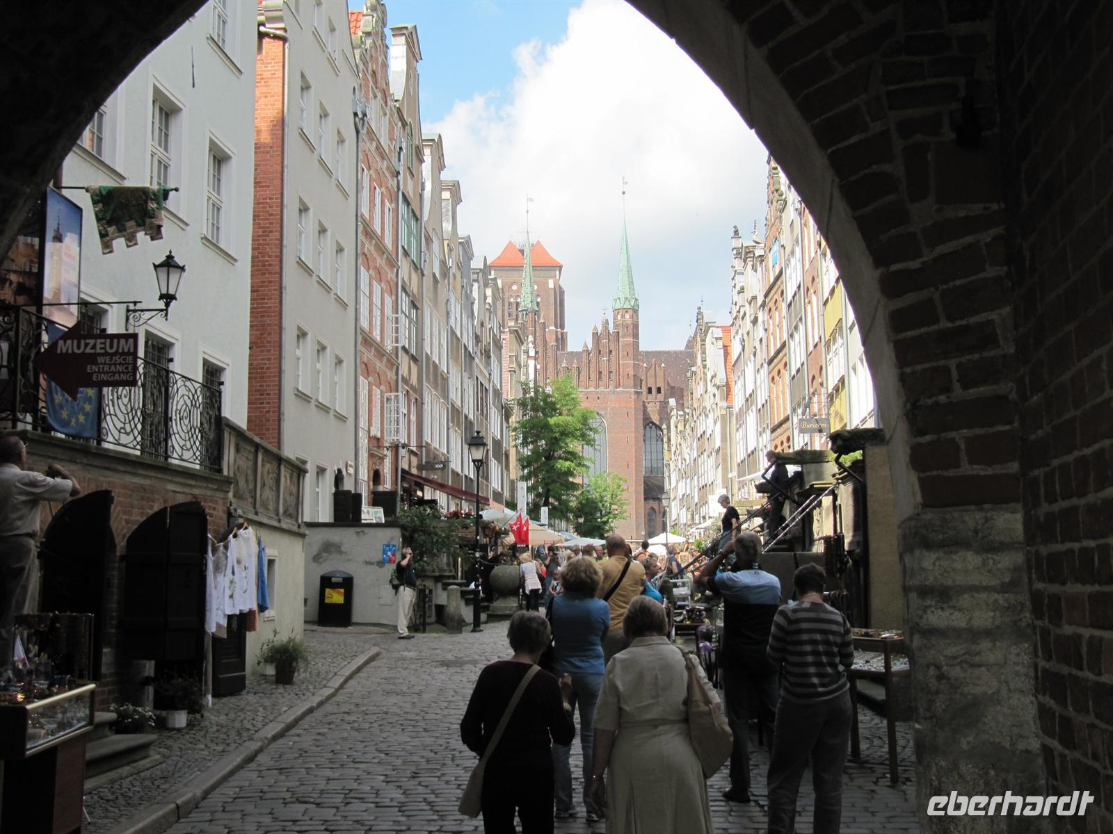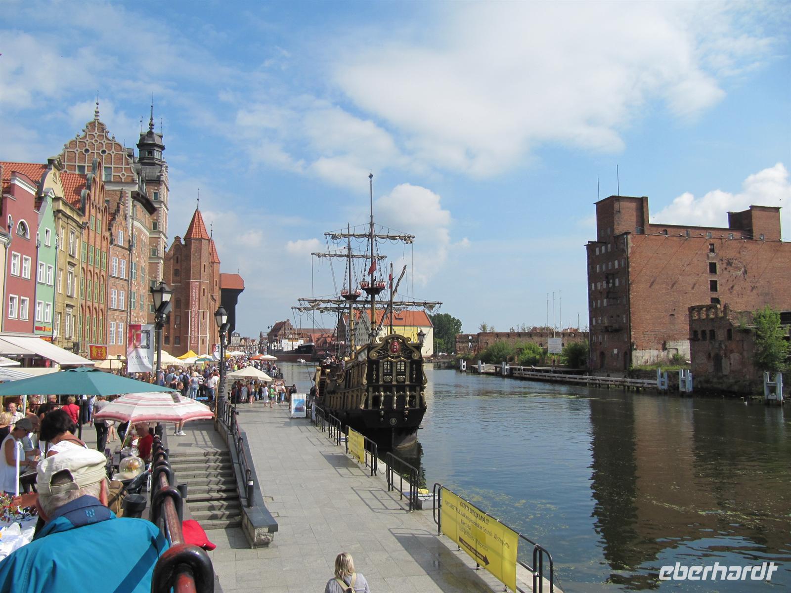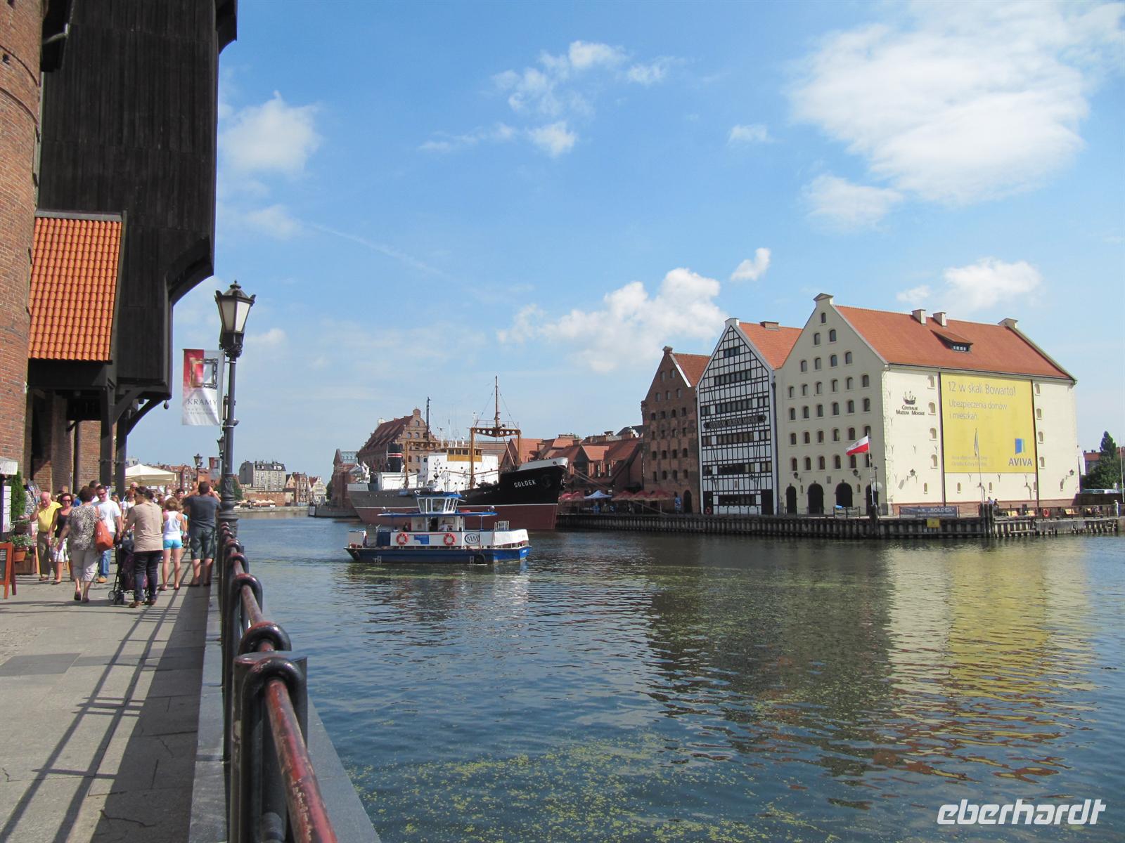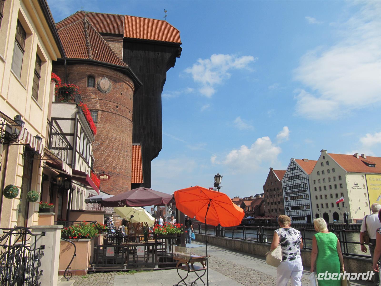 Am Morgen erreichten wir nach einer erneut sehr ruhigen Nacht den Hafen von Gdynia. Wir besuchten die Dreistadt: Gdingen - Sopot - Danzig. Bei unseren Rundgängen besichtigten wir die Altstadt von Danzig. Die polnischen Restauratoren haben mit viel Liebe und großer Detailtreue das Stadtzentrum der ehemaligen Hansestadt komplett nach historischem Vorbild wieder aufgebaut. Wir schlenderten über den sogenannten Königsweg und bestaunten das Goldene Tor, den Langen Markt, den Artushof und natürlich den Neptunbrunnen. Dann zwischen den wundervollen Bürgerhäusern sahen wir sie schon von Weitem, die imposante gotische Marienkirche, die größte Kirche Polens, in der mehr als 20.000 Menschen im Innenraum Platz finden. Wir bestaunten die berühmte astronomische Uhr, die leider im Moment nicht in voller Funktion ist. Unser Reiseleiter Konrad lud uns ein, zu einem späteren Zeitpunkt erneut Danzig zu besuchen, dann wird die Uhr sicher funktionieren. Simone und Marion weilten mit ihren Gruppen natürlich an der Motlau und bestaunten Danzigs „Schatzkammer", die Speicherinsel. In Fachwerk- und Backsteingebäuden warteten hier kostbare Handelsgüter wie Getreide, Holz, Bier und Gewürze darauf, auf Schiffe verladen zu werden. Am berühmten Krantor verweilten wir und Konrad erklärte, wie diese Technik funktionierte.