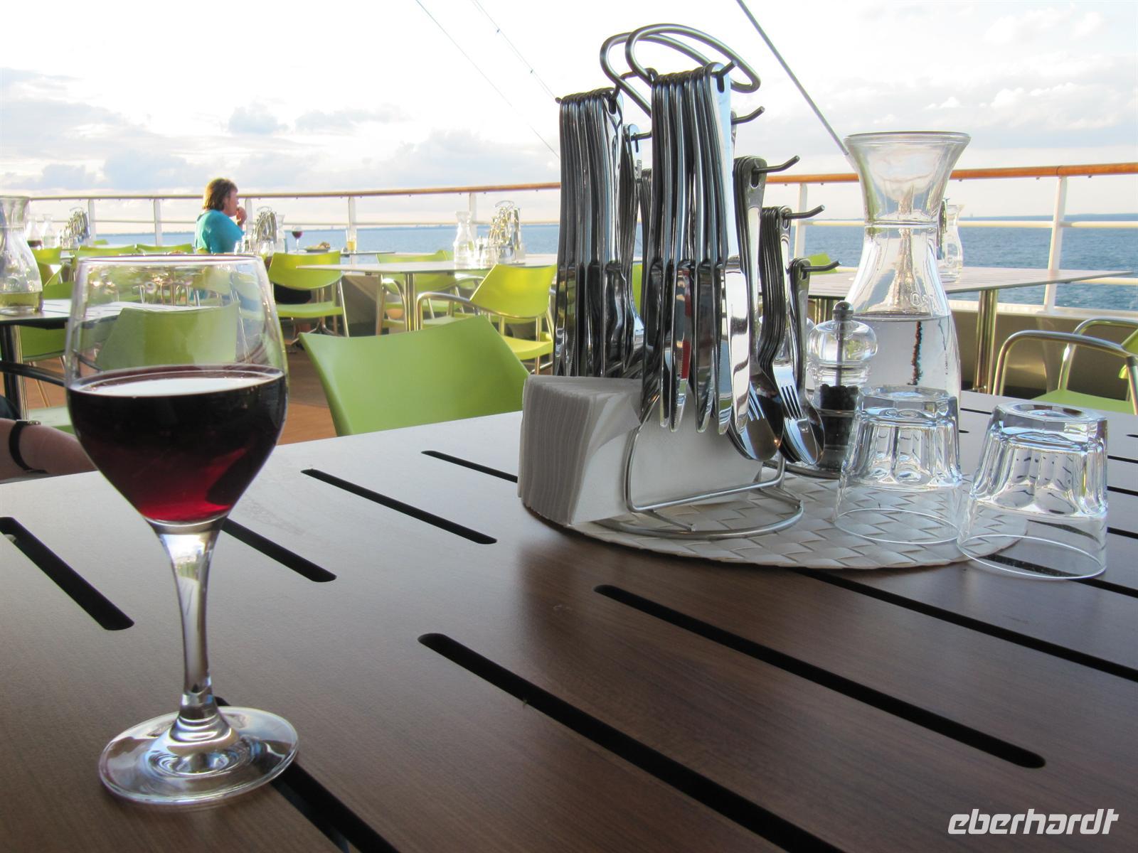 Das Abendessen genießen ... Dänemark verabschiedete sich mit einem tollen Sonnenuntergang, die Crew und das AIDA-Show-Ensemble zeigten bei der Poolparty mit Lasershow nochmals ihr Können und alle waren bester Laune. Gemeinsam stießen wir mit dem Farewell-Sekt auf unsere erlebnisreiche Kreuzfahrt an.