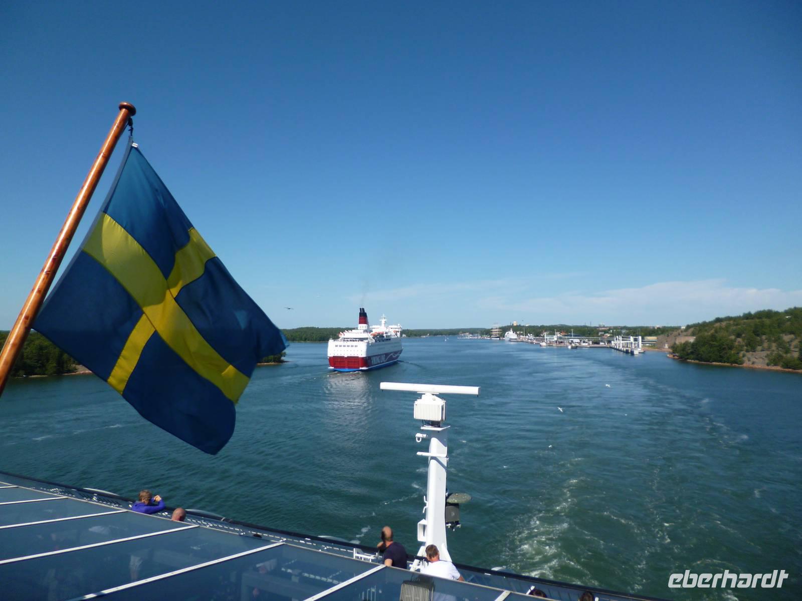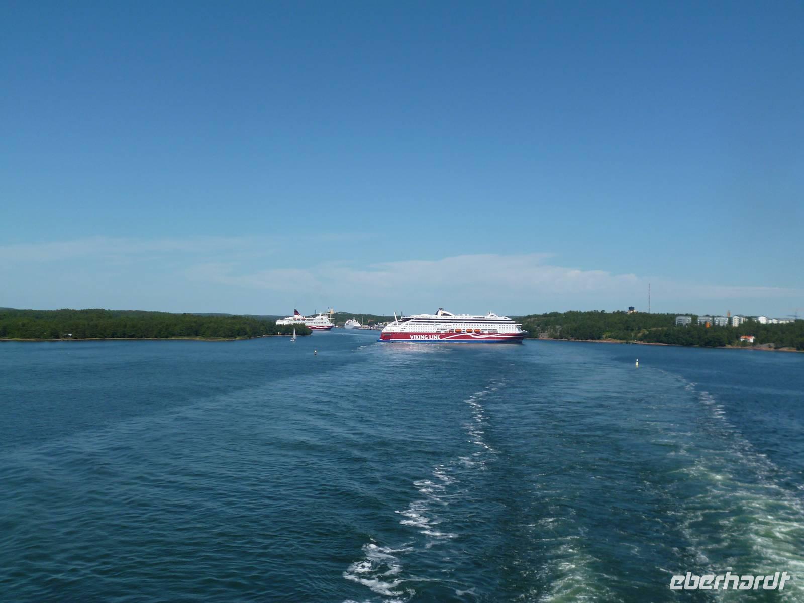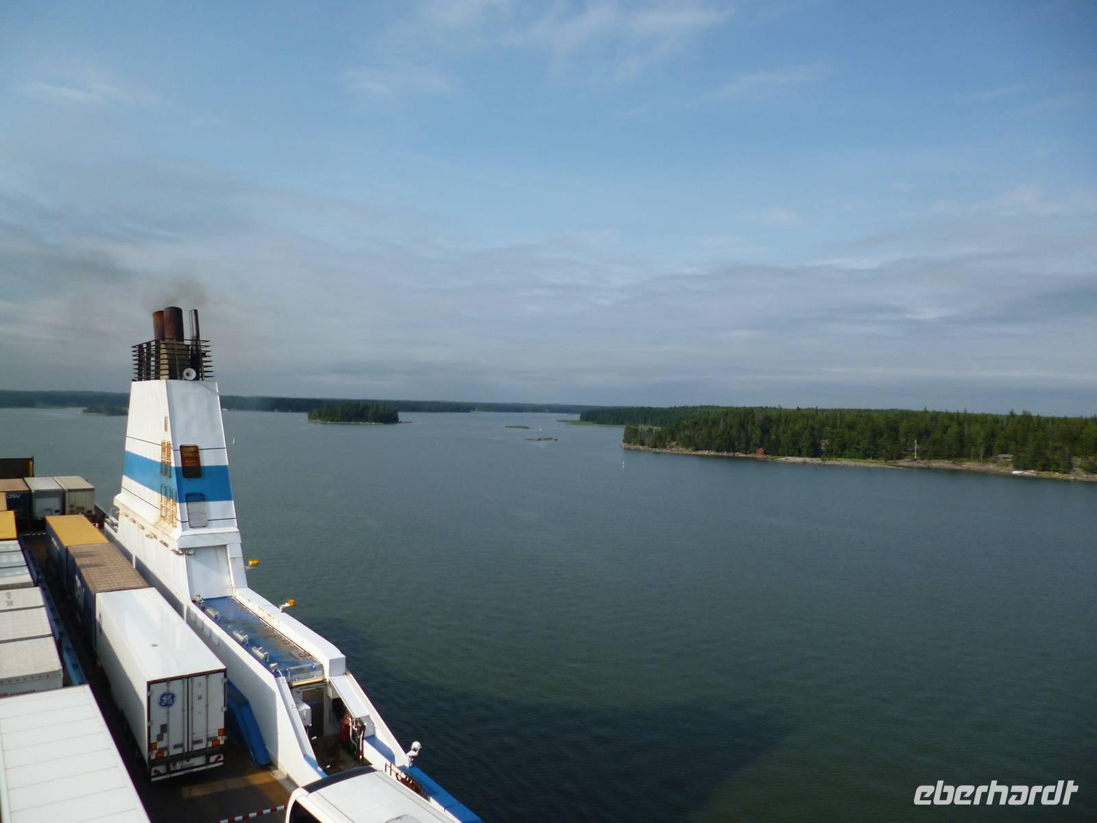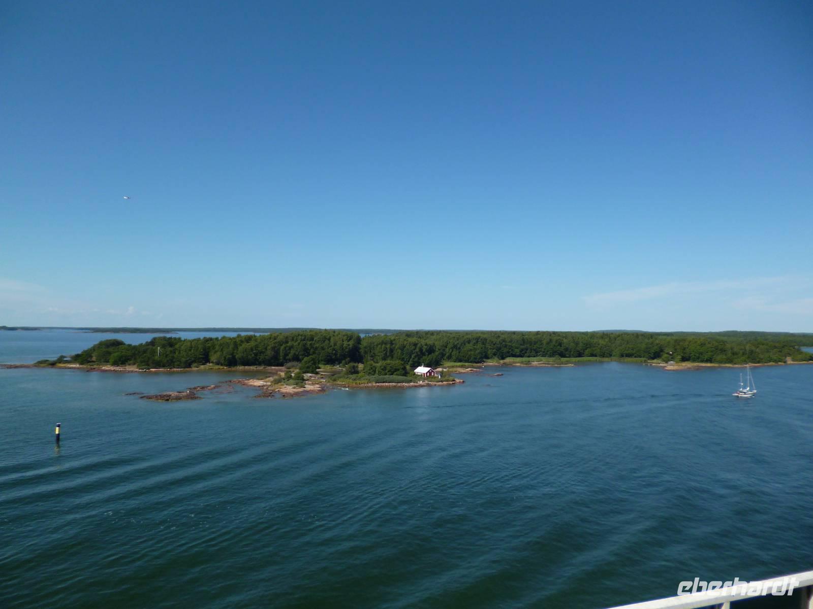 Um 6 Uhr stand unser bestelltes Frühstück bereit, 07.10 Uhr Abfahrt zur Fähre. Weil am Sonntag Morgen kein Verkehr war, brauchten wir höchstens 10 Minuten und sahen im Vorbeifahren sogar nach das aus dem 14. Jahrhundert stammende Residenzschloss von Turku. Bei herrlichem Sommerwetter begann die Fahrt durch die Schären. Im Hafen von Mariehamn erwartete uns Gästeführerin Ann Christin und fuhr mit uns durch den Osten der Hauptinsel über Jomala zur Festung Kastelholm, die bis 1634 Sitz des Statthalters von Aland war. Beim Freilichtmuseum Jan Karlsgarden, wo wir einen recht idyllischen und schattigen Busparkplatz hatten, gab es im Namen von Eberhardt Travel den sonntäglichen Sektempfang, der natürlich allgemeinen Beifall fand. Nächste Station war die russische Festung Bomarsund, die 1854 im Krimkrieg zerstört wurde. Nach dem Abendessen im Hotel Savoy in Mariehamn schlenderten viele Gäste zum Hafen, wo eine Dixieband spielte. Das Hotel ist nicht ganz neu, aber ruhig gelegen und ordentlich.
