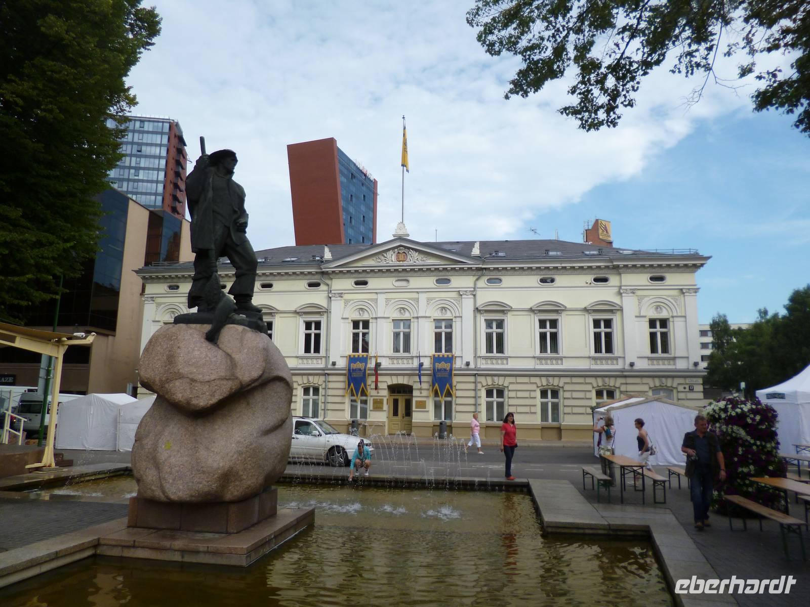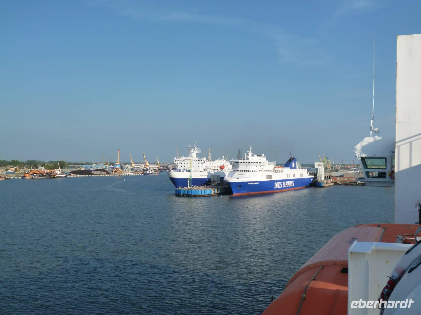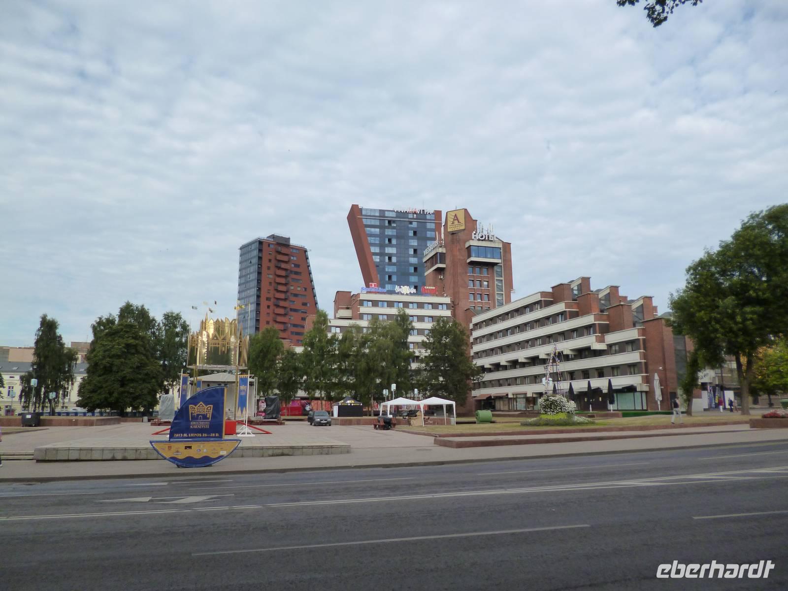 An Bord gilt litauische Zeit, die Uhren müssen eine Stunde vor gestellt werden. Nach dieser Zeit gibt es von 9 bis 11 Uhr Frühstück. Pünktlich um 20 Uhr legte die Fähre in Klaipeda an und unser Bus wurde gleich am Anfang hinaus gelassen, so dass wir zum Hotel fahren konnten. Am letzten Juliwochenende feiert Memel das Fest des Meeres und unser wirklich sehr zentral gelegenes Hotel stand mitten im Trubel. Alle Zufahrtswege waren gesperrt, aber ein einsichtiger Polizist ließ uns passieren. Im Hotel lief alles bestens. Abendessen als Menu. Getränke können mit Euros bezahlt werden. Der Bus kann beim Hotel parken.