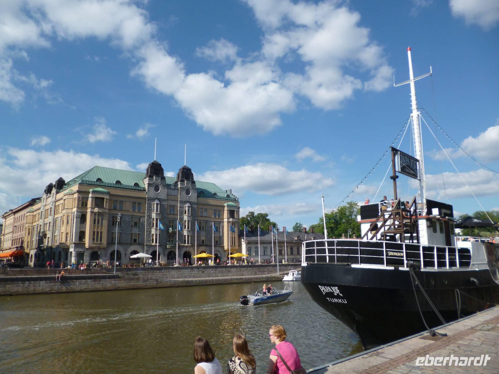 Um 9 Uhr Abfahrt nach Porvoo, gut 40 Kilometer östlich von Helsinki. Auf der Fahrt hielten wir noch beim Olympiastadion. In Porvoo schlenderten wir über den Markt direkt zum Dom. Anschließend gab es Zeit zum Bummeln. Das Städtchen ist sehr überschaubar. Um 12 Uhr Weiterfahrt nach Turku, unterwegs Mittagspause mit Bordverpflegung. Gegen 15.15 Uhr Ankunft im Hotel Hamburger Börse in Turku. Anschließend Spaziergang mit allen Gästen vom Marktplatz, an dem das Hotel liegt, zum Fluss bis zum Dom, in den wir noch kurz vor einer Hochzeitszeremonie hinein durften. Dann zurück auf der anderen Seite bis zu den historischen Schiffen, die nunmehr als Gaststätten im Flussbecken liegen. Um 19 Uhr Abendessen mit drei leckere Gänge, was sich allerdings bis nach 21.30 Uhr hinzog. Trotzdem war das Hotel vollkommen in Ordnung, sehr schöne und ruhige Zimmer, geräumige Bäder und sehr nettes Personal.