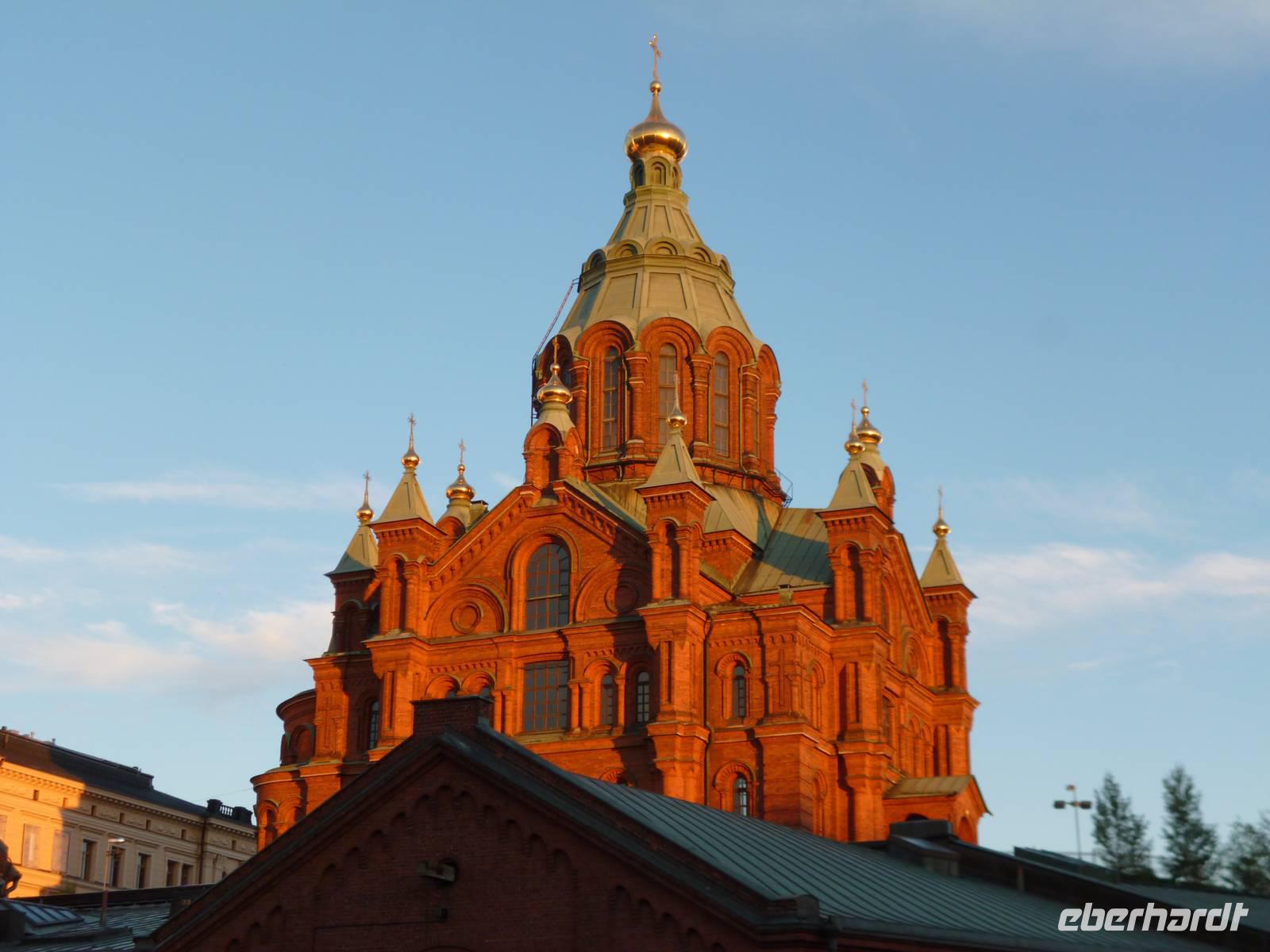 Kurz nach zehn fuhr der Bus mit den ersten Gästen vom Dresdener Flughafen los und pausierte in Döbeln und am Leipziger Flughafen, wo die meisten Gäste zustiegen. Weiter ging es auf der A9 bis zum Berliner Ring A10, dann Westring und auf die A24 Richtung Hamburg und Kiel. Weil wir noch genügend Zeit hatten, legten wir eine zusätzliche Stippvisite in Kiel ein. Die Landeshauptstadt von Schleswig- Holstein wurde zwar im Zweiten Weltkrieg stark zerstört, bietet aber durch ihre Nähe zur Ostsee ein angenehm maritimes Ambiente. Der Bus kann an einem der Hafenkais am Stadtrand stehen und die Gruppe spazierte gemeinsam zur wieder aufgebauten Nikolaikirche. Anschließend konnte jeder noch einen kleinen Stadtbummel einlegen. Dann ging es weiter zur Fähre, die um 22 Uhr abends ablegte. Man musste gleich auf der Fähre die Uhren eine Stunde vorstellen, denn hier lief alles nach finnischer Zeit ab. Beim Abendessen traf man sich wieder und ein grandioser Sonnenuntergang auf ruhiger See beendete einen langen Tag.