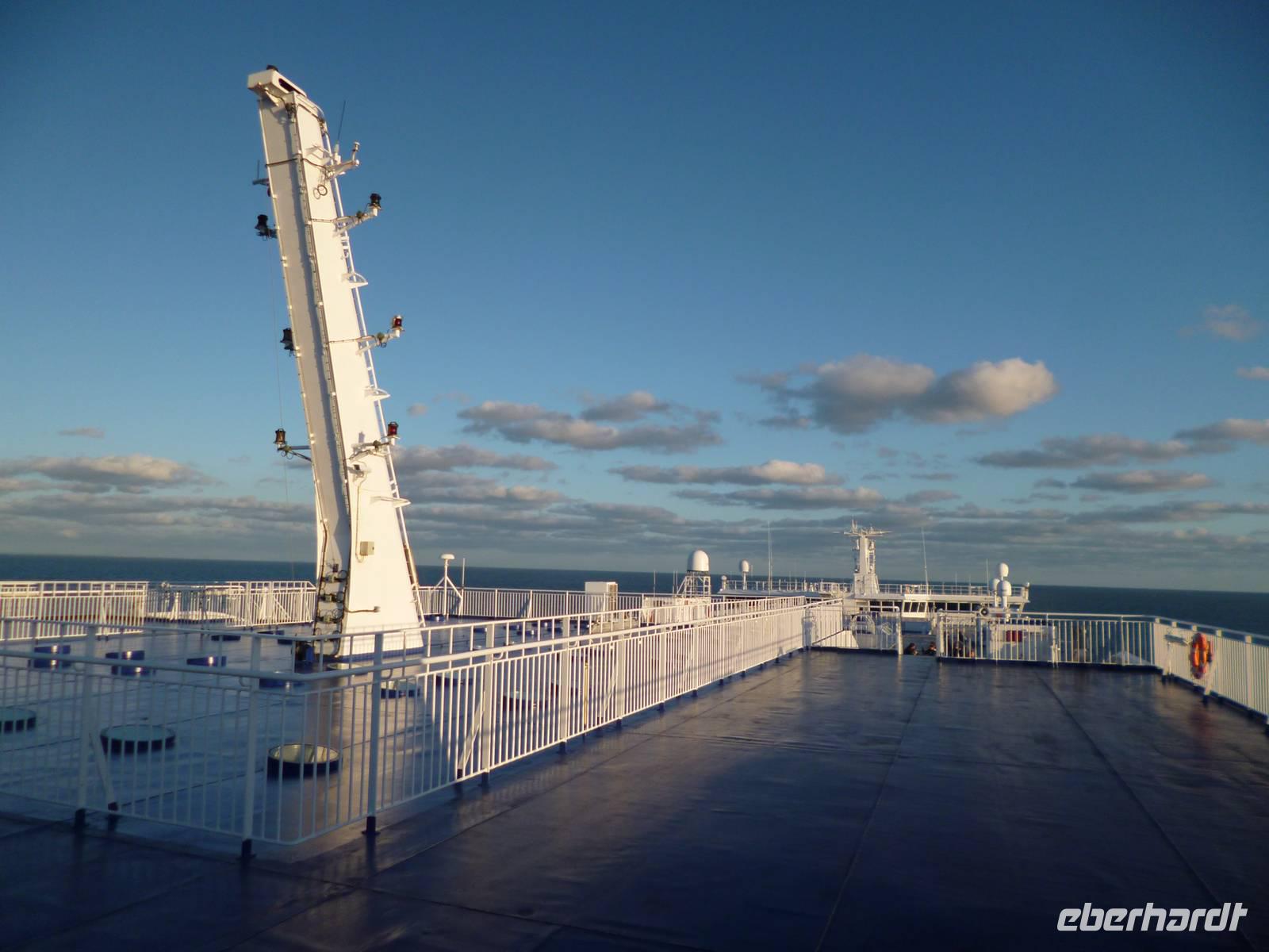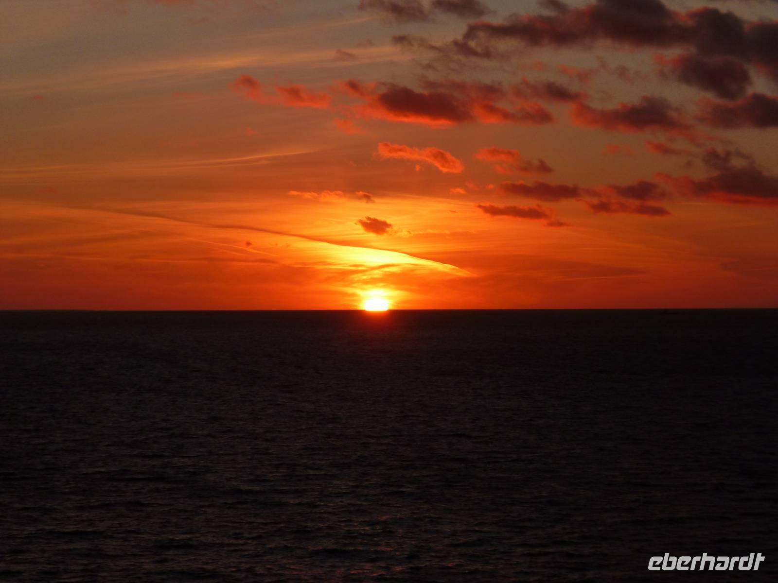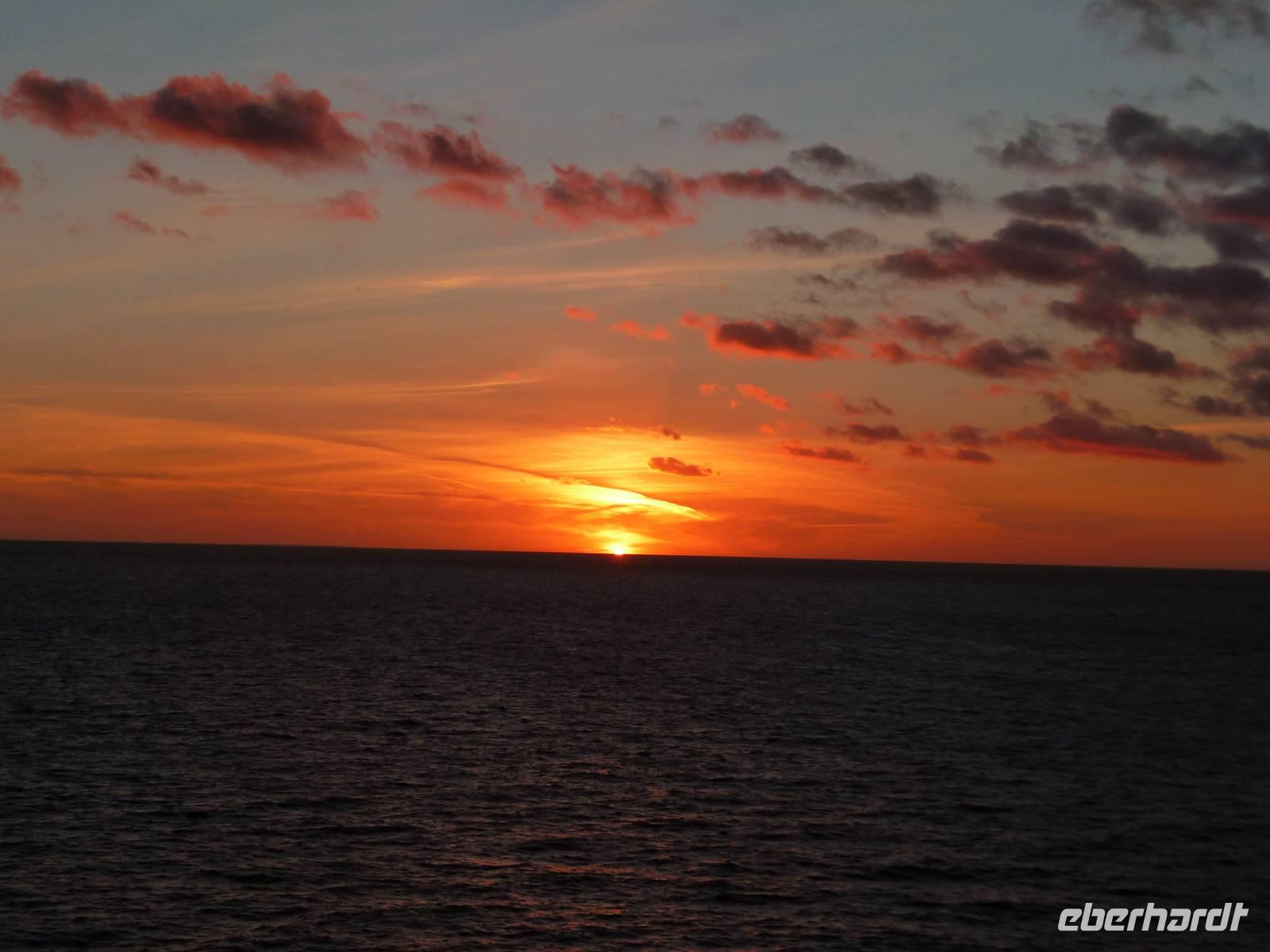 Gegen 17 Uhr konnten wir auf der Fähre einchecken. Weil der Reiseleiter erst erfuhr, dass wir schon um 18 Uhr ans Abendbuffet gehen sollten und wir schon in den Kabinen oder auf Deck waren, informierte er uns über den Bordfunk. Das klappte auch gut und pünktlich konnten wir ein wirklich tolles Abendessen erleben, bei dem pünktlich um 18.45 Uhr die Fähre ablegte. Beim Sonnenuntergang kurz nach 21 Uhr trafen sich die meisten auf dem Oberdeck, um anschließend noch in der Pianobar beisammen zu sitzen und die Reise Revue passieren zu lassen.
