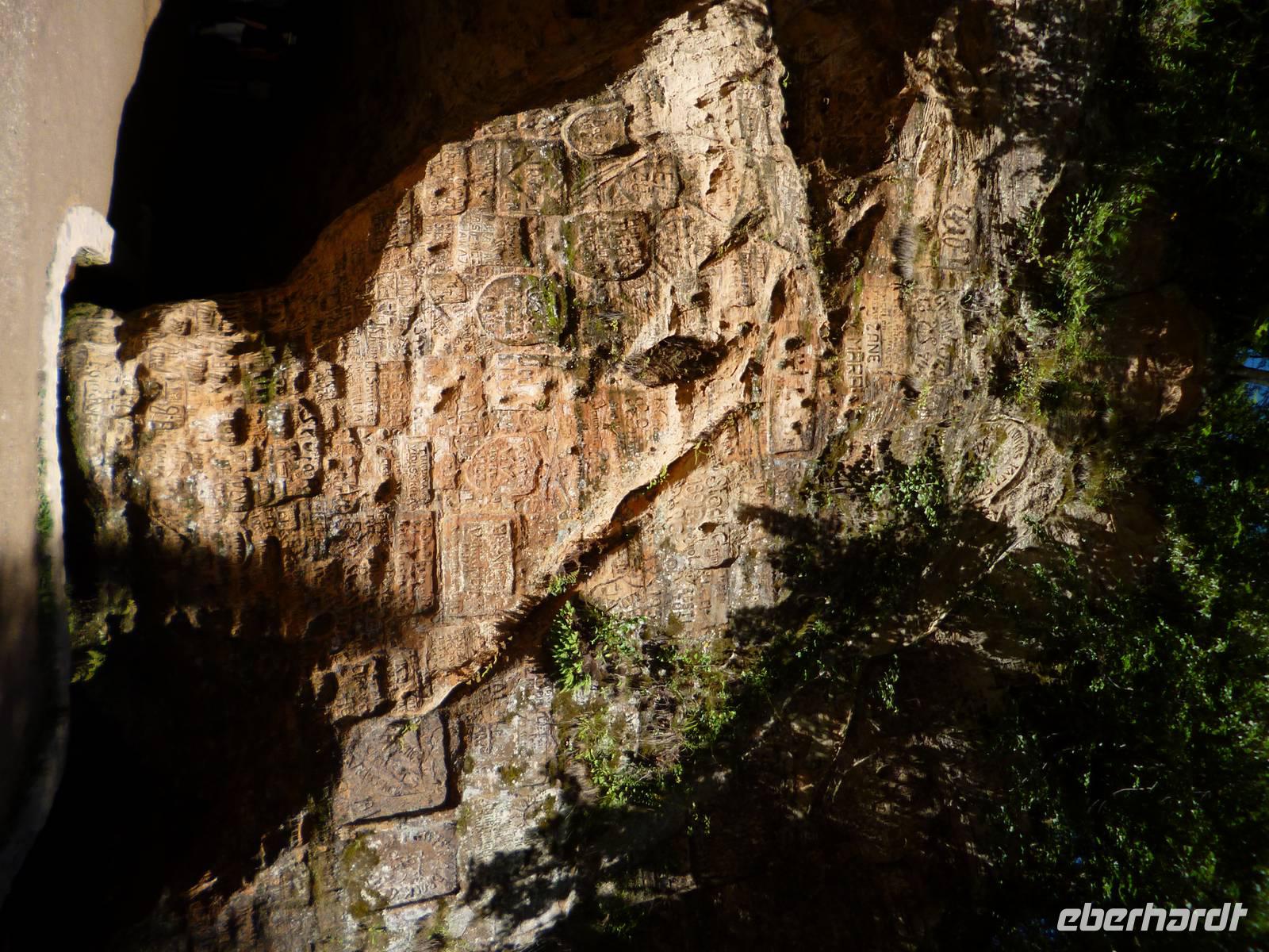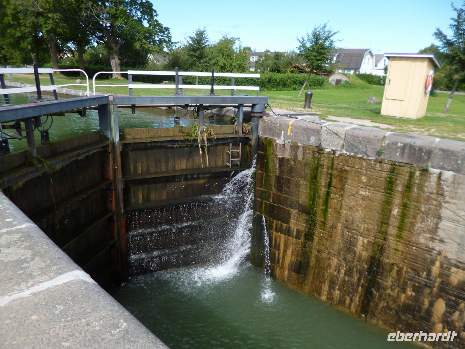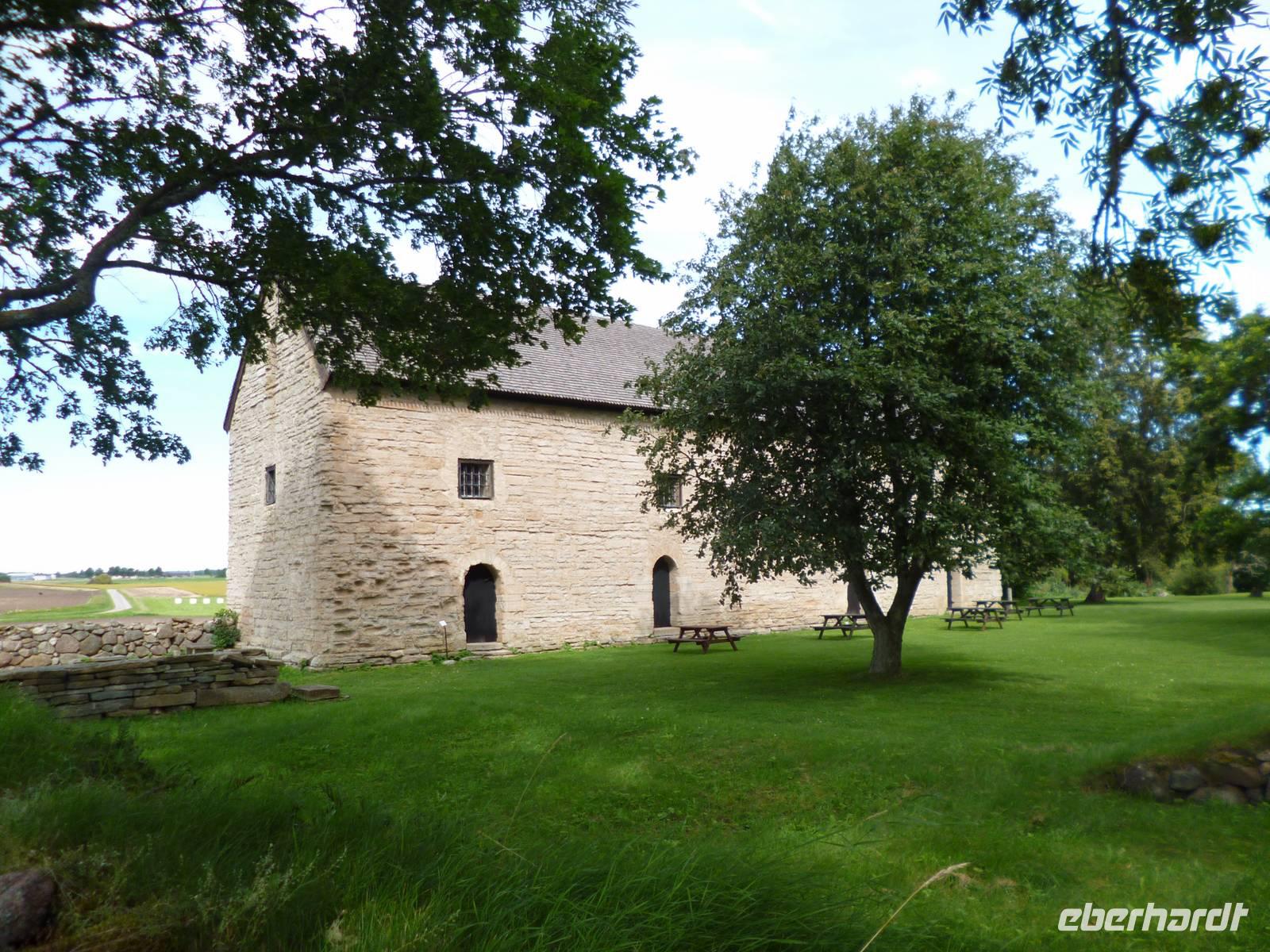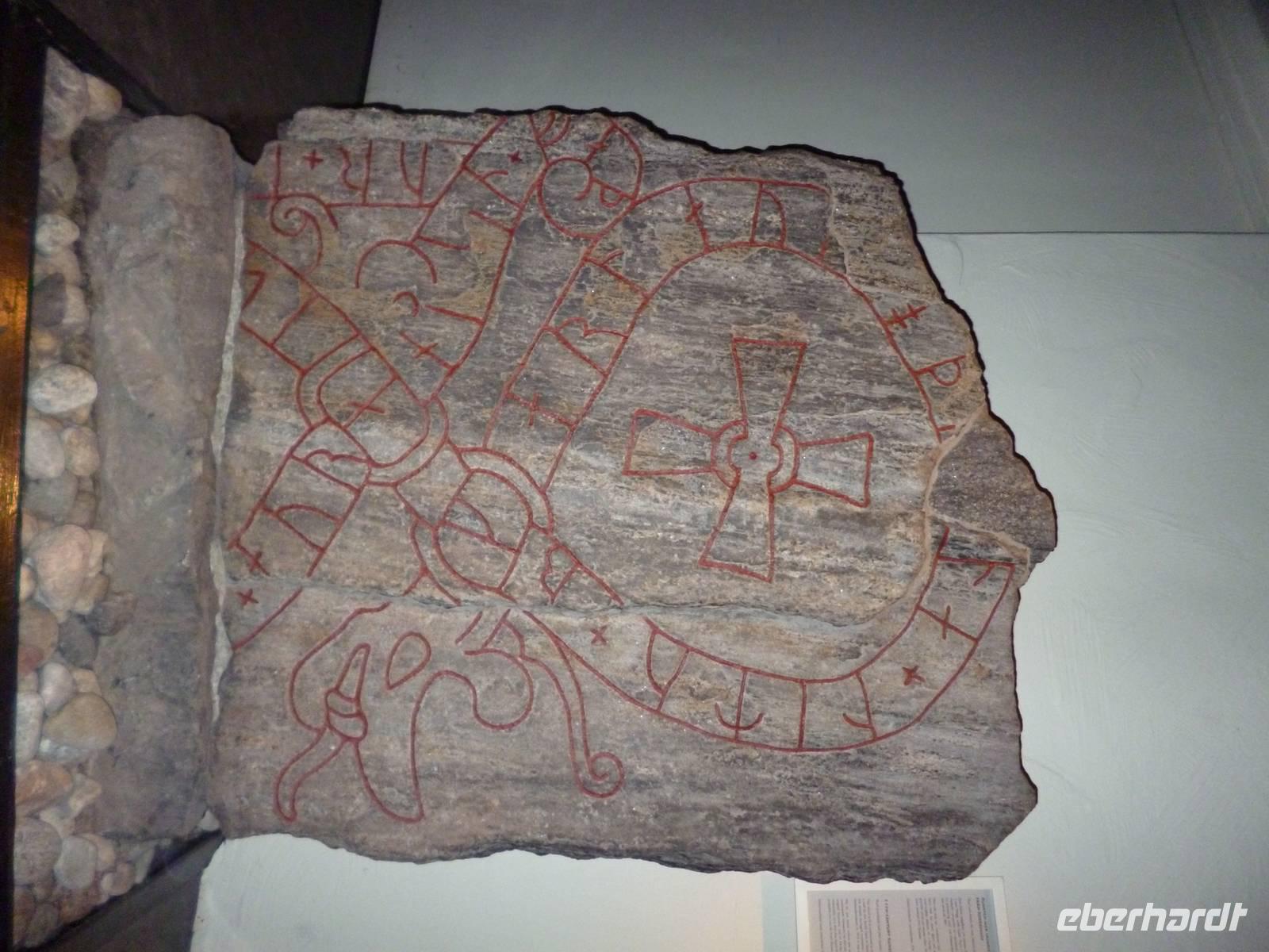 Unweit davon besuchten wir noch ein nahe gelegenes Schleusensystem am Götakanal, der Stockholm mit Göteborg, die Ostsee mit dem Kattegatt verbindet. Die nächste Pause galt dem Runenstein von Rök. Er ist einer der etwa 2.000 schwedischen Runensteine und steht bei der Kirche von Rök in der Gemeinde Ödeshög, hat eine Höhe von 3,82 Metern und trägt eine Runeninschrift in altnordischer Sprache. Sie ist mit rund 750 Zeichen die längste bekannte Runenschrift. Errichtet wurde der Stein vermutlich im frühen 9. Jahrhundert und 200 Jahre später im Zuge der Christianisierung in die Zehntscheune des Ortes eingemauert. Als 1840 die alte Kirche abgerissen wurde, bemerkte man die Runeninschrift auf dem Stein, mauerte ihn aber trotzdem in die Vorhalle der neuen Kirche ein. 1862 nahm man ihn heraus und stellte ihn zunächst frei im Kirchhof auf, bis er 1933 mit einem Dach geschützt wurde.