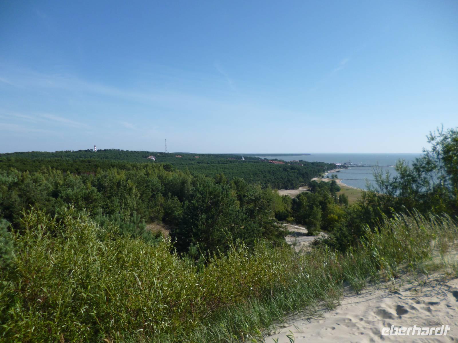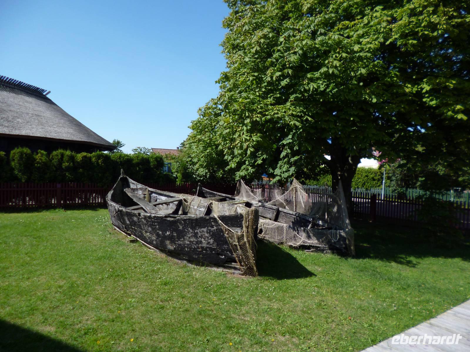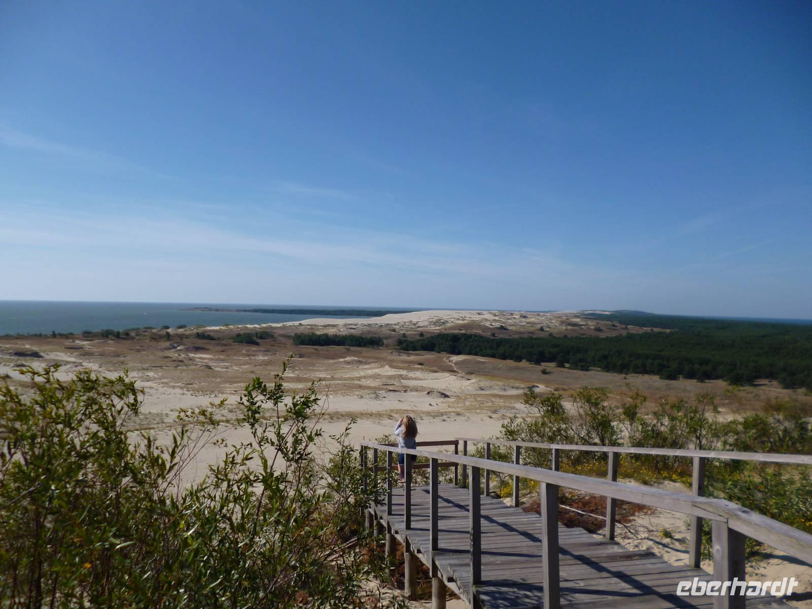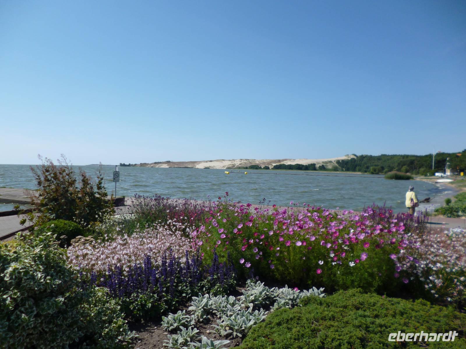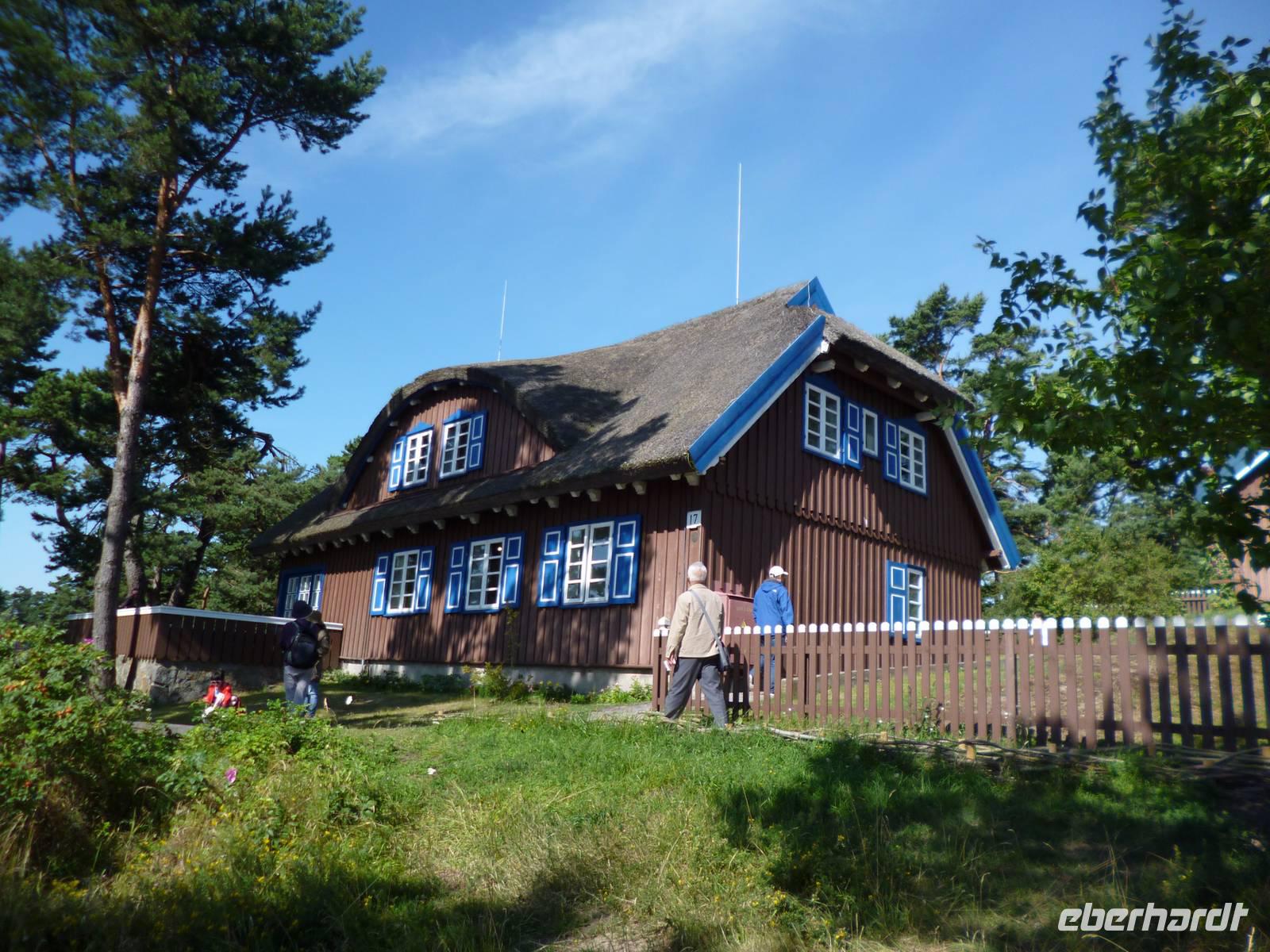 Nach dem leckeren Frühstück fuhren wir in den Stadthafen zur Fähre auf die kurische Nehrung bis nach Nidden oder Nida. Hier erklommen wir zuerst die fast sechzig Meter hohe Düne, die an der Ostsee ihresgleichen sucht. Dann fuhr uns der Bus zum idyllisch gelegenen Sommerhaus von Thomas Mann, das der Schriftsteller sich 1929 vom Geld seines Nobelpreises in ortstypischer Bauweise erreichten ließ. Nur drei Sommer verbrachte die Familie Mann hier, dann emigrierte sie über die Schweiz in die USA. Vom Hügel mit dem Adriablick schlenderten wir ins Ortszentrum von Nidden und sahen die ersten hölzernen Fischerhäuser mit den bunten Kurenwimpeln, gingen auf den alten Friedhof mit den Kurenbrettern als Grabstein und konnten erste Mitbringsel, meist aus Bernstein, erstehen.
